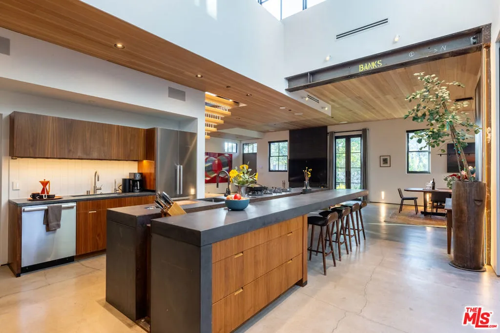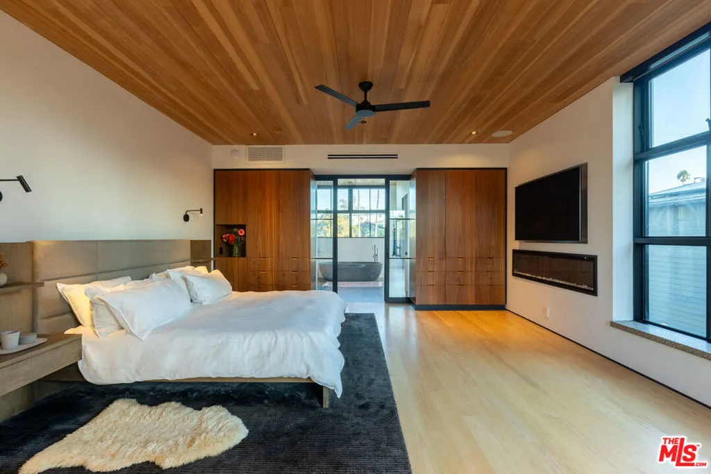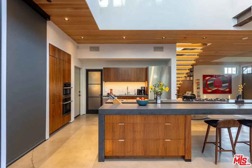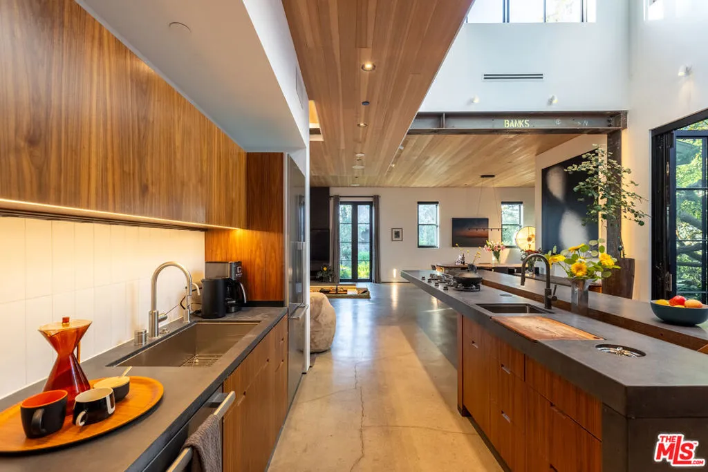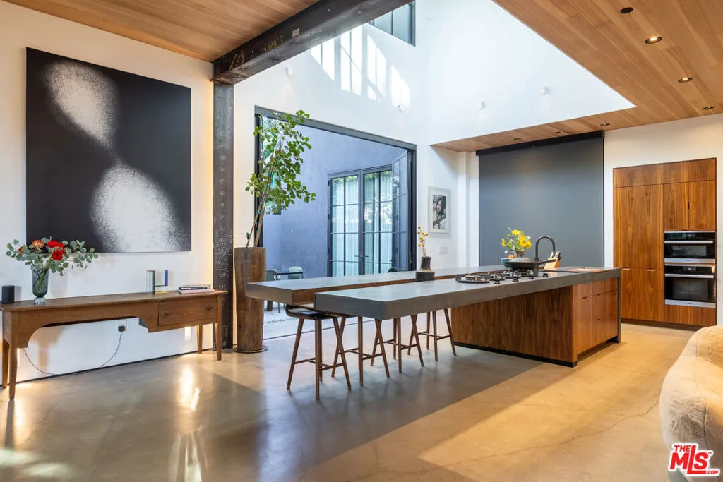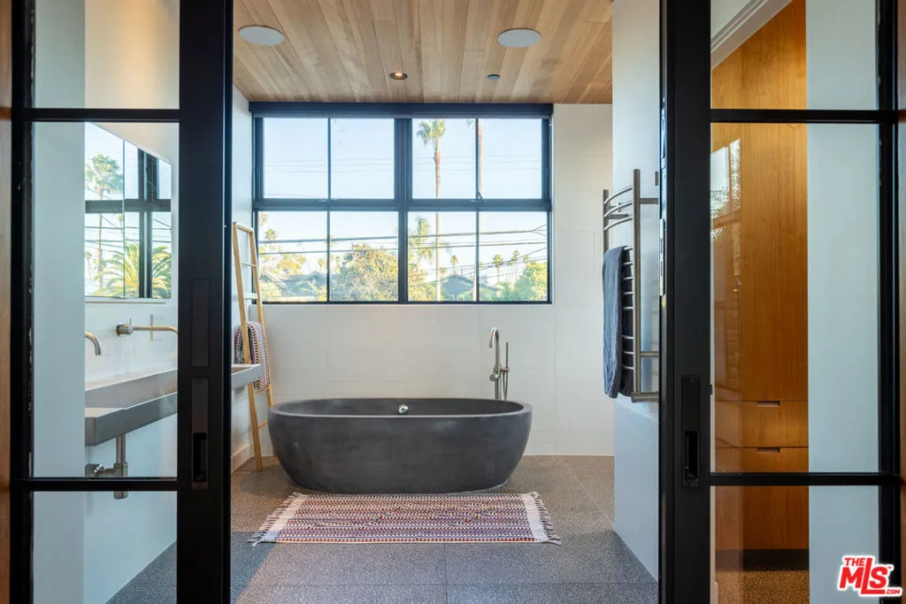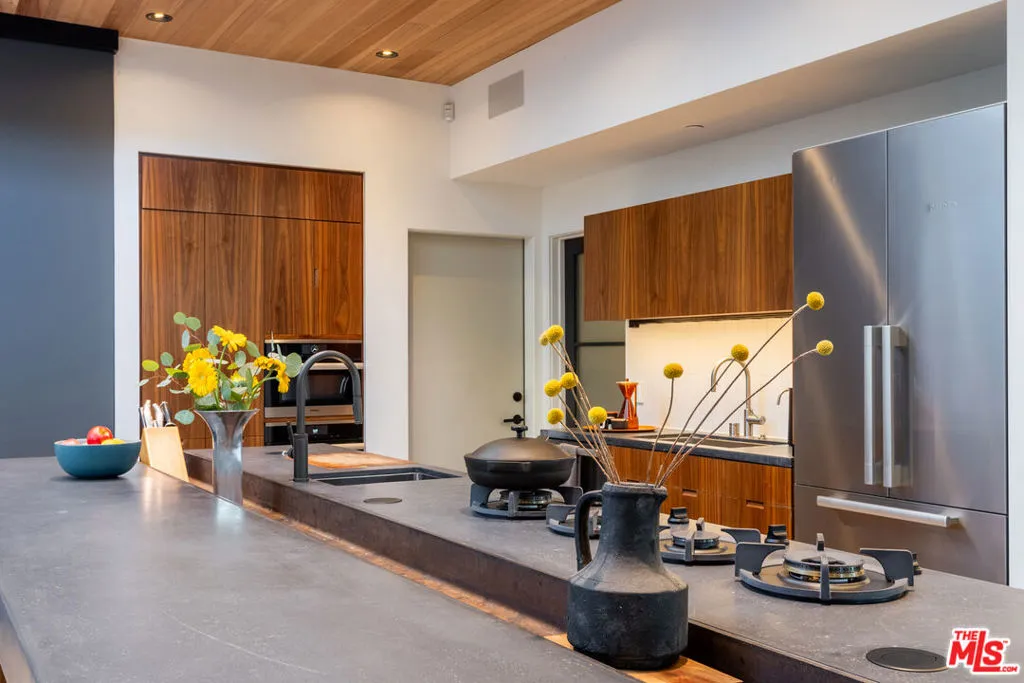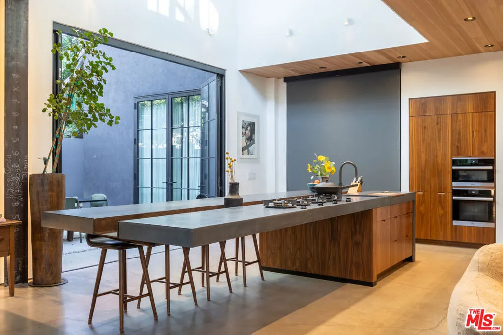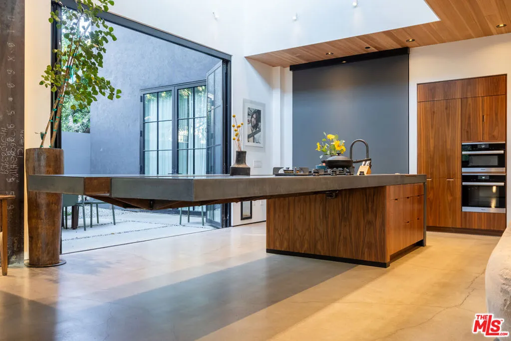 Available for a short term Summer rental June 16th - July 17th. Discover a retreat unlike any other rental on the market, have an opportunity to lease one of the finest homes in Venice, a home that is fully furnished, finished, and stocked completely to the highest level of the homeowner's custom specifications. 746 Marco Pl built in 2022 and designed by acclaimed Architect Robert Thibodeau is a contemporary sanctuary located on the best block of the premier Walk Street of Venice. Just a short stroll away from all that Venice offers, Abbot Kinney Blvd shops and restaurants, Venice Canals, Venice Beach, Lincoln Blvd, and Erewhon just a few blocks away yet still set in a way to enjoy the tranquility and privacy the home offers. The property's lush grounds designed by Landscape Architect Russ Cletta resemble a "California meadow butterfly garden" feature local vegetation, a serene pond with fish and water lilies, mature trees, and multiple outdoor sitting and dining areas to enjoy Southern California's year round lovely weather. The home's Japanese Shou Sugi Ban exterior blends seamlessly with its natural surrounding every room in the home opens to and accesses the outdoors with views of the embracing foliage. Haute sophisticated design meets natural comfort best describes the interior spaces. The open living space features, 11 foot ceilings, radiant heated concrete and ash wood floors, a floating staircase, fir wood ceilings, a sunken conversation pit in the living room with a Ligne Roset Togo sofa, walnut custom cabinetry, exposed steel beams, and double-glazed large windows and French doors allows abundant natural light. The heart of the home is the double volume kitchen featuring the custom 15-foot cantilevered kitchen island, Meile appliances, and seamless access to both the large formal dining room or the well lit courtyard dining area. Each of the three bedrooms offer direct access to private balcony spaces or a patio. The primary bedroom offers two closets, en-suite bathroom with a concrete soaking tub, a walk in shower, and radiant heated floors. The expansive roof deck centered around a statuesque olive tree offers a pergola covered full outdoor kitchen and barbecue area with dining table, multiple seating areas with a fire pit, and high end outdoor surround sound system for entertaining while enjoying the amazing sunset and panoramic views LA has to offer. Other notable features are Lutron lighting system, high speed internet / wifi indoors and outdoors, Apple TV, built in speakers, alarm system, central heating and A/C, surfboard racks, an outdoor shower, four car exterior driveway parking. Make 746 Marco Place your serene / stylish home away from home and experience the quintessential Venice lifestyle in unmatched luxury.