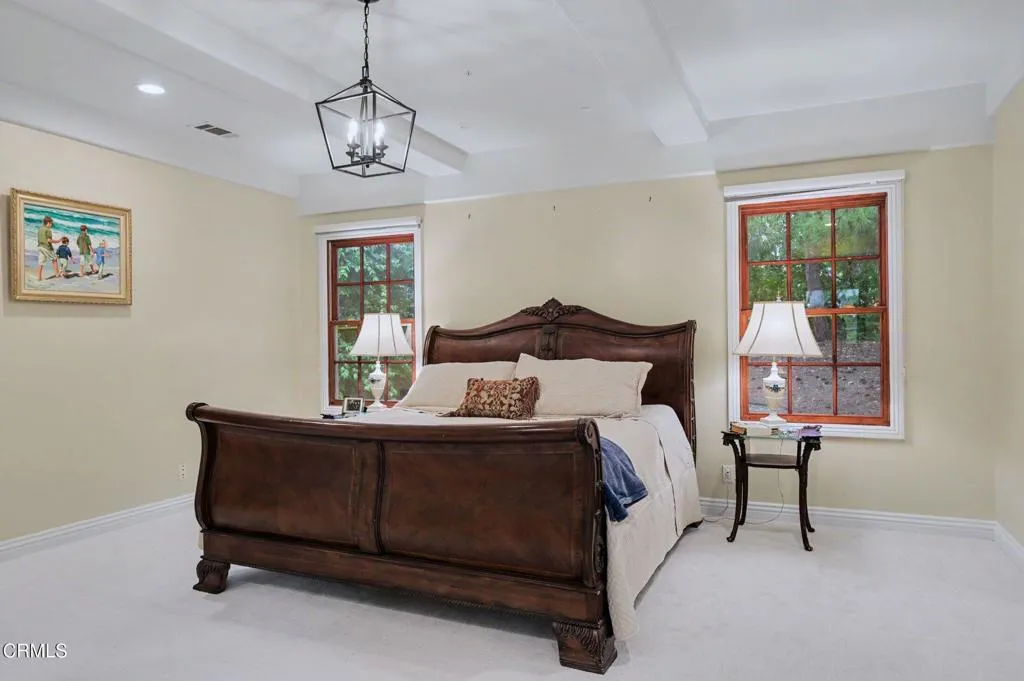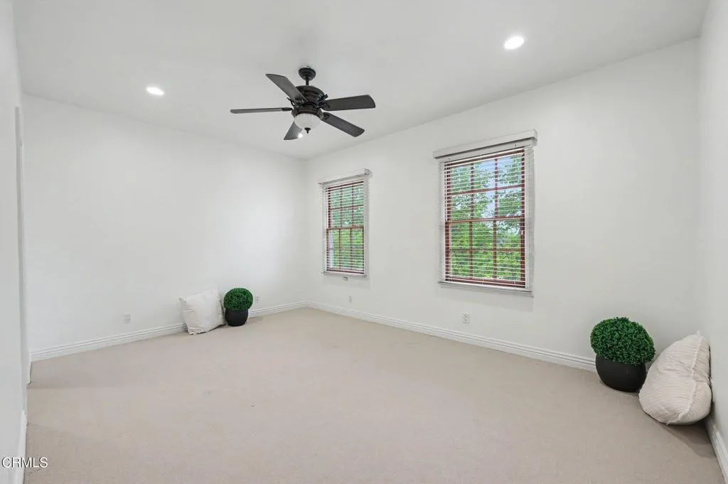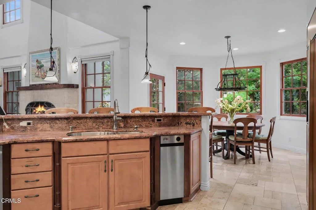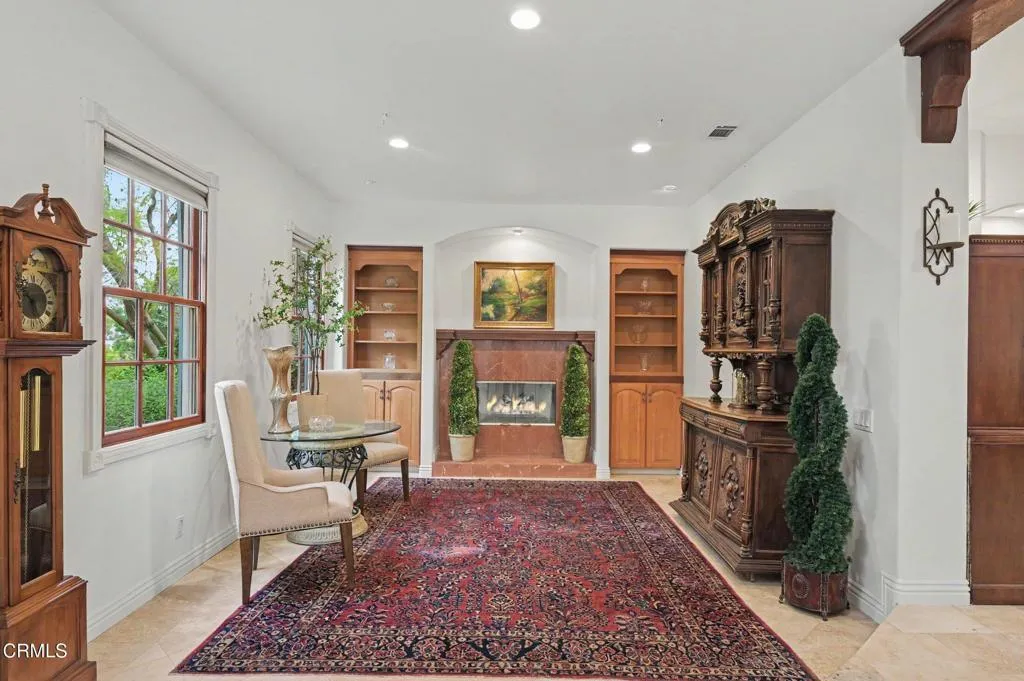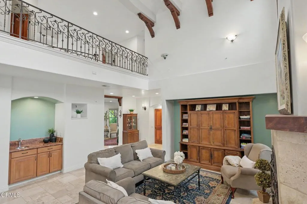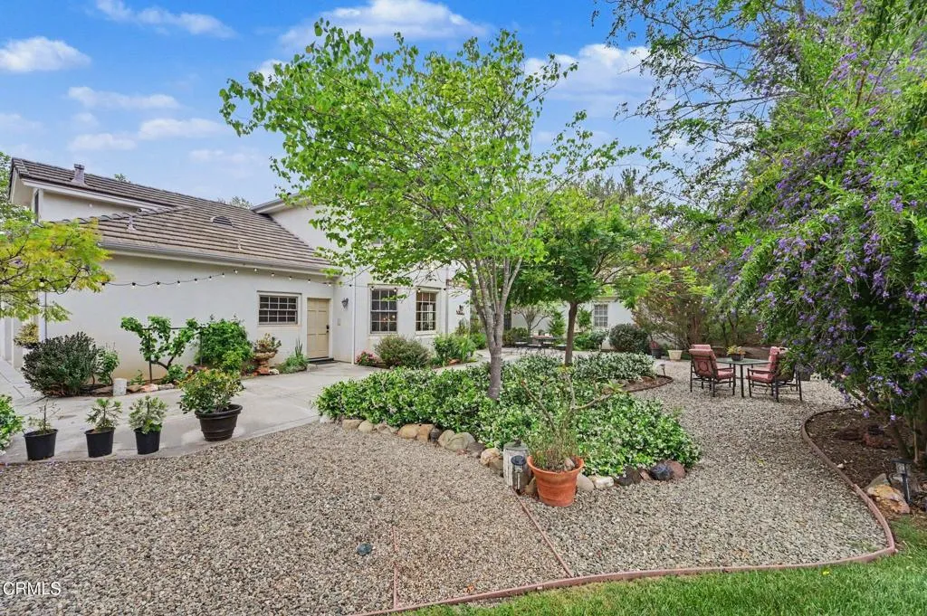 This extraordinary 5 bed, 4.5 bath custom estate is located on over an acre of land in Bella Vista, one of Ventura County's most desirable gated communities. Designed with both flexibility and everyday living in mind, the home features a highly sought-after primary suite on the main level, along with a spacious downstairs family room, office, and laundry room, ideal for single-level living if desired. The primary suite includes its own fireplace, dual walk-in closets, and an en-suite bath with custom vanities and a Jacuzzi tub. The lower level showcases a dynamic, open-concept layout with a double-height vaulted family room that flows into the kitchen. The kitchen features a large breakfast bar with seating for four, a breakfast nook, ample storage, and a walk-in pantry, and connects to the formal dining room overlooking the front landscaping. A separate formal living room with a fireplace provides an additional gathering space. Upstairs, four additional bedrooms are complemented by a versatile loft-style bonus space, perfect for a playroom, office, or additional lounge area, complete with its own window and generous attic storage.Outside, the grounds are a standout feature, with mature landscaping and a variety of fruit trees blooming for your enjoyment. The backyard includes an extensive built-in barbecue area and a large open space that can accommodate a pool, spa, pickleball court, or outdoor events. The property includes both an attached two-car garage and a detached two-car garage, offering flexibility for additional parking, a workshop, or office space. A circular driveway and mature front trees enhance both privacy and curb appeal. Lime, lemon, pomegrante, apricot, apple, champagne grapes, orange, artichokes, and figs make this a gardener's paradise. Located in Camarillo, Bella Vista offers convenient access to nearby golf courses including Las Posas Country Club, Sterling Hills, and Spanish Hills, as well as easy access to both Los Angeles and Santa Barbara.With fewer than 100 custom homes in this community, Bella Vista offers a rare sense of privacy, tranquility, and timeless appeal. Offered for the first time since its original construction, this home presents a unique opportunity in a highly sought-after community.
