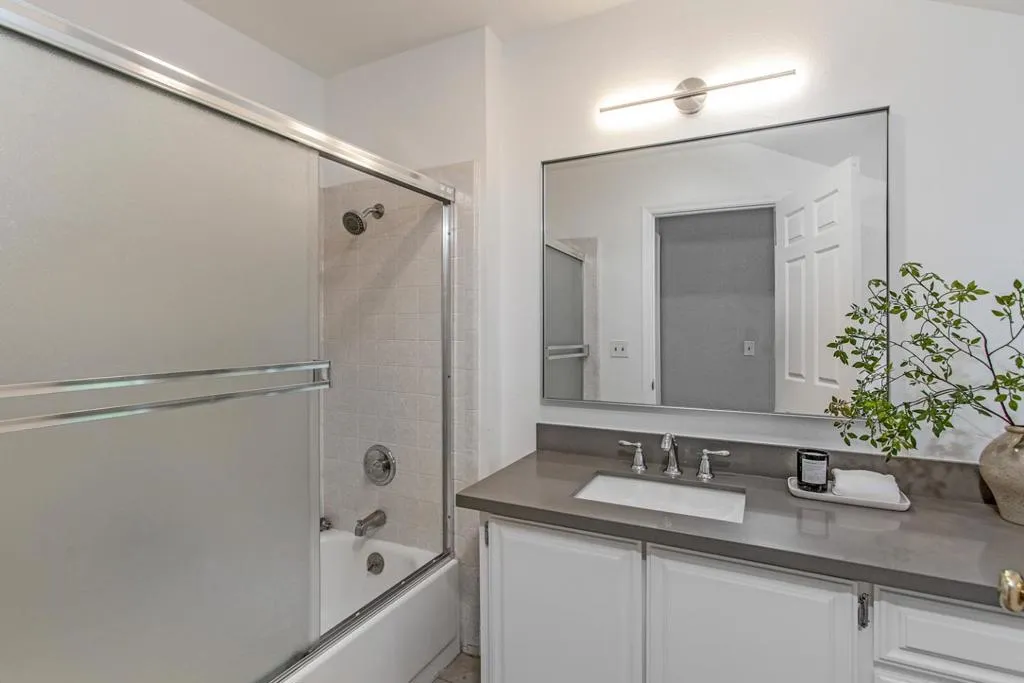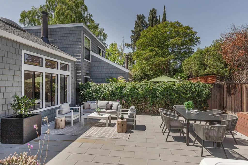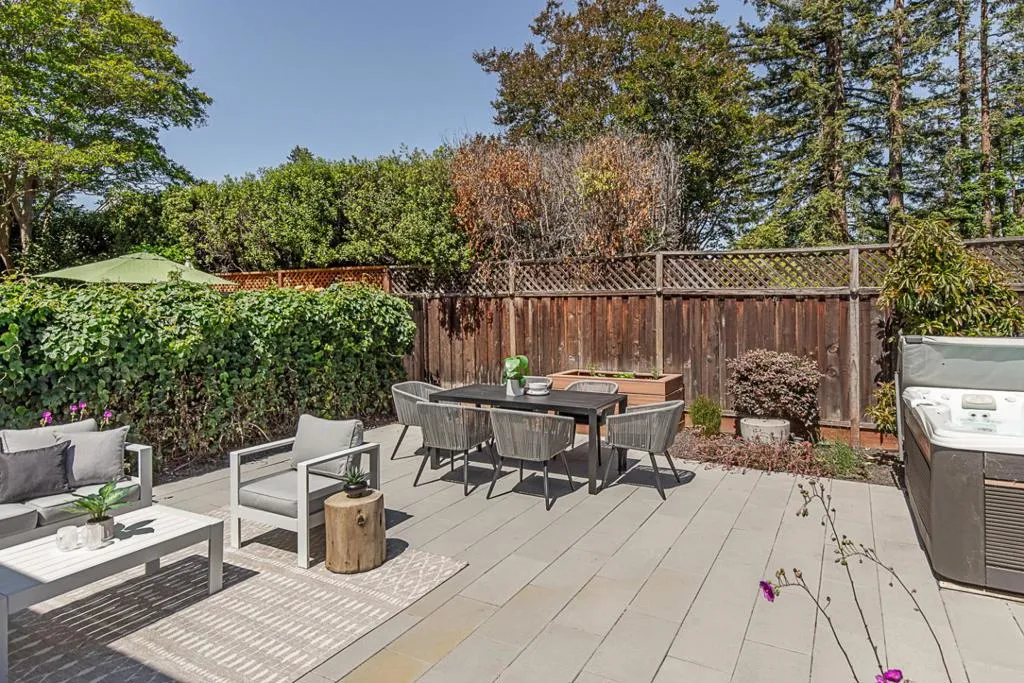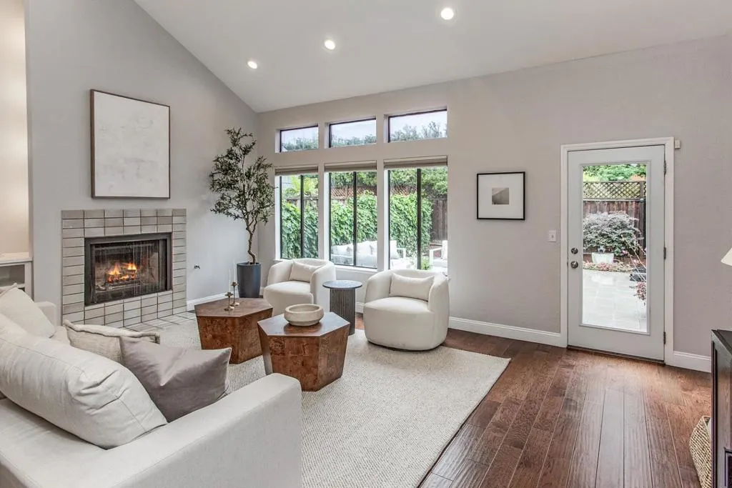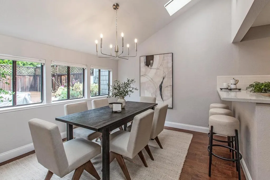 Enjoy lofty ceilings, a functional floor plan, numerous skylights, and a light and bright atmosphere in this updated two-story townhome. The living room has soaring vaulted ceilings, a focal-point fireplace, and tall windows overlooking the yard. Sitting between the living room and the kitchen for easy entertaining, the dining room is illuminated by large windows. The kitchen features abundant cabinetry, stunning white quartz countertops, elevated bar seating, and a large pantry. The primary suite features high ceilings, three large closets, and a beautifully updated en suite bath. Upstairs, you have two well-sized bedrooms with easy access to the hall bathroom. For alfresco enjoyment, you have a large concrete paver stone patio and hot tub surrounded by mature plantings, a raised garden bed, and sleek planters. Detached one-car garage, plus ample guest parking. Located in the desirable Los Arboles community with a pool and well-maintained grounds. Steps to Gemello Park, and close to shopping, dining, commute routes, and both downtown Mountain View and Los Altos.