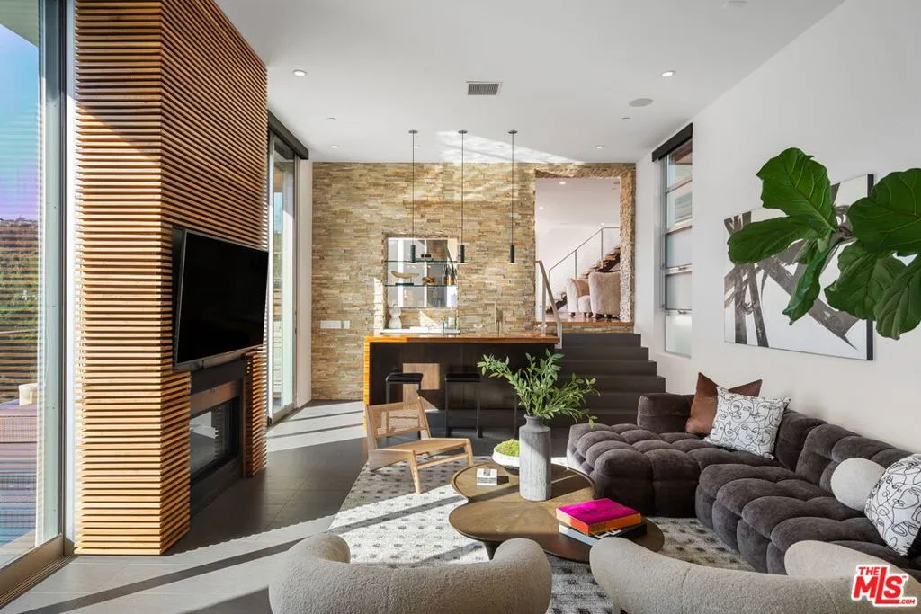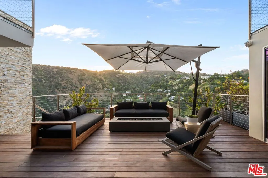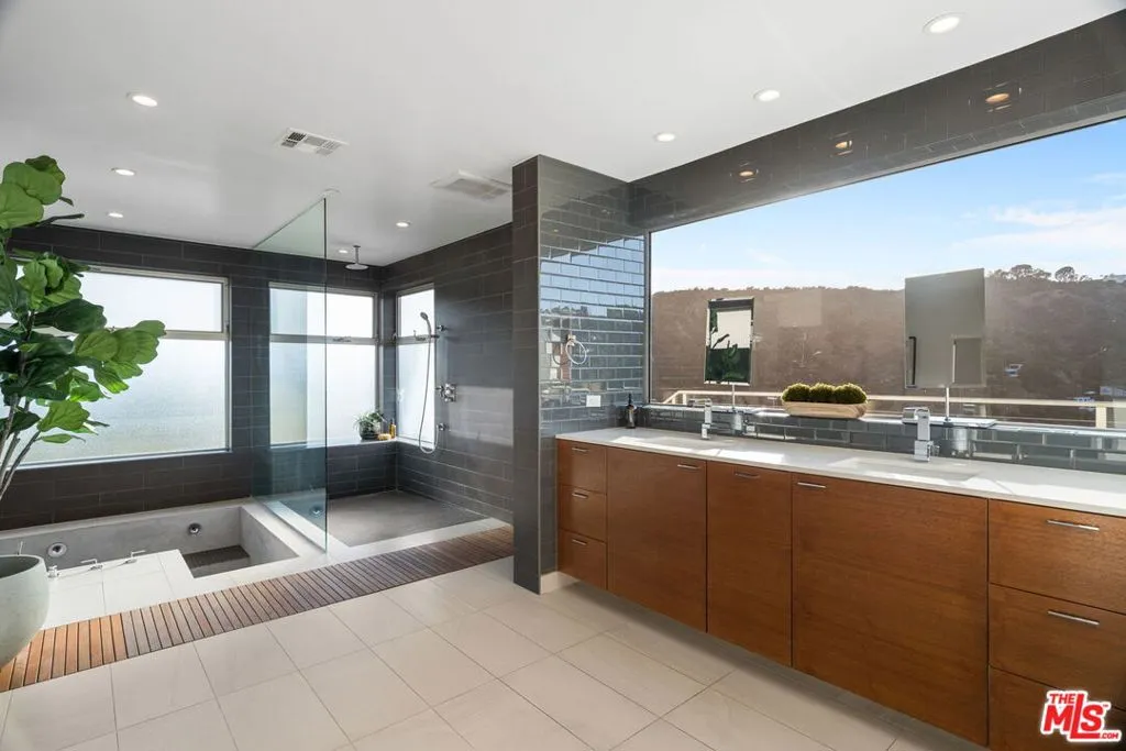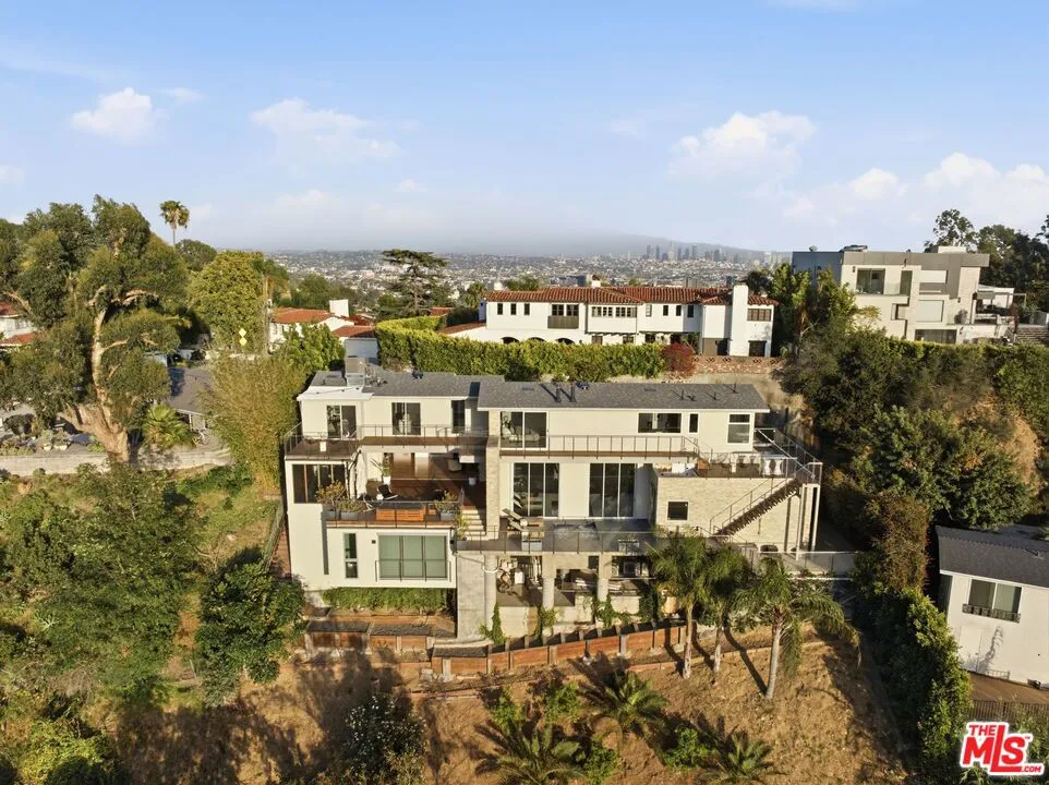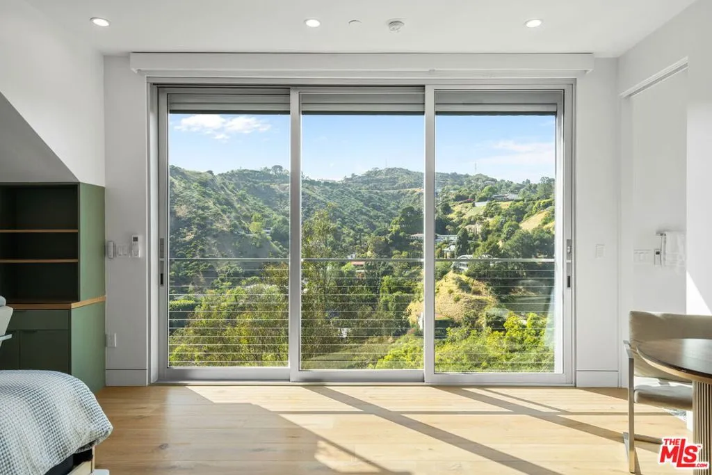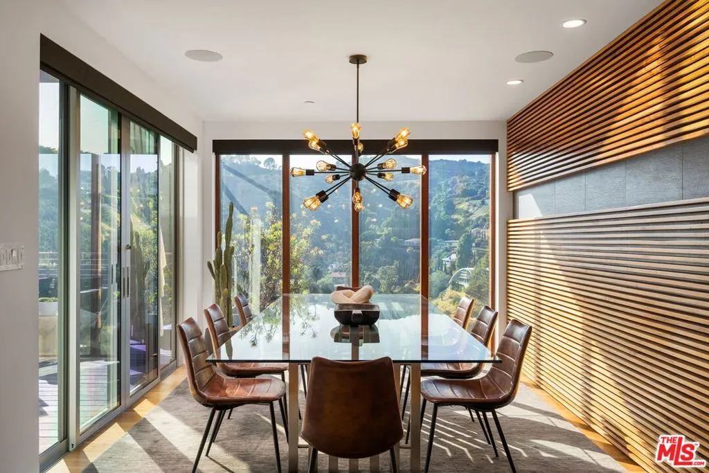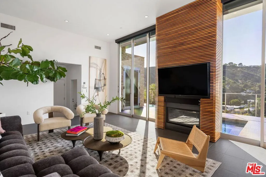 Positioned high above the canyon in the Hollywood Hills, this striking contemporary residence delivers the scale, presence, and seamless indoor-outdoor lifestyle expected at the upper tier of the market. Architecturally intentional in its design and further elevated by the current owners through targeted enhancements, the home offers a level of livability and entertaining capacity that meaningfully distinguishes it from its peers. Walls of Fleetwood stacking and pocketing glass sliders define the experience, dissolving boundaries between interior living spaces and expansive terraces that capture sweeping canyon views from nearly every room. A six-panel Fleetwood system at the main level disappears entirely, transforming the home into a true extension of its surroundings and creating a resort-like environment equally suited for intimate evenings or large-scale gatherings. The dining room, anchored by a custom inlaid wood panel wall, sits at the edge of home featuring floor-to-ceiling windows that create the sensation of floating above the canyon while you dine. Across the home in the media room, complete with a built-in bar and dramatic high ceilings, this same custom woodwork, paired with integrated slate finishes that extend from inside to out, introduces warmth and permanence grounding the modern architecture in a refined, timeless material palette. The media room, complete with a built-in bar and dramatic openings, serves as a central entertaining hub with direct access to the sunken plunge pool and spa, as well as the surrounding decks. A newly added steam room introduces a spa-caliber experience, positioned with direct access to the main deck and oversized hot tub designed to function as both a rapid-heat spa and a cold plunge. The transition between these elements creates a cohesive indoor-outdoor wellness environment. From the spa level, an exterior staircase leads directly to the primary suite, where a Japanese-inspired soaking tub and expansive walk-in rain shower complete the experience. Outdoor living has been executed with precision and intention. Multiple terraces, a high-output fire pit, and ceiling mounted heating elements allow for year-round usability of the outdoor spaces. A professionally installed motorized retractable screen system encloses the large Fleetwood openings at the touch of a button, preserving the open-air experience while enhancing comfort, climate control, and functionality for the days you prefer to stay inside while still taking in the fresh breeze. Smart home integration implemented by the current owners includes Lutron lighting, distributed audio, MyQ garage control, AquaLink spa management, ADT security hardware, numerous closed circuit security cameras, DoorBird, Shade Store motorized shades, and four-zone climate control (two gas and two electric systems). Additional upgrades include tankless water heaters, a new roof (2025), Toto heated bidet toilets on both levels, custom garage cabinetry, and multiple 220V charging outlets. Completed in 2023, the ADU expands the property's functionality with a separate entrance, full kitchen, laundry, and a 120-inch 4K projection system. A three-panel Fleetwood sliding panel system with a motorized retractable screen connects the space to the outdoors seamlessly, creating a flexible, design-forward environment ideal for guests, extended stays, or income potential. Both the main kitchen and the ADU feature Wolf and other luxury appliances and Fisher & Paykel dual-drawer dishwashers, reflecting a consistent level of finish throughout. The ADU further includes its own washer and dryer along with a full-size EuroCave wine refrigerator. With its combination of architectural scale, premium materials, and thoughtfully executed enhancements, this residence offers a level of presence, functionality, and experiential living that firmly supports its position within the upper echelon of the Hollywood Hills market.