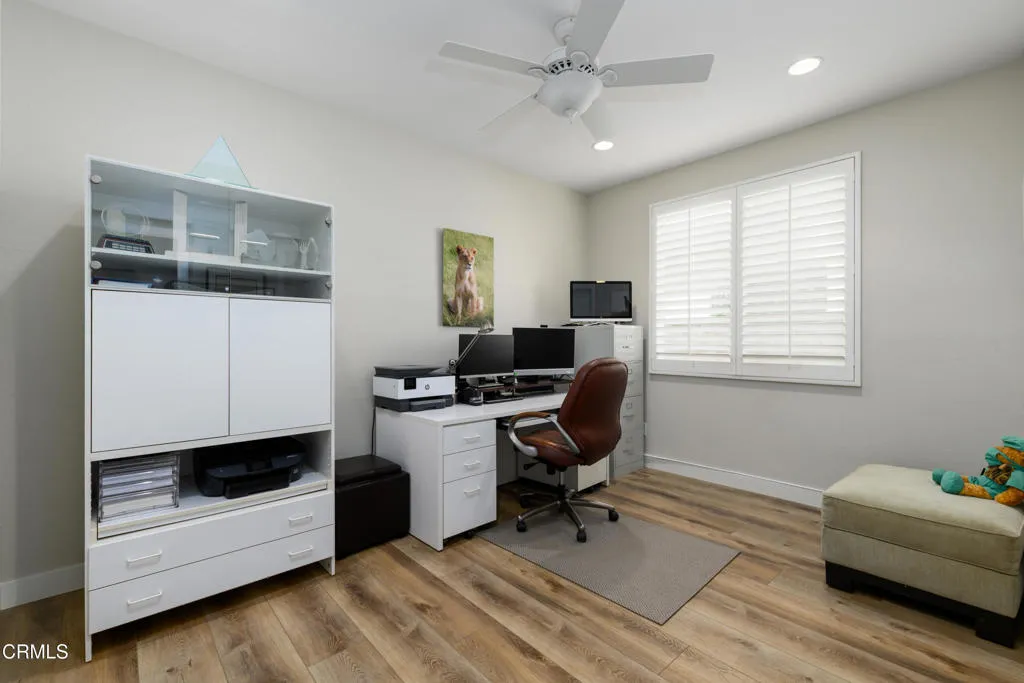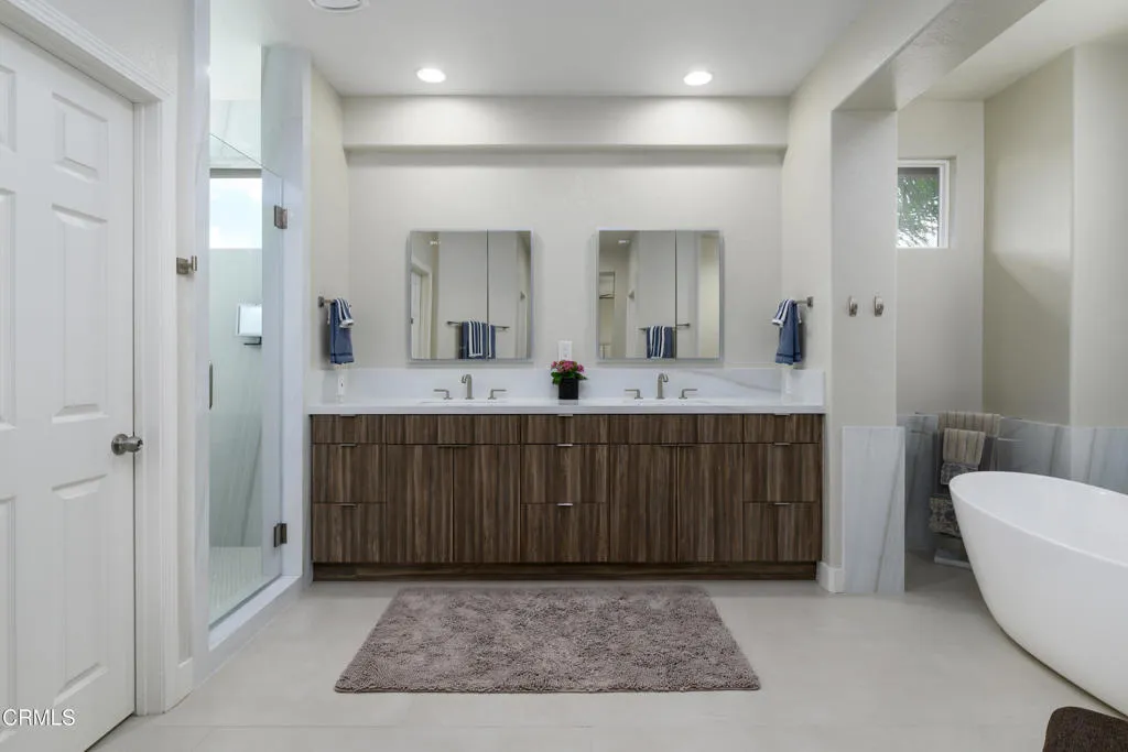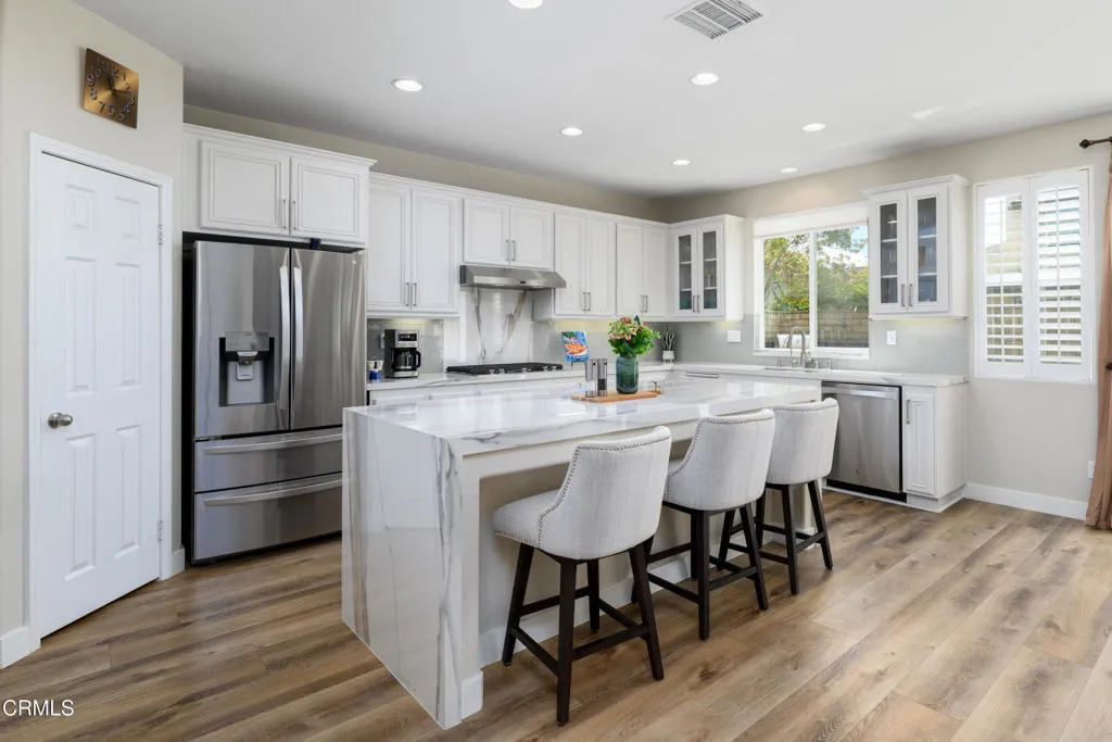 This home feels as good as it looks, thoughtfully reimagined with a refined, modern aesthetic and a comfortable, cohesive sense of ease.Natural light fills a beautifully connected main level designed for both everyday living and entertaining. The living and dining areas sit side by side, while the kitchen and family room offer a more relaxed setting just beyond. Sleek, modern finishes bring a clean, contemporary edge, continuing into the family room where the fireplace and custom media wall create a striking, seamless focal point. It's a space that invites you to settle in. A sliding glass door, added in recent years, enhances the connection to the outdoors and brings in even more light.Upstairs, the primary suite is generously sized and serves as a true retreat, anchored by a remodeled ensuite bath with designer finishes, a spacious walk-in shower, separate soaking tub, private water closet, and two walk-in closets. An additional ensuite bedroom provides comfort and privacy, while a third bedroom is served by a well-appointed hall bath. The loft offers flexible bonus space--ideal as a media room, gym, or playroom--and can be converted into a fifth bedroom if desired. Newer carpet throughout the upper level adds a fresh, move-in-ready feel.Downstairs, a fourth bedroom is ideal for guests, a home office, or multi-generational living. The adjacent powder room offers space for a future shower addition. A dedicated laundry room with additional storage and a two-car garage add to the home's everyday functionality.The backyard is designed for enjoyment, featuring a built-in BBQ, custom tile details that carry into the surrounding planters, and a manicured lawn. In the evening, the firepit and thoughtfully placed landscape lighting create a warm, inviting atmosphere.Pride of ownership is evident throughout, with thoughtful updates and careful maintenance. Village at the Park offers parks, resort-style pools, fitness centers, and a vibrant sense of community, all close to schools, shopping, and everyday conveniences.This is more than a home, it's a place to settle in, spread out, and enjoy.