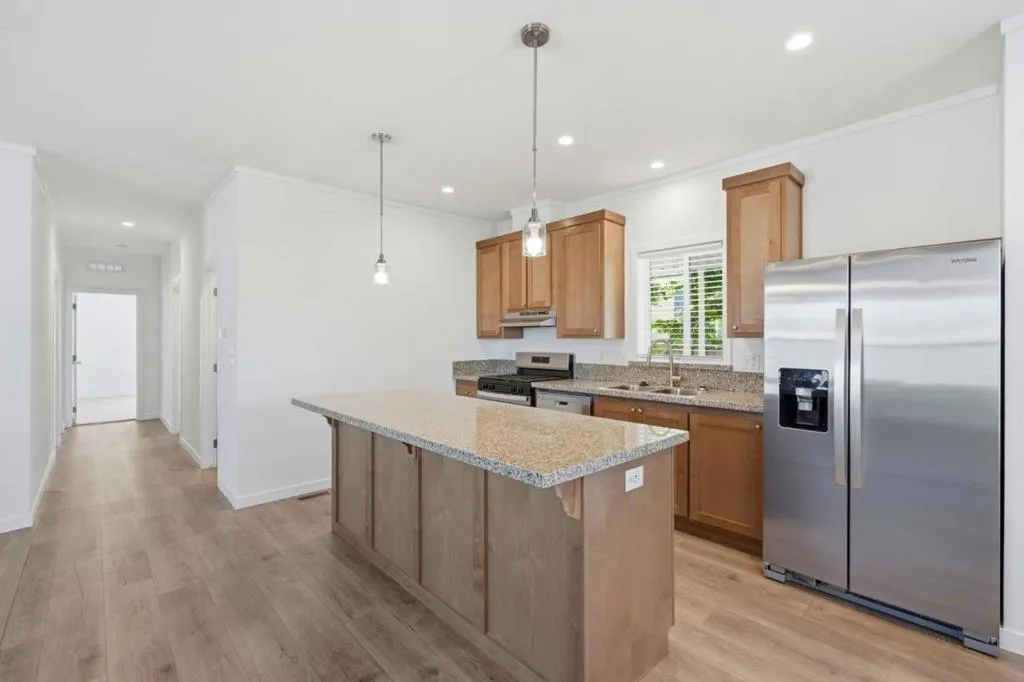 Located in Bay Point, and just one mile from the Pittsburg/Bay Point BART Station, this NEW 3-bedroom, 2-bathroom Mobile Home offers 1,400 Sq.Ft. of thoughtfully designed living space, combining modern finishes with exceptional affordability. With an incredibly low space rent of just $828/month, this is one of the best value opportunities in the area. The open-concept layout seamlessly connects the kitchen and family room, creating an inviting space for daily living and entertaining. The kitchen is well-appointed with granite countertops, Stainless steel appliances, a pantry, and a central island. Both bathrooms are designed with solid surface countertops and offer a stall shower and a shower-over-tub combination for flexibility and comfort. The home is equipped with central forced air heating, along with convenient laundry hookups. Built with efficiency in mind, the home includes double-pane windows, Energy Star appliances, HVAC, and lighting, as well as low-flow showerheads and toilets with a thermostat controller delivering both comfort and long-term savings. Situated within the Pittsburg Unified School District, this home presents an opportunity to own a new property in the Bay Area at an accessible price, with significantly lower monthly costs thanks to the low space rent.
