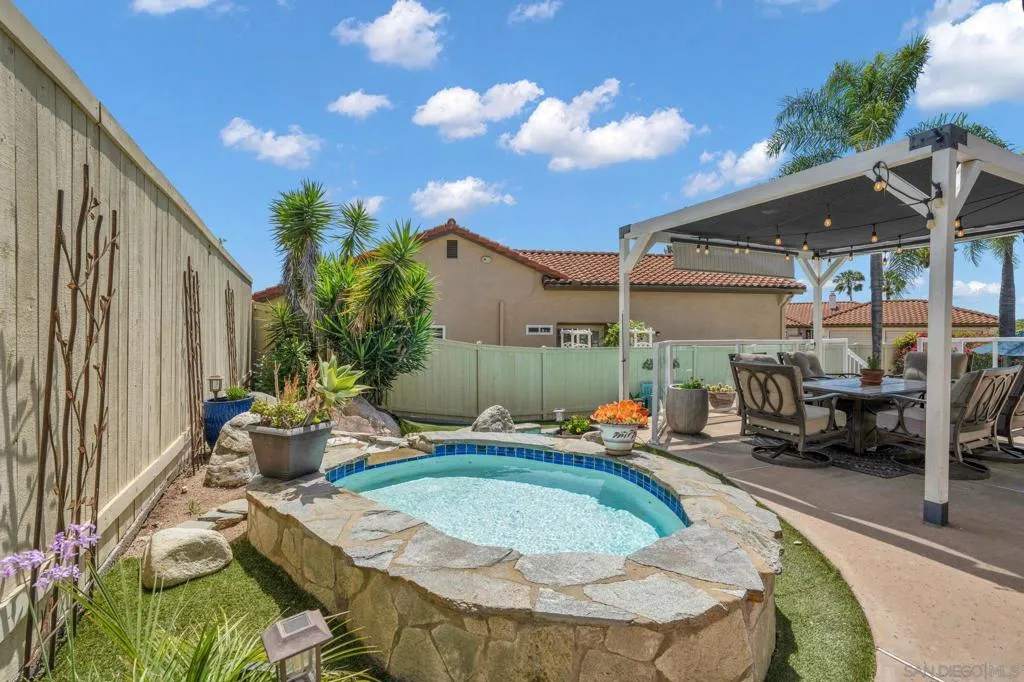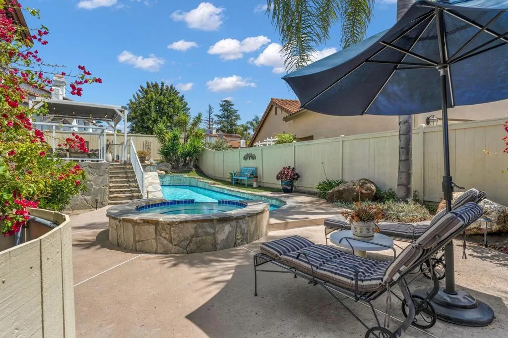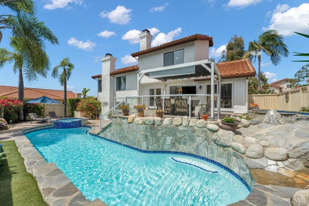 Just in time for SUMMER! Rare opportunity to buy a home in this family neighborhood of Sonata in South Escondido. This beautifully maintained home offers the perfect blend of tranquility and convenience—set above the hustle and bustle, yet just minutes from freeways, shopping, top-rated schools, Kit Carson Park, The Vineyard Golf Course, Orfila Winery and Safari Park. Proudly owned and meticulously cared for by the same homeowner for the past 29 years, this split-level residence showcases true pride of ownership throughout. The versatile floor plan features both a spacious living room and a separate family room, ideal for flexible living and entertaining. Thoughtful updates have been completed over the years, including a recently remodeled hall bathroom in 2024. Modern upgrades include owned solar, and an upgraded 200 AMP electrical panel. Step outside to your private backyard retreat, complete with a sparkling swimming pool, spa, kiddie pool, and a tranquil waterfall feature. Multiple outdoor seating and entertaining areas provide the perfect setting to enjoy San Diego’s year-round sunshine. Residents of Sonata enjoy a well-maintained community with low HOA fees, access to tennis and pickleball courts, and several neighborhood parks—making this an exceptional place to call home. Hurry this one won't last long!