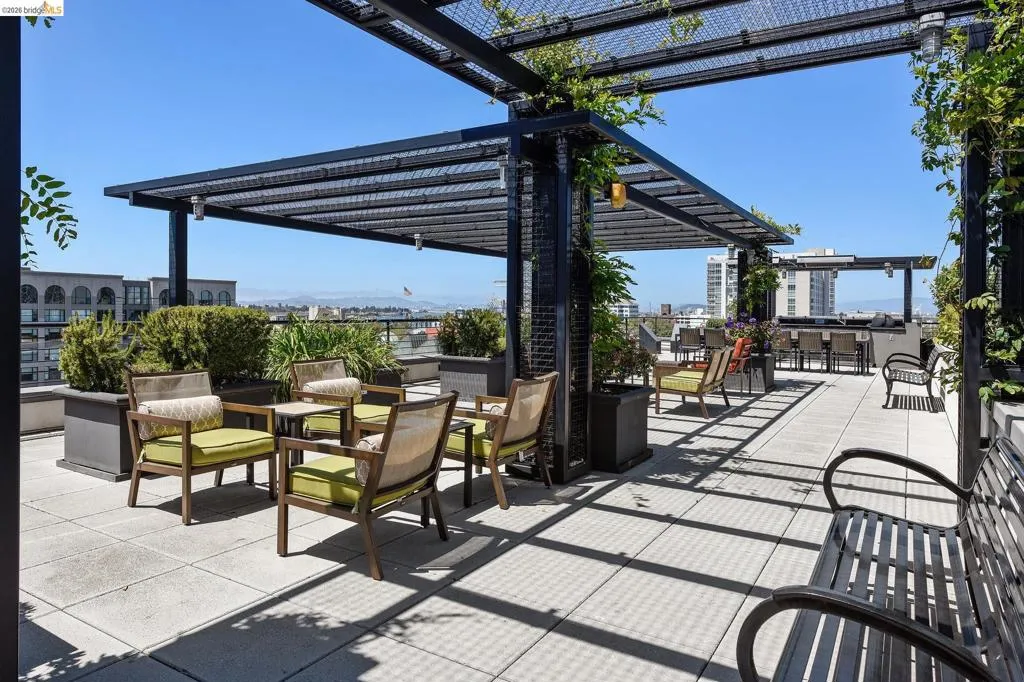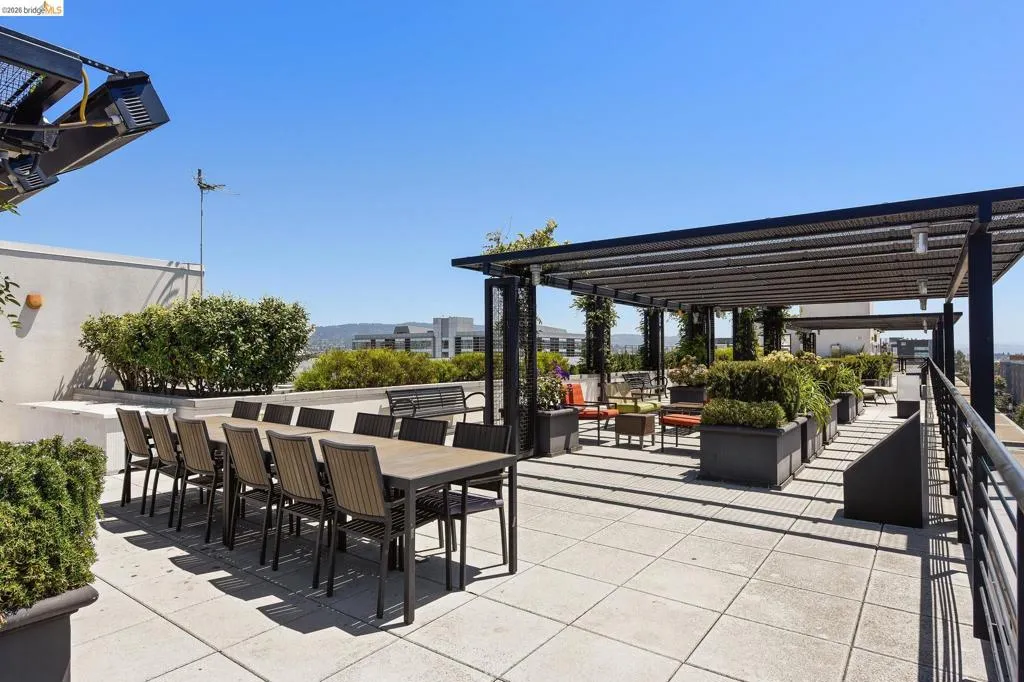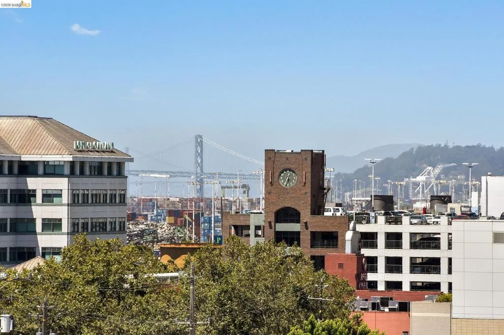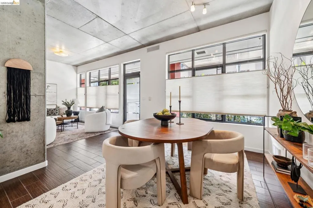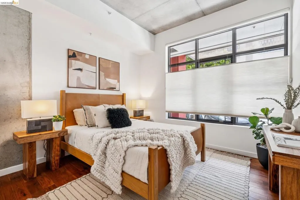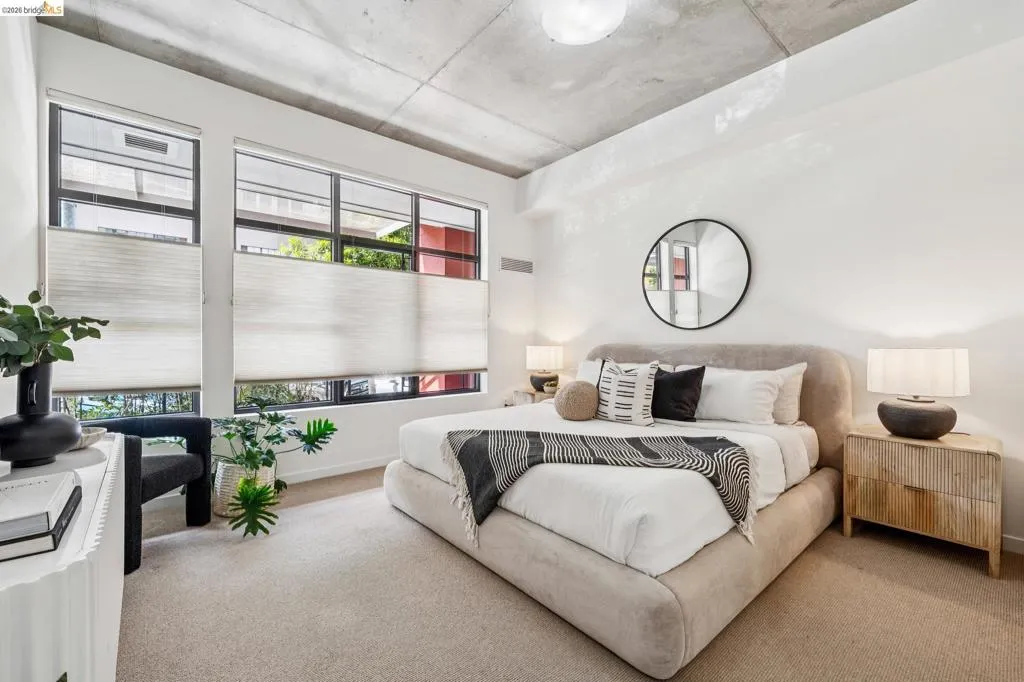 A striking blend of concrete, wood, and slate bring contrast and warmth to this light-filled, loft-style residence, where soaring ceilings and walls of glass define the space. Expansive living and dining areas connect seamlessly, creating an open environment suited for work, living and entertaining, with a sleek, well-appointed kitchen integrated into the layout. Bedrooms are positioned to provide separation and privacy, the primary bedroom has an ensuite bath. Thoughtful finishes include radiant-heated tile floors in bathrooms and a cedar-floored primary closet. The six-story building is crowned by a rooftop deck with 360° views, outdoor kitchen, and heated lounge areas. Garage parking includes a rare ground-floor space with 220V EV charger. Located in the Jack London Square district, with waterfront dining, breweries, transit.