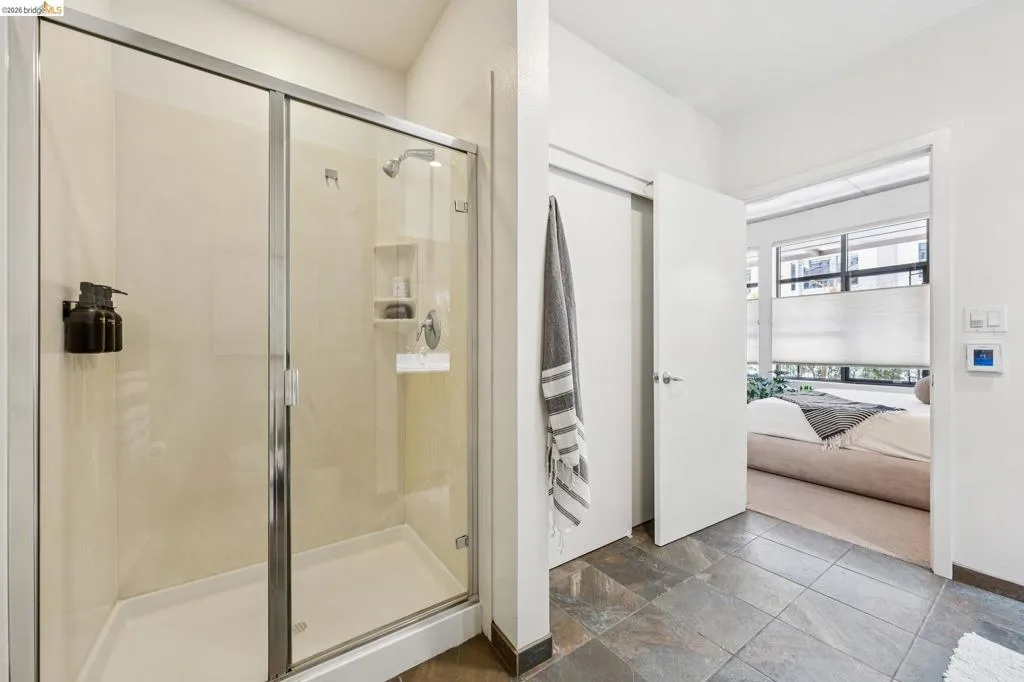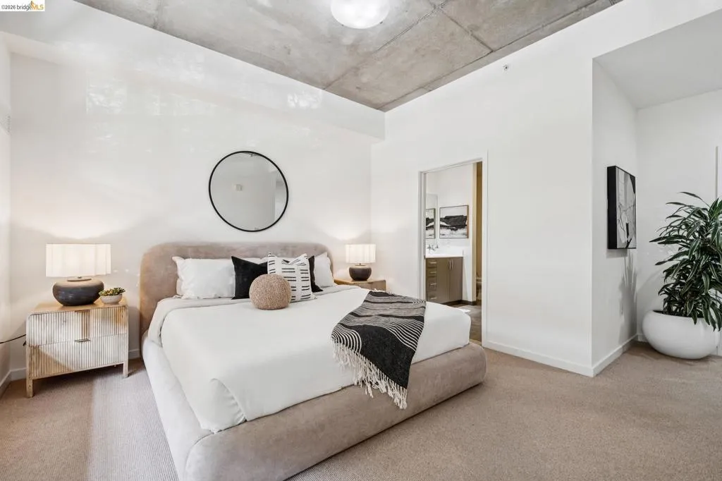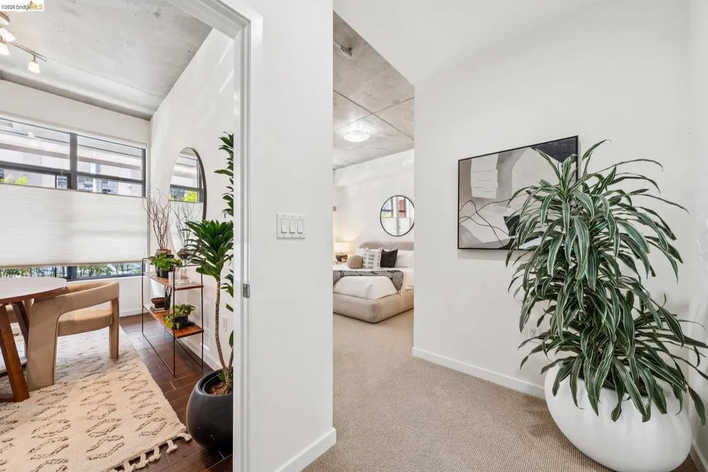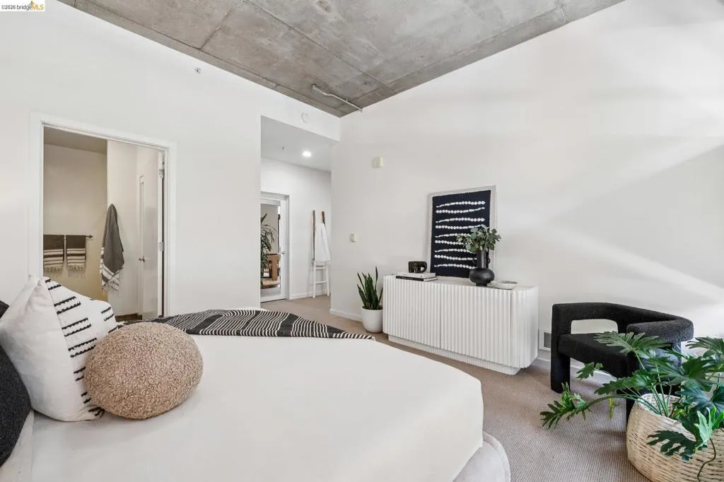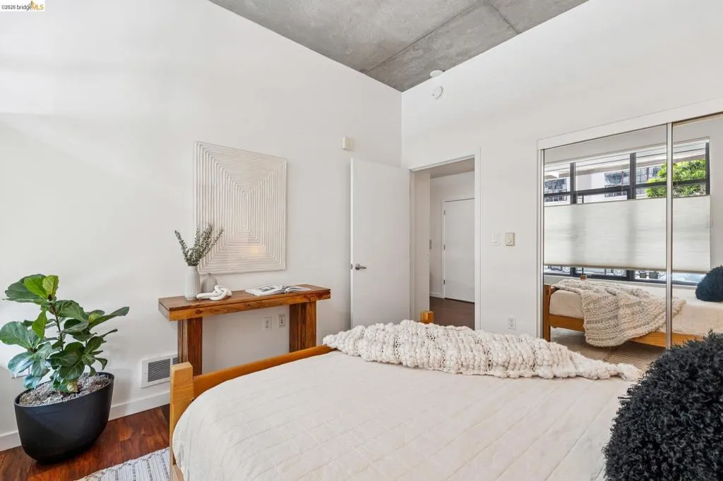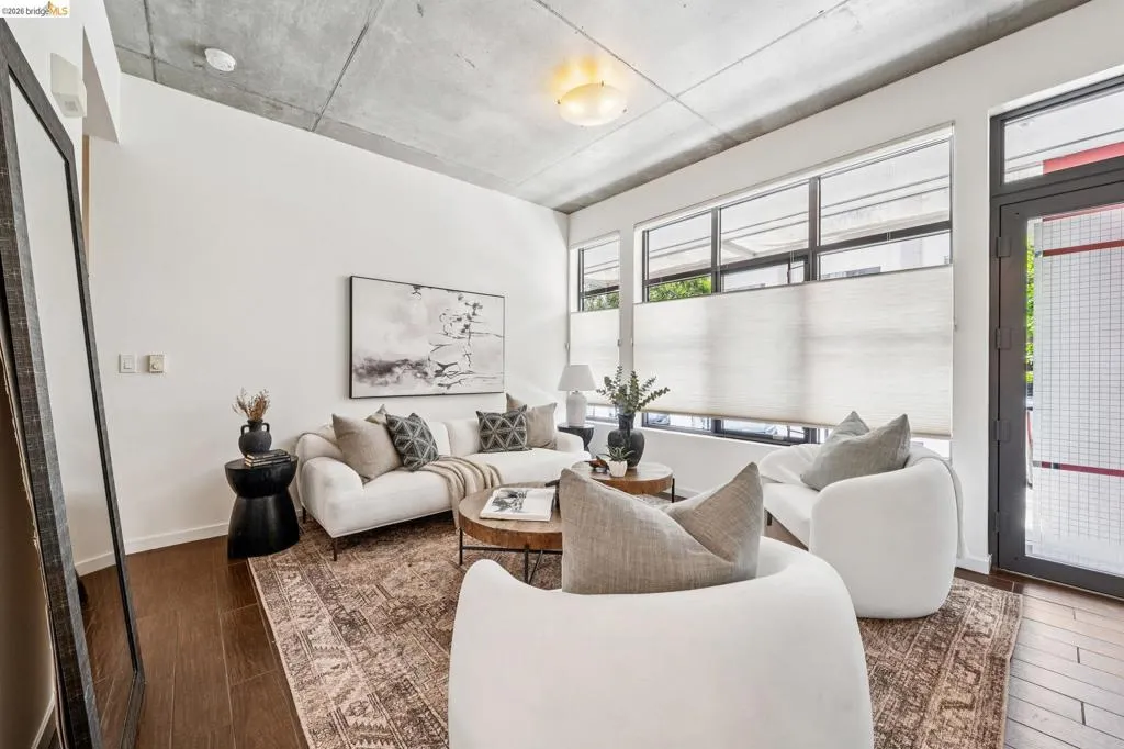 A striking blend of concrete, wood, and slate bring contrast and warmth to this light-filled, loft-style residence, where soaring ceilings and walls of glass define the space. Expansive living and dining areas connect seamlessly, creating an open environment suited for work, living and entertaining, with a sleek, well-appointed kitchen integrated into the layout. Bedrooms are positioned to provide separation and privacy, the primary bedroom has an ensuite bath. Thoughtful finishes include radiant-heated tile floors in bathrooms and a cedar-floored primary closet. The six-story building is crowned by a rooftop deck with 360° views, outdoor kitchen, and heated lounge areas. Garage parking includes a rare ground-floor space with 220V EV charger. Located in the Jack London Square district, with waterfront dining, breweries, transit.
