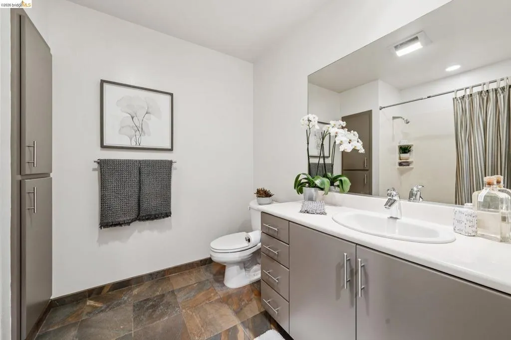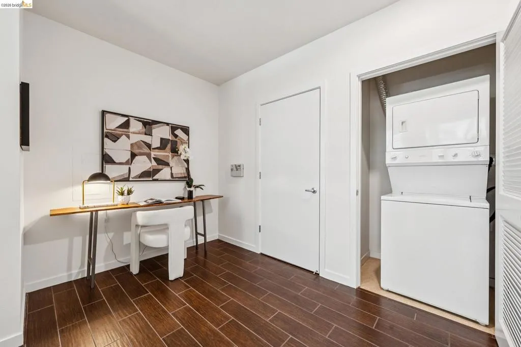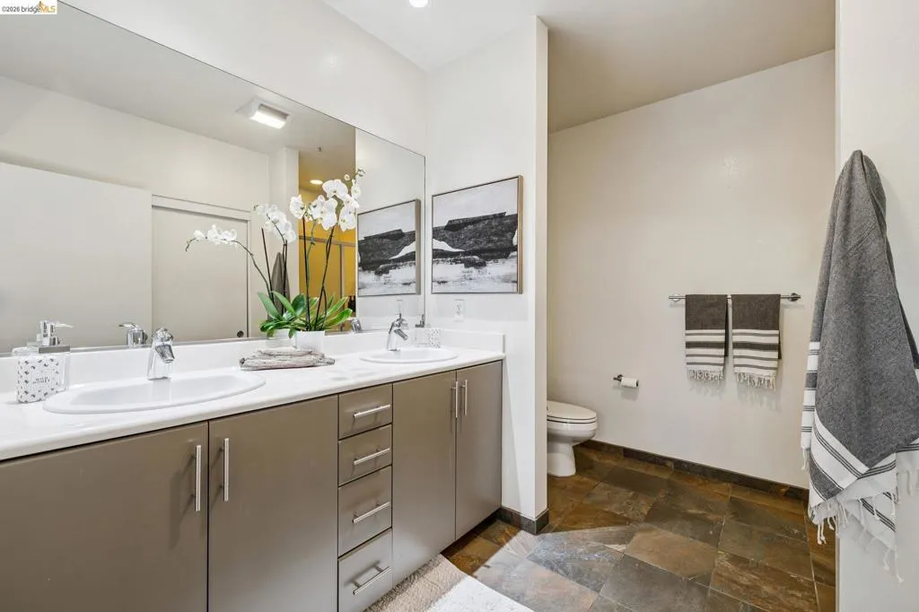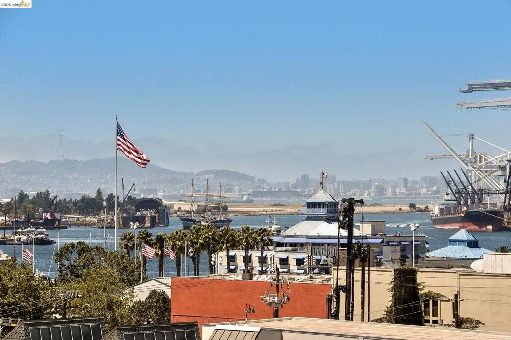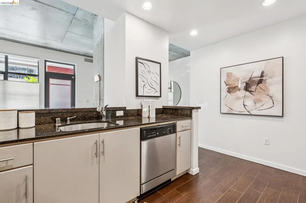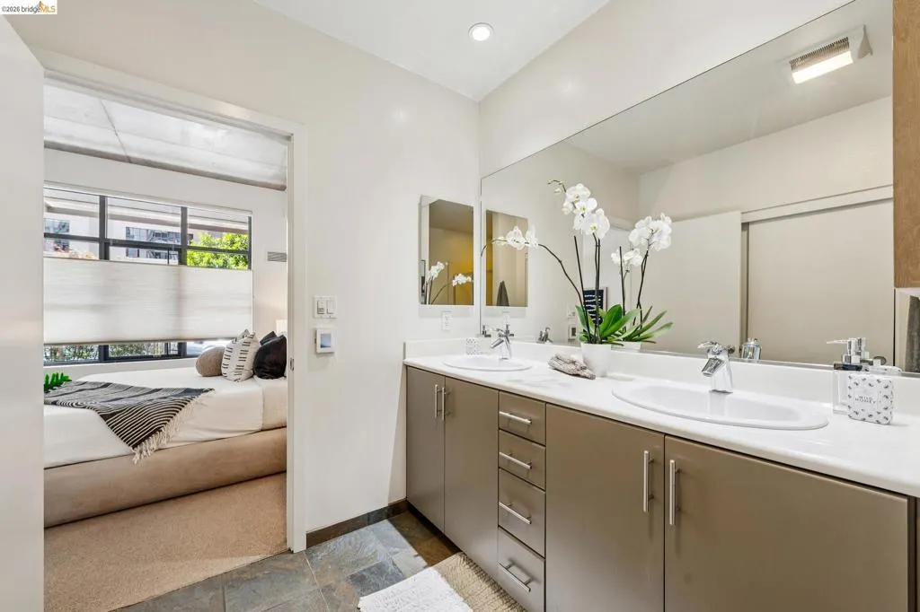A striking blend of concrete, wood, and slate bring contrast and warmth to this light-filled, loft-style residence, where soaring ceilings and walls of glass define the space. Expansive living and dining areas connect seamlessly, creating an open environment suited for work, living and entertaining, with a sleek, well-appointed kitchen integrated into the layout. Bedrooms are positioned to provide separation and privacy, the primary bedroom has an ensuite bath. Thoughtful finishes include radiant-heated tile floors in bathrooms and a cedar-floored primary closet. The six-story building is crowned by a rooftop deck with 360° views, outdoor kitchen, and heated lounge areas. Garage parking includes a rare ground-floor space with 220V EV charger. Located in the Jack London Square district, with waterfront dining, breweries, transit.