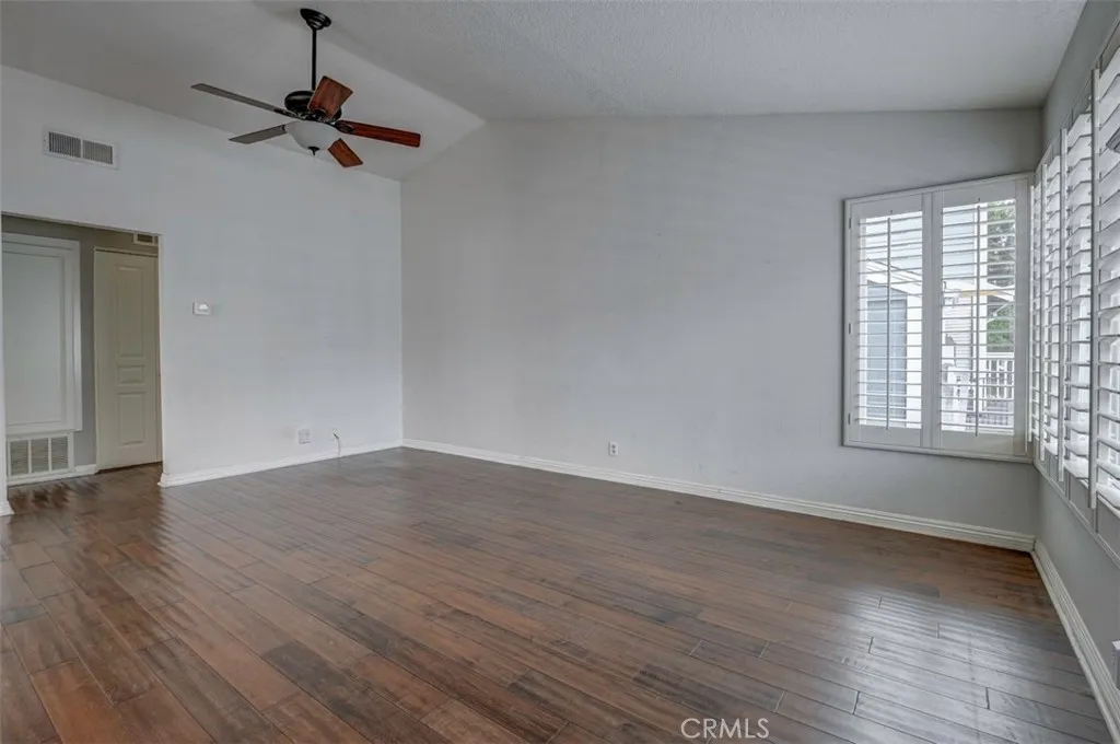 Warm, inviting and filled with natural light, this beautiful home offers a comfortable and stylish living experience. The spacious layout features wood flooring throughout the living room, dining area, kitchen and hallway complemented by granite countertops in both the kitchen and bathrooms. The kitchen is equipped with white cabinetry and appliances, a charming farmhouse sink and recessed lighting. A convenient cabinet niche in the dining room, complete with glass cabinetry and granite surfaces serves perfectly as a bar or decorative display. The living and dining rooms showcase elegant vaulted ceilings and an upgraded ceiling fan, creating a bright, open feel. Plantation shutters throughout add a timeless touch, while upgraded baseboards enhance the overall finish. The primary suite offers a large walk-in closet and direct access through a sliding glass door to the patio, creating a private and relaxing retreat. A secondary bedroom features mirrored closet doors for added style and functionality. Step outside to enjoy the spacious, enclosed patio ideal for outdoor living. Additional highlights include a detached garage conveniently located near the unit. This light-filled home blends comfort, charm, and thoughtful upgrades throughout.