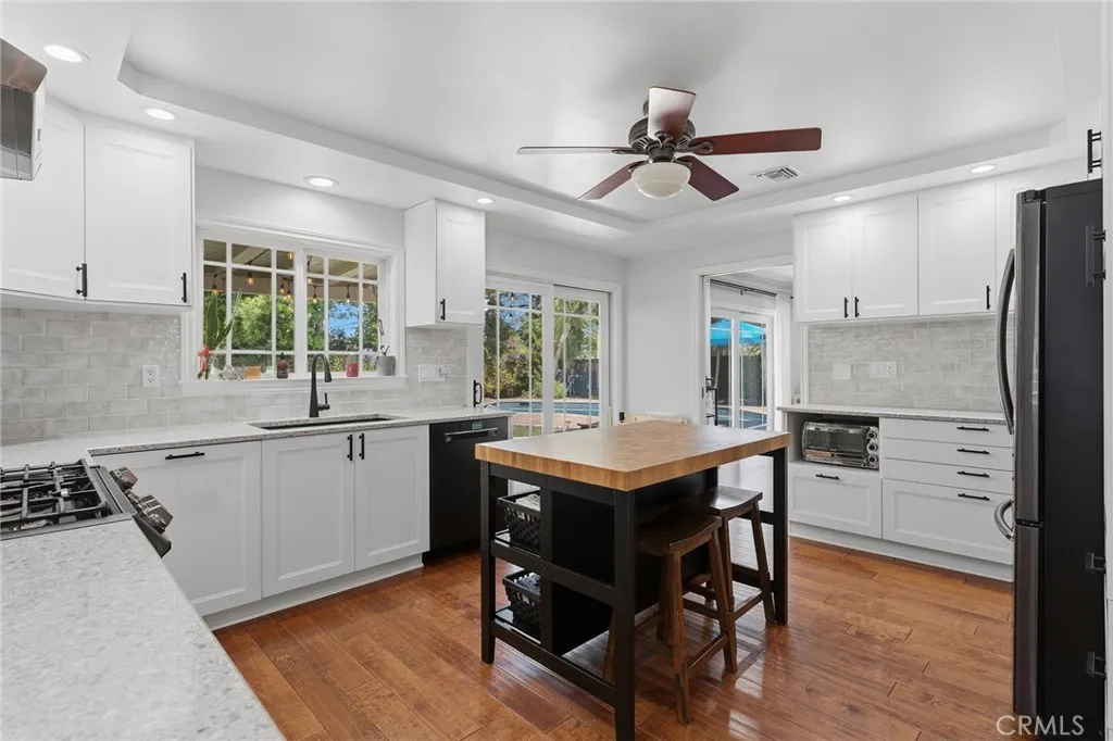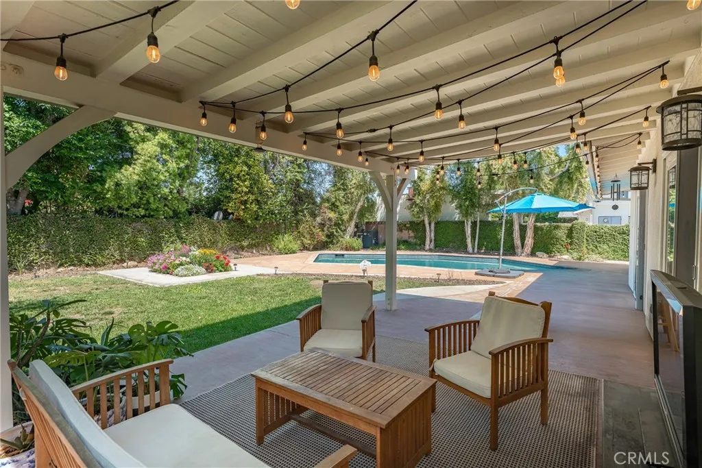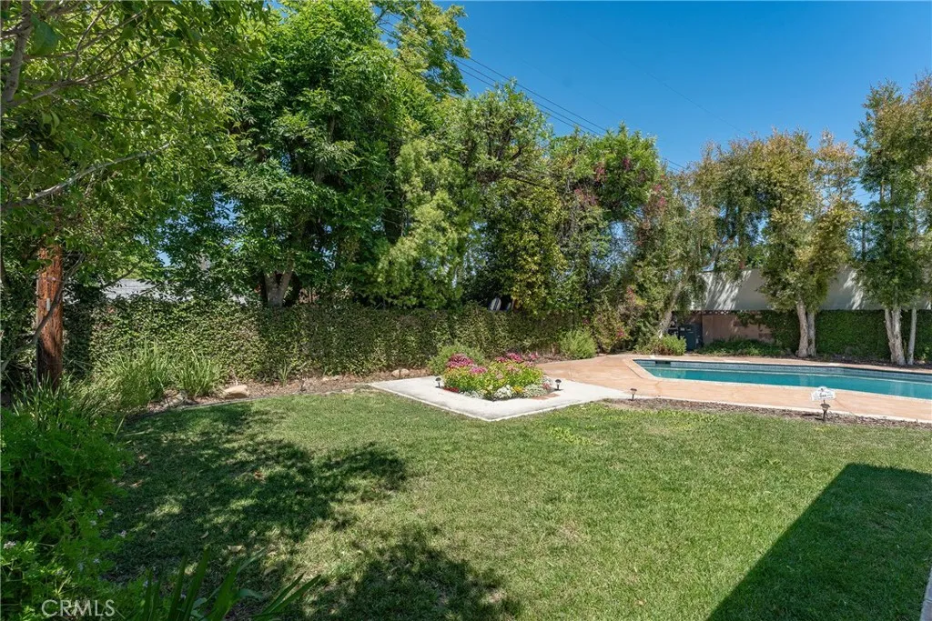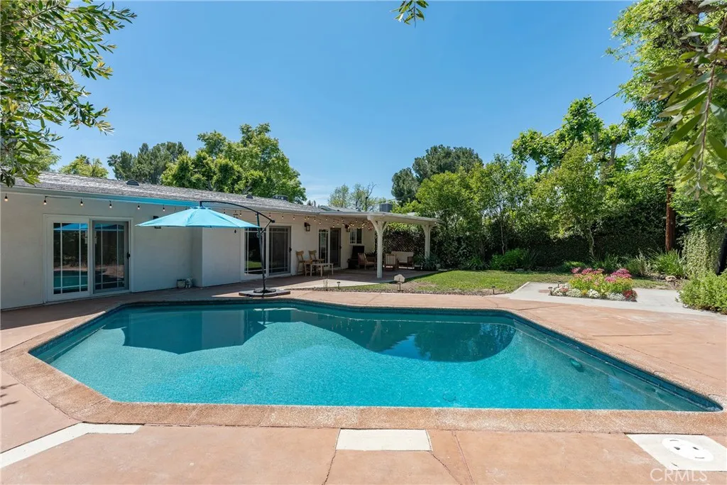 Completely remodeled single story pool home with terrific location adjacent to Walnut Acres! The property is set back from the street with sprawling front lawn, lush landscaping, sweeping driveway that leads to the attached 2-car garage, and an expansive covered front porch. Step inside to find a formal entry with coat closet that leads to the spacious living room flooded with natural light featuring real wood flooring and a glass slider that opens to the yard. A separate formal dining room can accommodate large dinner parties and has pocket doors that open to both the living room and kitchen. The completely remodeled kitchen overlooks the yard and boasts custom soft close cabinetry, pantry space with pullout drawers, stone countertops, and stainless Samsung smart appliances. The primary bedroom is positioned perfectly to overlook the backyard with large glass slider and features closet with built-ins and access to a remodeled bathroom with new vanity, tub and shower. An adjacent bedroom can also be used as office, gym, or nursery. The third bedroom has a large walk-in closet and access to a remodeled bathroom with new vanity and walk-in shower. There is a convenient indoor laundry area with a second set of hookups in the garage. The entertainer’s backyard features refinished PebbleTec heated swimming pool with new speed pump and safety fence, large covered patio perfect for outdoor dining, grass lawn for play, and gorgeous mature trees and lush landscaping with new irrigation. Adjacent to Westfield Mall/Village, Calabasas Commons, Warner Center with the new Rams Village in development, local parks/hiking trails, & zoned for award-winning El Camino & Hale charter schools.