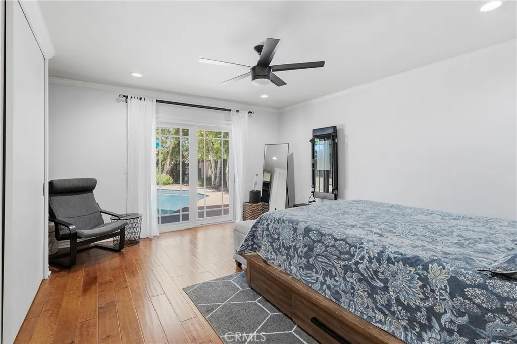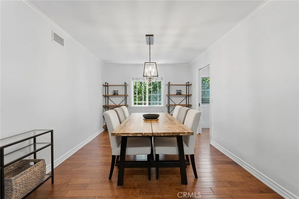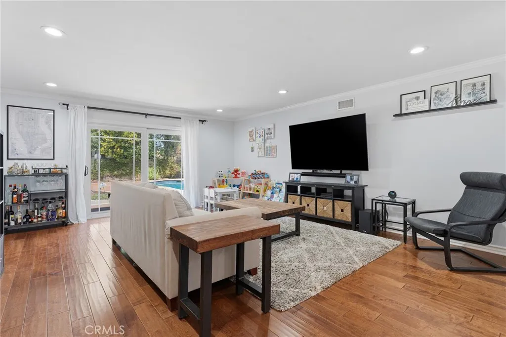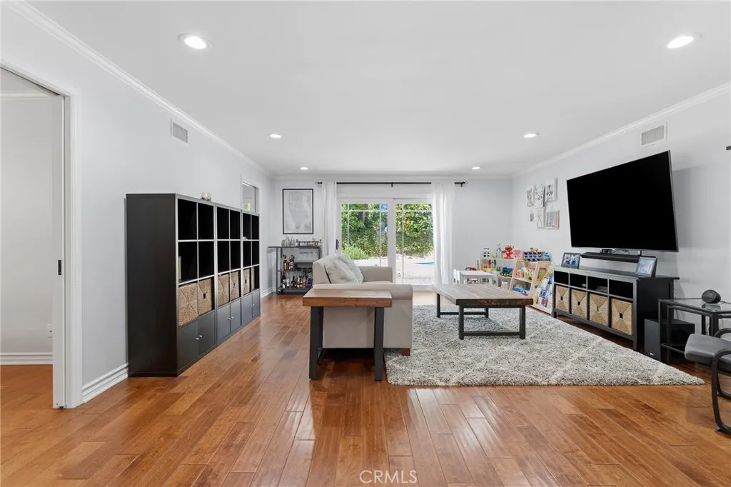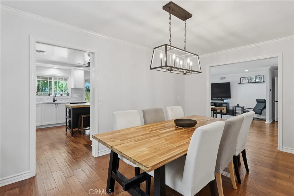 Completely remodeled single story pool home with terrific location adjacent to Walnut Acres! The property is set back from the street with sprawling front lawn, lush landscaping, sweeping driveway that leads to the attached 2-car garage, and an expansive covered front porch. Step inside to find a formal entry with coat closet that leads to the spacious living room flooded with natural light featuring real wood flooring and a glass slider that opens to the yard. A separate formal dining room can accommodate large dinner parties and has pocket doors that open to both the living room and kitchen. The completely remodeled kitchen overlooks the yard and boasts custom soft close cabinetry, pantry space with pullout drawers, stone countertops, and stainless Samsung smart appliances. The primary bedroom is positioned perfectly to overlook the backyard with large glass slider and features closet with built-ins and access to a remodeled bathroom with new vanity, tub and shower. An adjacent bedroom can also be used as office, gym, or nursery. The third bedroom has a large walk-in closet and access to a remodeled bathroom with new vanity and walk-in shower. There is a convenient indoor laundry area with a second set of hookups in the garage. The entertainer’s backyard features refinished PebbleTec heated swimming pool with new speed pump and safety fence, large covered patio perfect for outdoor dining, grass lawn for play, and gorgeous mature trees and lush landscaping with new irrigation. Adjacent to Westfield Mall/Village, Calabasas Commons, Warner Center with the new Rams Village in development, local parks/hiking trails, & zoned for award-winning El Camino & Hale charter schools.