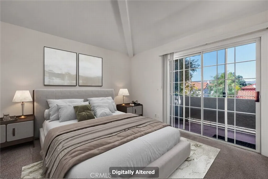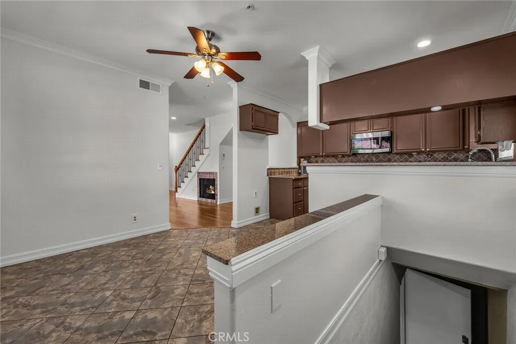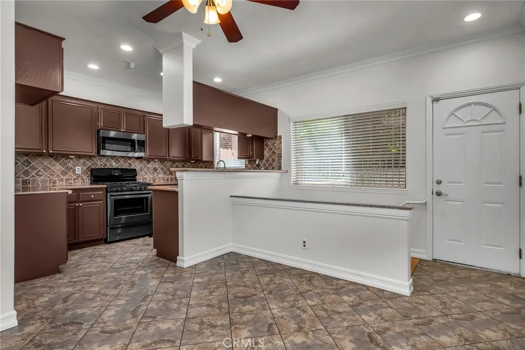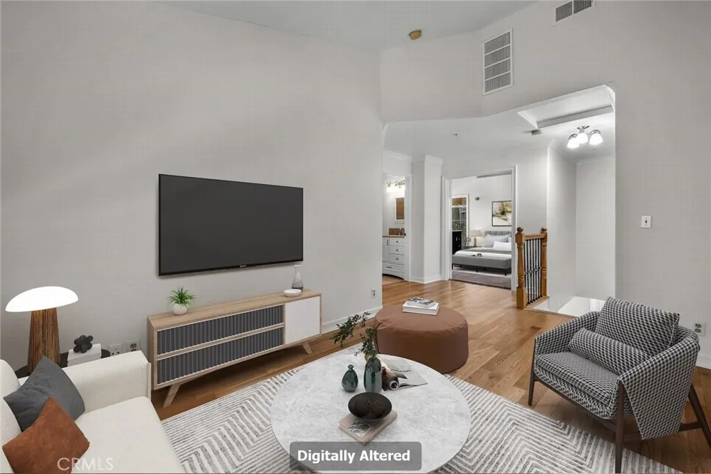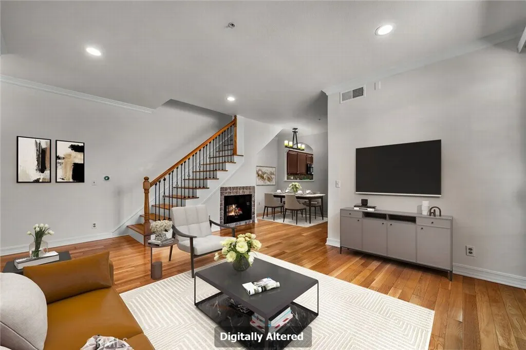 Stop the search—this is the townhome you’ve been waiting for. Beautifully upgraded tri-level residence, quietly tucked at the back of the complex, blending comfort, style, and everyday convenience. Designed for modern living and effortless entertaining, this light-filled home features soaring ceilings, abundant natural light, and an open, airy layout throughout. The main level welcomes you with a spacious living room highlighted by high ceilings, crown molding, recessed lighting, wood-style flooring, and a cozy fireplace. A sliding glass door opens to a large private balcony—perfect for morning coffee or evening relaxation. A convenient guest bathroom completes this level. The updated kitchen showcases warm Carmel-toned cabinetry, granite countertops, stone backsplash, stainless steel appliances, and decorative tile flooring, all opening seamlessly to a generous breakfast area ideal for casual dining. Upstairs, a decorative staircase leads to a versatile bonus area—perfect as a family room, home office, or media space. The expansive primary suite offers a peaceful retreat with a walk-in closet and an updated ensuite bathroom featuring a granite-top vanity and beautifully tiled step-in shower. The spacious secondary bedroom includes a mirrored closet and access to an updated hall bathroom with granite-top vanity and tub/shower combo. Both bedrooms enjoy direct access to a large, tranquil balcony, enhancing the indoor-outdoor flow. Additional highlights include a private two-car garage with washer and dryer, ample storage, and a well-maintained community featuring a pool and spa. Ideally located near shopping, dining, and with easy access to the 101 and 405 freeways, this home offers the perfect balance of comfort, convenience, and lifestyle.