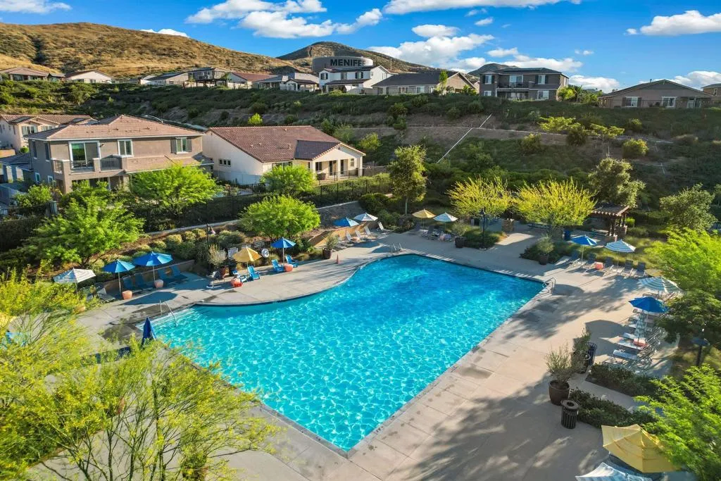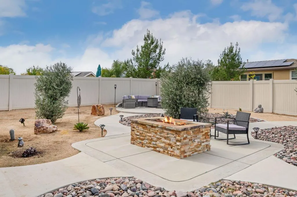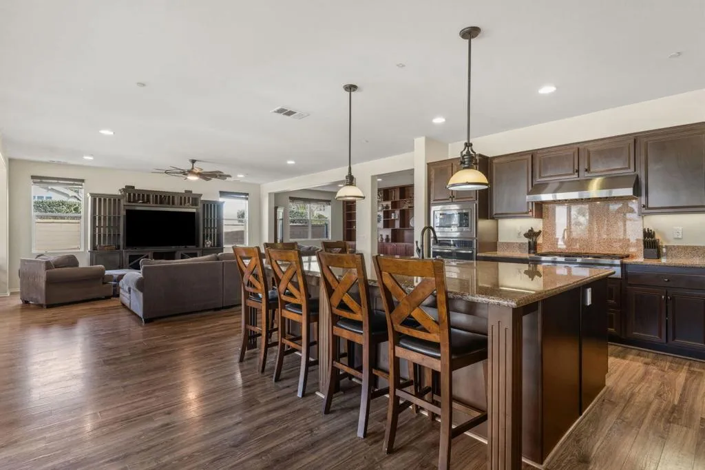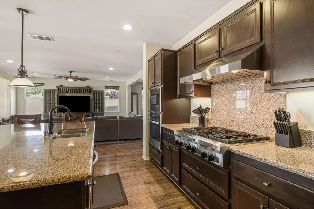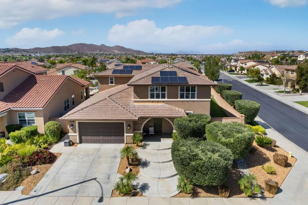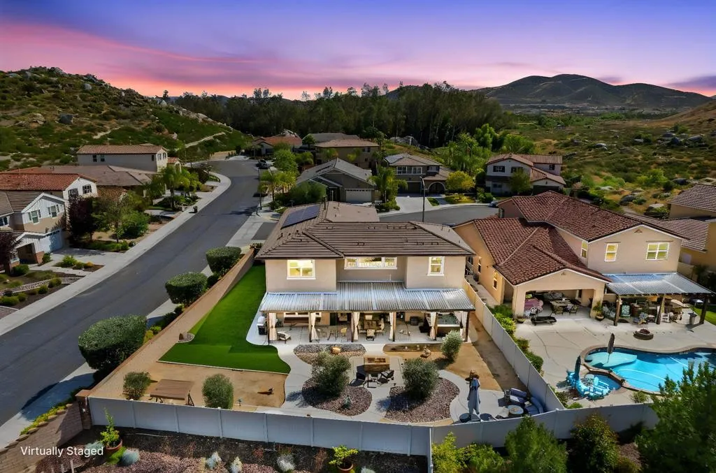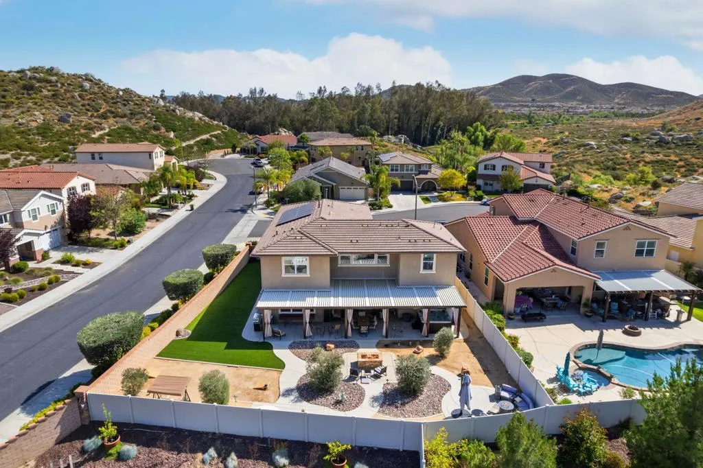 Welcome to this exceptional residence in the highly sought-after Audie Murphy Ranch, where upscale living meets resort-style amenities including pools, spa, clubhouse, sports courts, playgrounds, BBQ areas, and scenic hiking trails. Perfectly positioned on a corner cul-de-sac lot, this home showcases impressive curb appeal with manicured, low-maintenance landscaping and a thoughtfully designed, expansive floorplan. Inside, beautiful wood laminate flooring flows throughout, complementing the light-filled living spaces. The gourmet kitchen is a centerpiece, featuring a massive island with bar seating for six, granite countertops and backsplash, a built-in 6-burner range, stainless steel appliances, rich espresso cabinetry, and a walk-in pantry--all with direct access to the 4-car garage. The spacious living room offers a custom built-in office or reading nook, ideal for today's flexible lifestyle. With 6 generously sized bedrooms and 5 bathrooms, including two main-level bedrooms (one en suite), this home is perfect for multigenerational living or hosting guests. Upstairs, you'll find four additional bedrooms, three bathrooms, a large laundry room, and an oversized primary suite with a luxurious en-suite bath featuring a soaking tub and separate shower. Go outside to a private backyard retreat designed for entertaining, complete with a huge covered patio with ceiling fans, multiple seating areas, concrete walkways, a built-in stone firepit, grassy side yard, and a dedicated cornhole area--all enclosed with vinyl fencing for privacy. Additional highlights include a leased solar system paid through 2034, offering energy efficiency and long-term savings. This home combines space, style, and community in one remarkable offering.