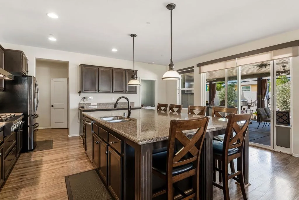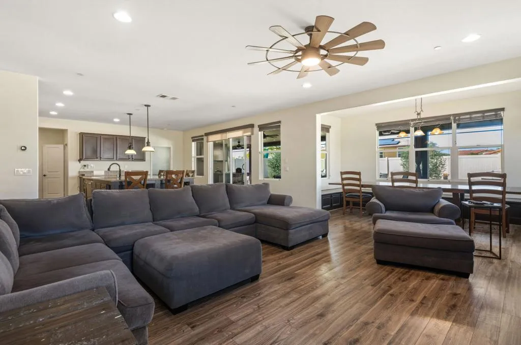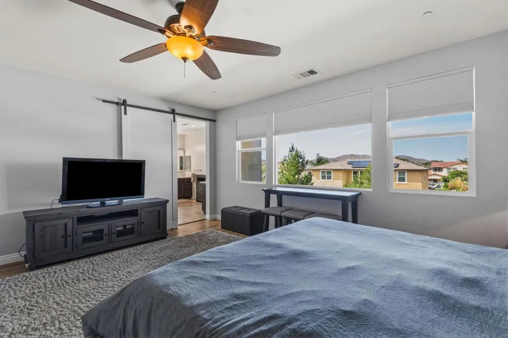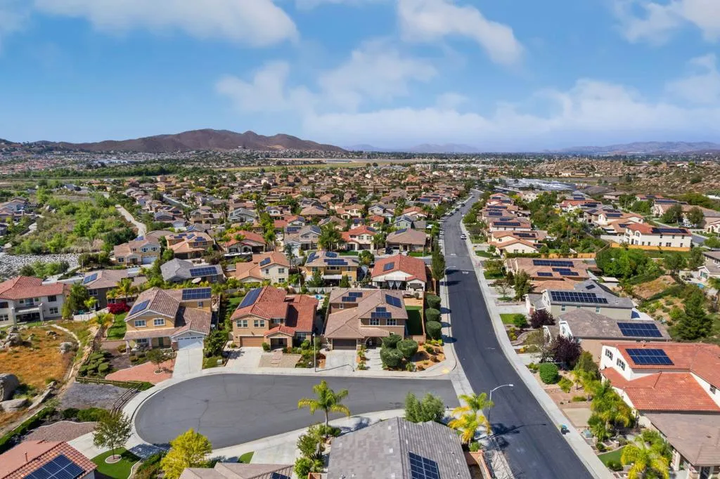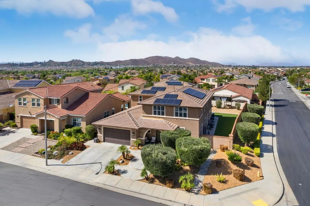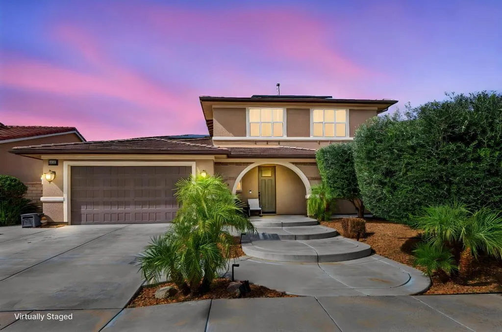 Welcome to this exceptional residence in the highly sought-after Audie Murphy Ranch, where upscale living meets resort-style amenities including pools, spa, clubhouse, sports courts, playgrounds, BBQ areas, and scenic hiking trails. Perfectly positioned on a corner cul-de-sac lot, this home showcases impressive curb appeal with manicured, low-maintenance landscaping and a thoughtfully designed, expansive floorplan. Inside, beautiful wood laminate flooring flows throughout, complementing the light-filled living spaces. The gourmet kitchen is a centerpiece, featuring a massive island with bar seating for six, granite countertops and backsplash, a built-in 6-burner range, stainless steel appliances, rich espresso cabinetry, and a walk-in pantry--all with direct access to the 4-car garage. The spacious living room offers a custom built-in office or reading nook, ideal for today's flexible lifestyle. With 6 generously sized bedrooms and 5 bathrooms, including two main-level bedrooms (one en suite), this home is perfect for multigenerational living or hosting guests. Upstairs, you'll find four additional bedrooms, three bathrooms, a large laundry room, and an oversized primary suite with a luxurious en-suite bath featuring a soaking tub and separate shower. Go outside to a private backyard retreat designed for entertaining, complete with a huge covered patio with ceiling fans, multiple seating areas, concrete walkways, a built-in stone firepit, grassy side yard, and a dedicated cornhole area--all enclosed with vinyl fencing for privacy. Additional highlights include a leased solar system paid through 2034, offering energy efficiency and long-term savings. This home combines space, style, and community in one remarkable offering.