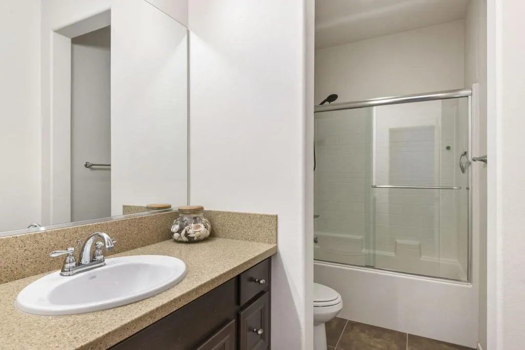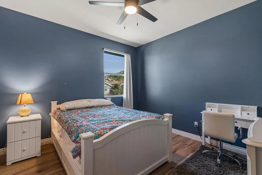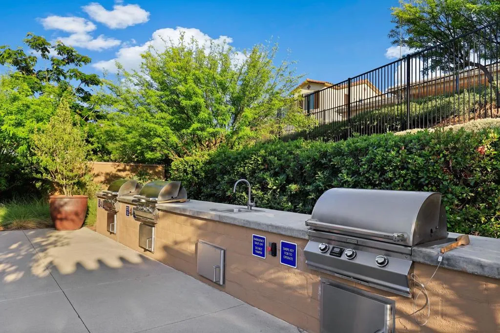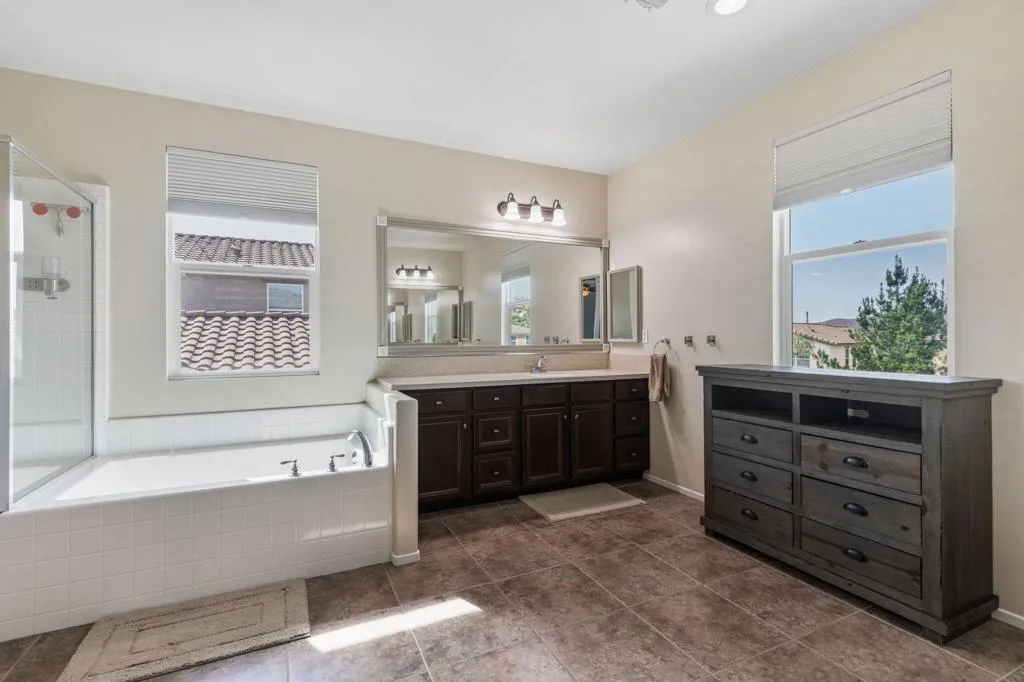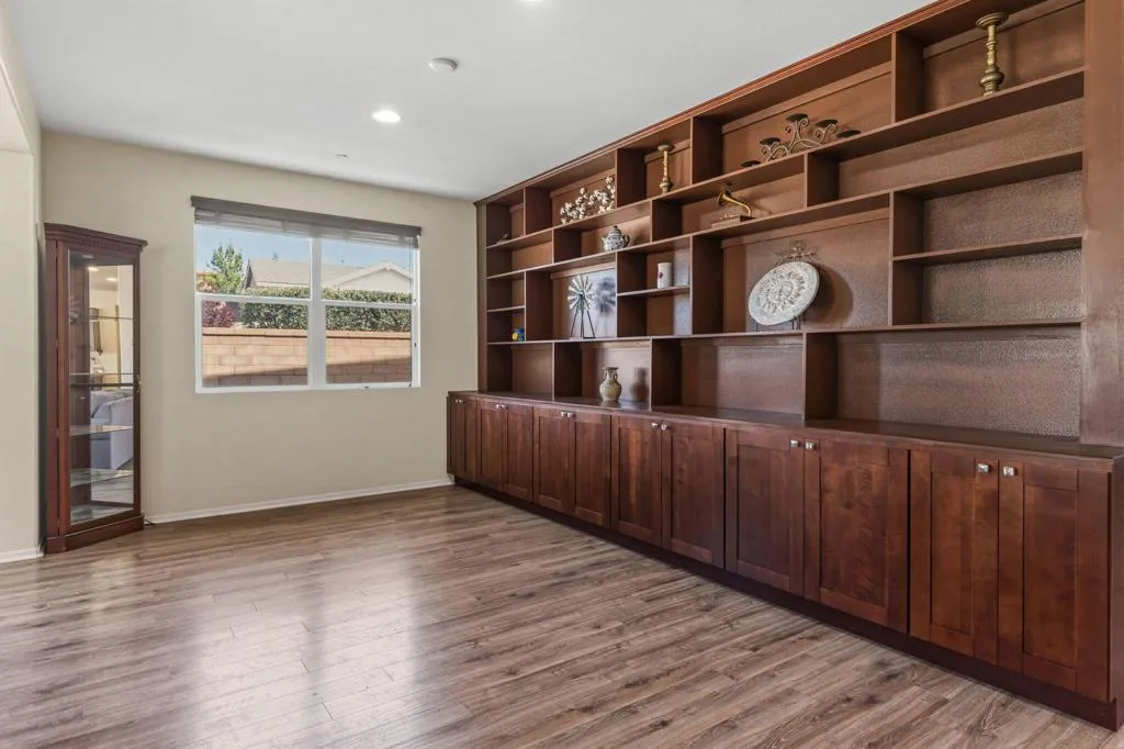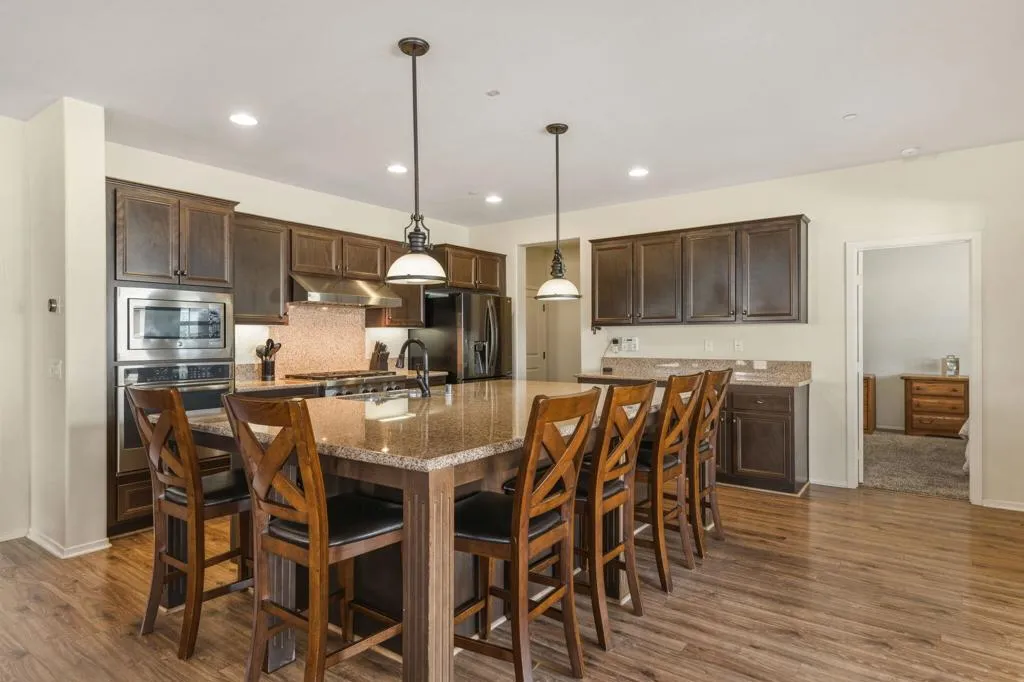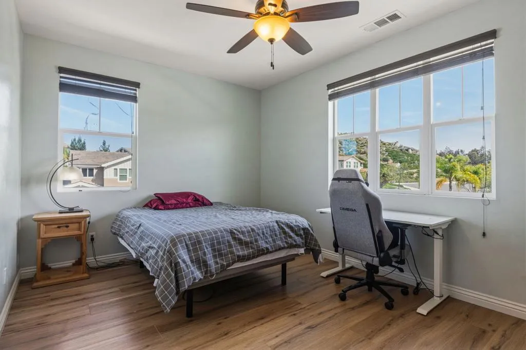 Welcome to this exceptional residence in the highly sought-after Audie Murphy Ranch, where upscale living meets resort-style amenities including pools, spa, clubhouse, sports courts, playgrounds, BBQ areas, and scenic hiking trails. Perfectly positioned on a corner cul-de-sac lot, this home showcases impressive curb appeal with manicured, low-maintenance landscaping and a thoughtfully designed, expansive floorplan. Inside, beautiful wood laminate flooring flows throughout, complementing the light-filled living spaces. The gourmet kitchen is a centerpiece, featuring a massive island with bar seating for six, granite countertops and backsplash, a built-in 6-burner range, stainless steel appliances, rich espresso cabinetry, and a walk-in pantry--all with direct access to the 4-car garage. The spacious living room offers a custom built-in office or reading nook, ideal for today's flexible lifestyle. With 6 generously sized bedrooms and 5 bathrooms, including two main-level bedrooms (one en suite), this home is perfect for multigenerational living or hosting guests. Upstairs, you'll find four additional bedrooms, three bathrooms, a large laundry room, and an oversized primary suite with a luxurious en-suite bath featuring a soaking tub and separate shower. Go outside to a private backyard retreat designed for entertaining, complete with a huge covered patio with ceiling fans, multiple seating areas, concrete walkways, a built-in stone firepit, grassy side yard, and a dedicated cornhole area--all enclosed with vinyl fencing for privacy. Additional highlights include a leased solar system paid through 2034, offering energy efficiency and long-term savings. This home combines space, style, and community in one remarkable offering.