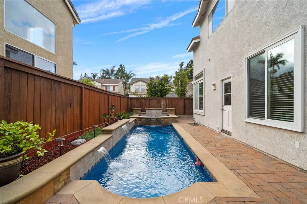Absolutely stunning pool home ideally situated on a prime interior corner lot in the highly sought-after Key West community of Aliso Viejo. Expanded to approximately 1,927 sqft with the addition of a versatile 200 sqft loft/media room (easily a 4th bedroom), this exceptional residence showcases numerous upgrades including PEX re-piping, central A/C, wood laminate flooring, recessed lighting, crown molding, raised panel doors, ceiling fans, dual pane windows,10 foot volume ceilings and 240v EV plug charger in garage. The true showstopper is the breathtaking backyard oasis featuring a sparkling blue glass mosaic tile pool & spa with stacked stone accents, and multiple water features, surrounded by interlocking paver decking that creates the perfect setting for entertaining, evening barbecues, or simply unwinding while enjoying the soft ocean breezes drifting up the canyon. A gas line and electrical outlet are already in place for a future outdoor BBQ center, and beautifully landscaped raised planters complete this private resort-style retreat. This home offers outstanding curb appeal with lawn, gardens set in planter areas, and a charming brick front porch and walkway set in an elegant chevron design. Step inside to the welcoming foyer and formal living room that flows seamlessly into the spacious family room with a tile gas-log fireplace, media niche, adjacent dining area, and a light-filled kitchen enhanced by high transom windows, a center island, brand new quartz countertops, a new deep stainless sink, abundant maple cabinetry with glass display panels, and stainless appliances including a gas range, dishwasher, and brand new microwave. Upstairs features an oversized primary suite with cathedral ceiling, an enormous walk-in closet, and a luxurious ensuite bath with dual sinks, sit-down vanity, tub/shower combo, and privacy toilet. Also upstairs is a convenient inside laundry closet, two additional bedrooms, and a full guest bathroom. Located in one of Aliso Viejo’s most desirable neighborhoods with only 1 HOA and No Mellow Roos, making it extremely sought after. Residents enjoy award-winning schools, 21 parks, over 600 acres of scenic open space, beautiful tree-lined streets, and year-round community events. Close to shopping, dining, and a short drive to the world-class beaches of Laguna Beach. This is more than a home, it’s your own private resort in one of Aliso Viejo’s most desirable communities.