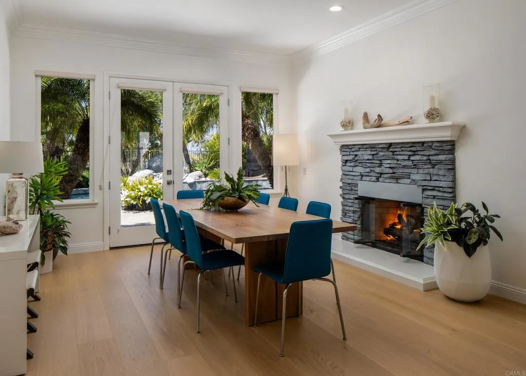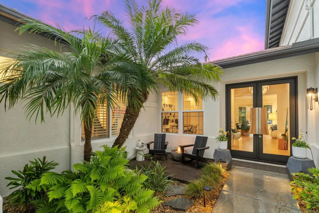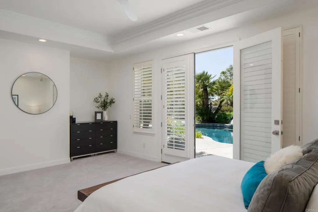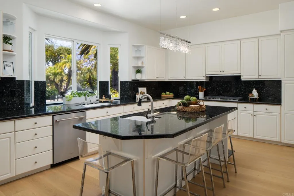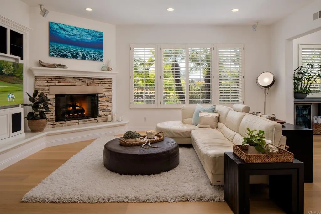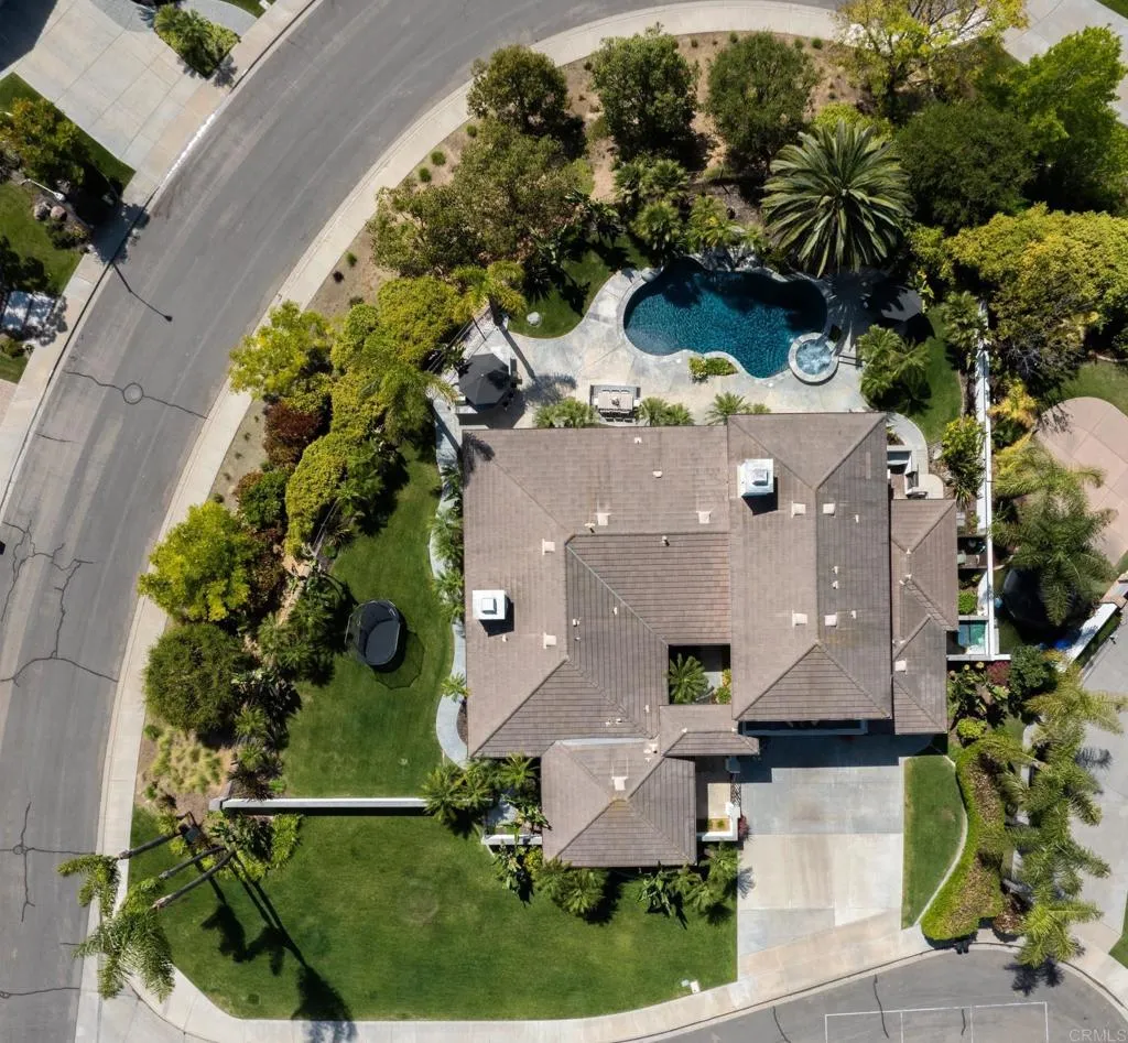 RARELY does a property come to market that TRULY HAS IT ALL: a great neighborhood, large private parcel, gorgeous grounds, west-facing backyard & a flexible floorplan. Located on a quiet cul-de-sac in THE RANCH, an enclave between Olivenhain & La Costa, this exceptional estate offers PRIVACY, scale & COASTAL ELEGANCE. Set on the “developer’s own” PRIME .61 ACRE LOT, it feels like an elevated tropical island with ONLY ONE adjacent neighbor. A private courtyard leads to custom glass entry doors with HANDCRAFTED WALNUT live-edge handles. Inside, nearly 5,000 sq ft of thoughtfully designed space offers STYLE & FLEXIBILITY. The formal living room, currently styled as a spacious dining area, features a WALL OF WINDOWS framing a CASCADING WATERFALL, POOL & PALMS. The formal dining room has been thoughtfully repurposed as a stylish family office. At the HEART OF THE HOME, the inviting family room centers around a STONE FIREPLACE with expansive windows. The ISLAND KITCHEN opens to a breakfast area with French doors to the backyard. A large RECREATION ROOM serves as the ACTIVITY HUB, with space for a pool table, gym, lounge & putting practice. LIVES LIKE A SINGLE STORY with a primary suite & 2 additional bedrooms on the main level. While upstairs there are 2 more bedrooms & a living room with deck, ideal for guests, office, bonus space or MULTIGENERATIONAL LIVING. The primary retreat features French doors to the yard, a SPA-LIKE bath & custom dream closet. The backyard is a private resort PRIVATE RESORT with a dramatic waterfall, freeform pool & spa, outdoor kitchen & lush tropical landscaping and a custom designed outdoor shower. Located in the highly regarded Encinitas School District and just minutes from beaches, shopping, and dining.