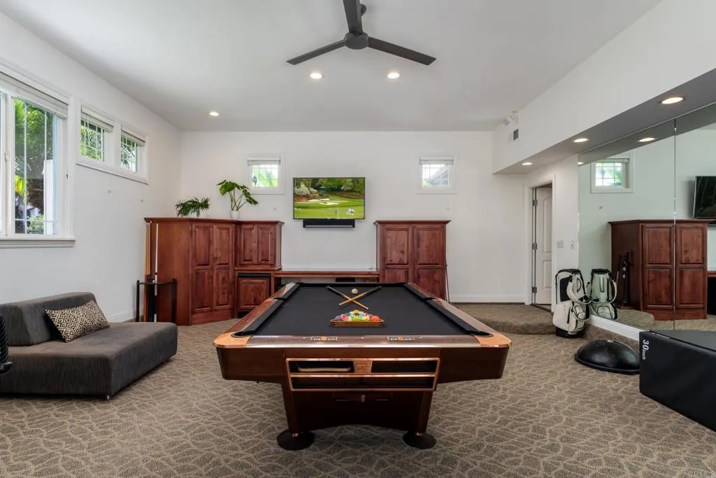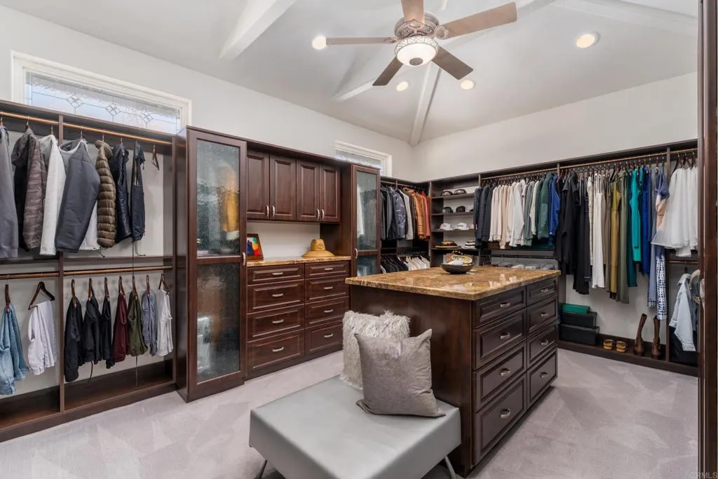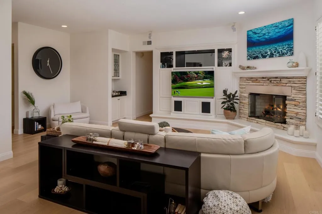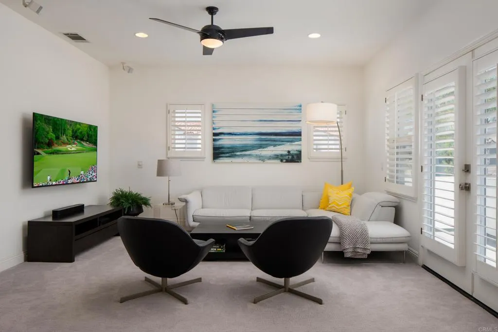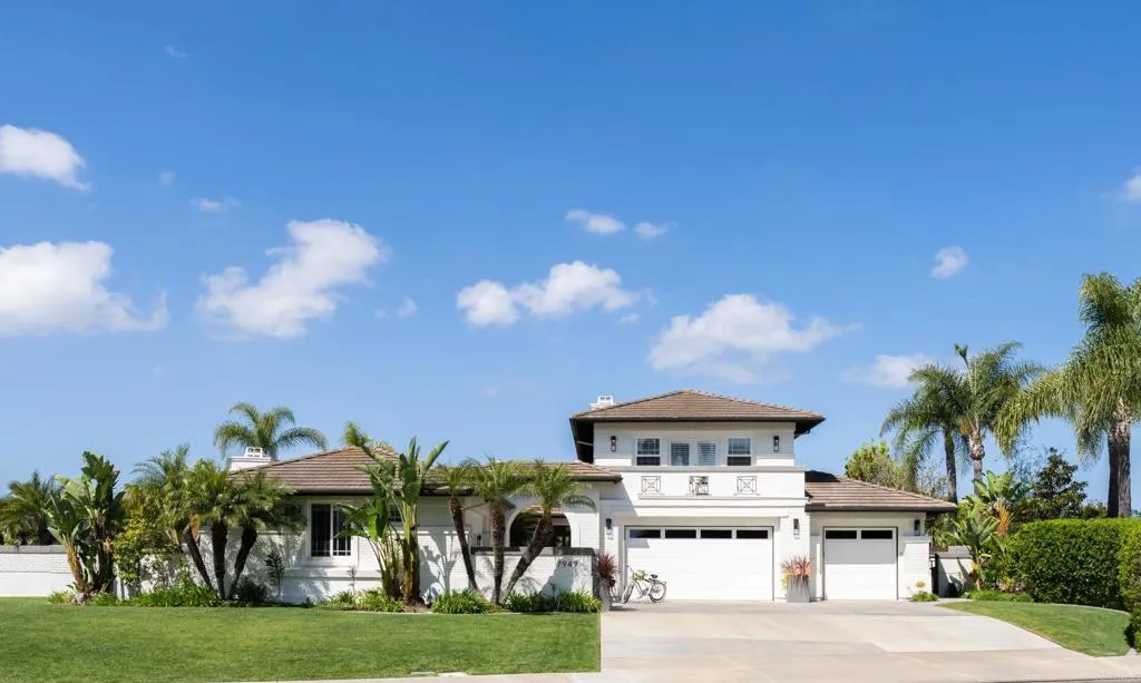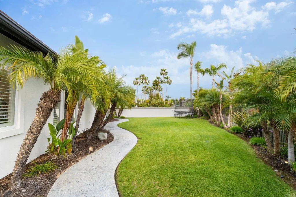 RARELY does a property come to market that TRULY HAS IT ALL: a great neighborhood, large private parcel, gorgeous grounds, west-facing backyard & a flexible floorplan. Located on a quiet cul-de-sac in THE RANCH, an enclave between Olivenhain & La Costa, this exceptional estate offers PRIVACY, scale & COASTAL ELEGANCE. Set on the “developer’s own” PRIME .61 ACRE LOT, it feels like an elevated tropical island with ONLY ONE adjacent neighbor. A private courtyard leads to custom glass entry doors with HANDCRAFTED WALNUT live-edge handles. Inside, nearly 5,000 sq ft of thoughtfully designed space offers STYLE & FLEXIBILITY. The formal living room, currently styled as a spacious dining area, features a WALL OF WINDOWS framing a CASCADING WATERFALL, POOL & PALMS. The formal dining room has been thoughtfully repurposed as a stylish family office. At the HEART OF THE HOME, the inviting family room centers around a STONE FIREPLACE with expansive windows. The ISLAND KITCHEN opens to a breakfast area with French doors to the backyard. A large RECREATION ROOM serves as the ACTIVITY HUB, with space for a pool table, gym, lounge & putting practice. LIVES LIKE A SINGLE STORY with a primary suite & 2 additional bedrooms on the main level. While upstairs there are 2 more bedrooms & a living room with deck, ideal for guests, office, bonus space or MULTIGENERATIONAL LIVING. The primary retreat features French doors to the yard, a SPA-LIKE bath & custom dream closet. The backyard is a private resort PRIVATE RESORT with a dramatic waterfall, freeform pool & spa, outdoor kitchen & lush tropical landscaping and a custom designed outdoor shower. Located in the highly regarded Encinitas School District and just minutes from beaches, shopping, and dining.