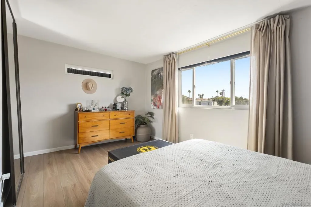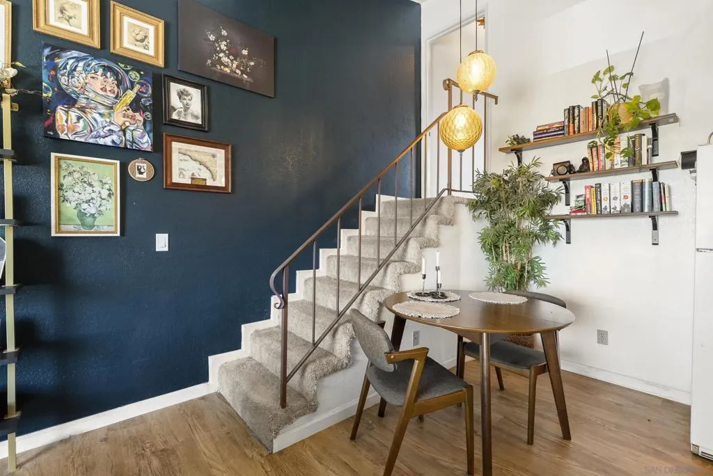 This one isn't your average condo, it's a two-story residence with the living space and kitchen on the main level and the bedroom tucked upstairs, creating a separation of space that feels more like a home than a unit. The split-level layout opens up to vaulted ceilings that pull in natural light that fills the space, giving the space an openness that the square footage alone doesn't tell you. The living room is anchored by the oversized window with unobstructed views and warm vinyl plank floors that run throughout both levels. The kitchen is clean and functional with white shaker cabinets, a pendant light, and everything you need without any wasted space. Upstairs, the bedroom is a proper retreat with a dramatic accent wall, generous natural light, and access to a walk-in closet that has been upgraded with a custom organization system. The bathroom is shower-only, an arched wood-framed mirror, and brushed gold fixtures. One parking space plus a private garage space are included. HOA is just $224/month and covers water, trash, sewer, common area maintenance, and your laundry facilities on site! It is rare to find a unit with this many compelling features under $400k. If you want a place that actually has a vibe and character, this is the one you've been waiting for.