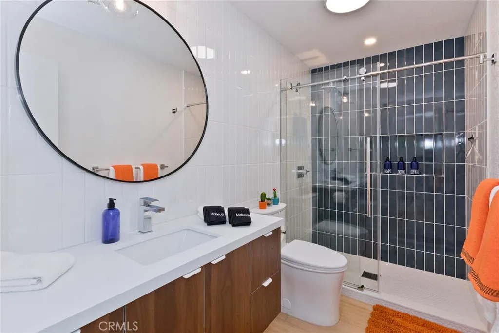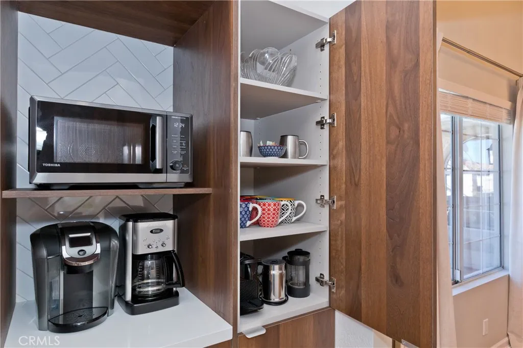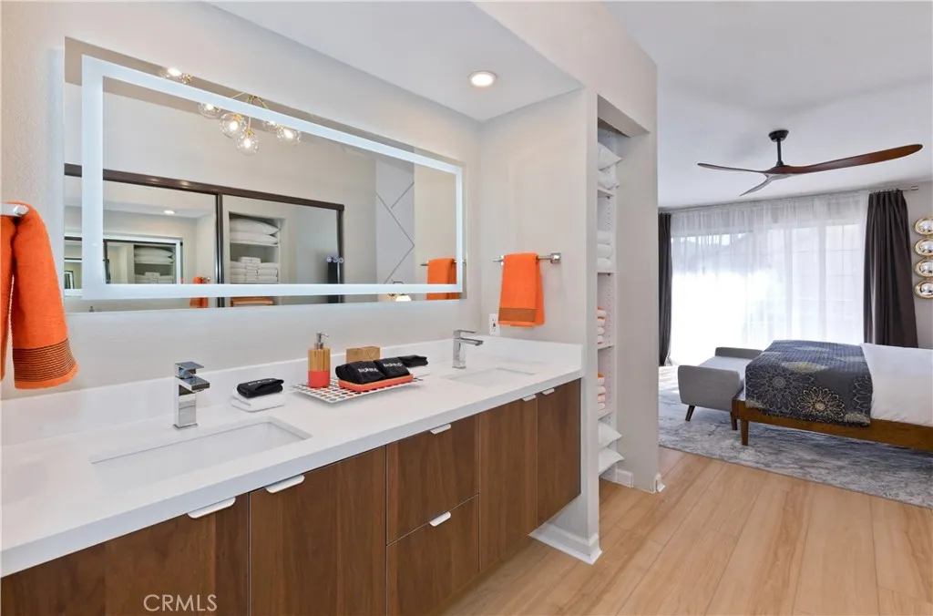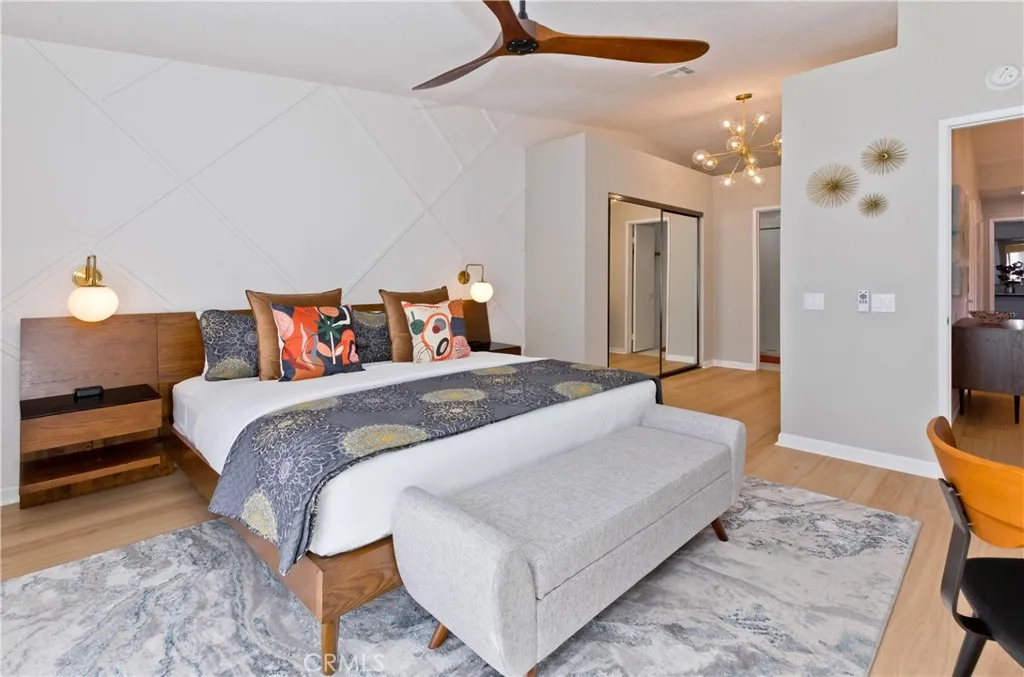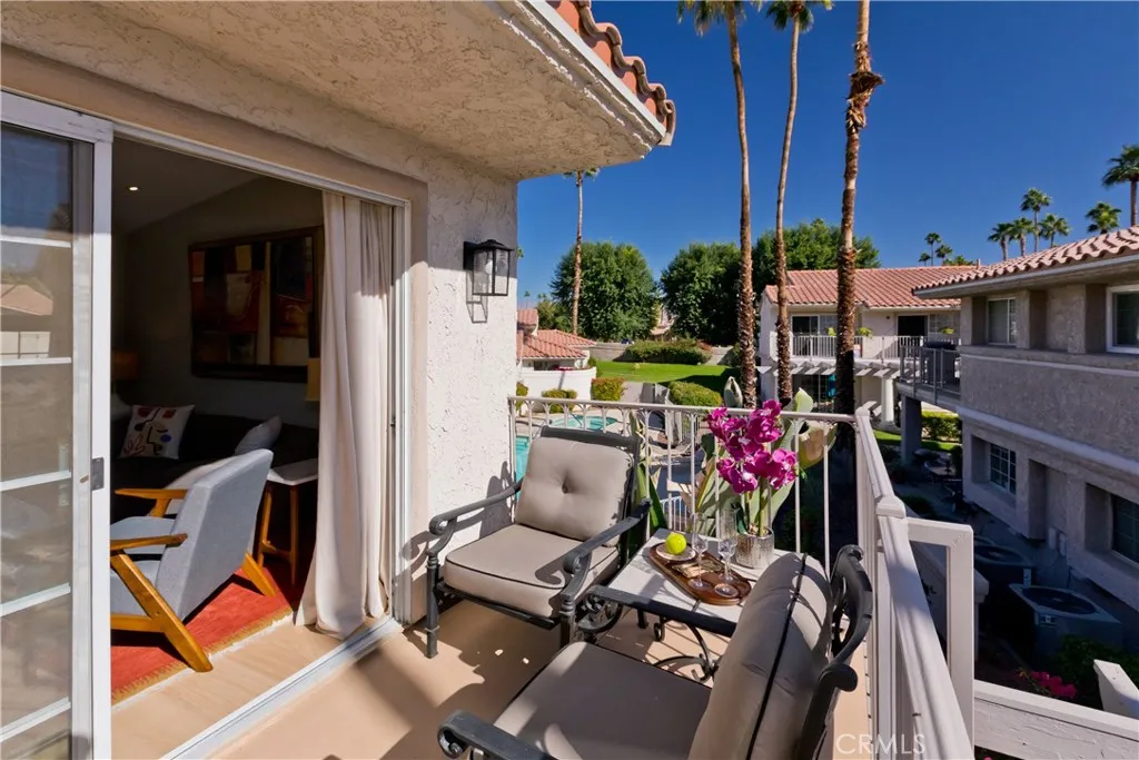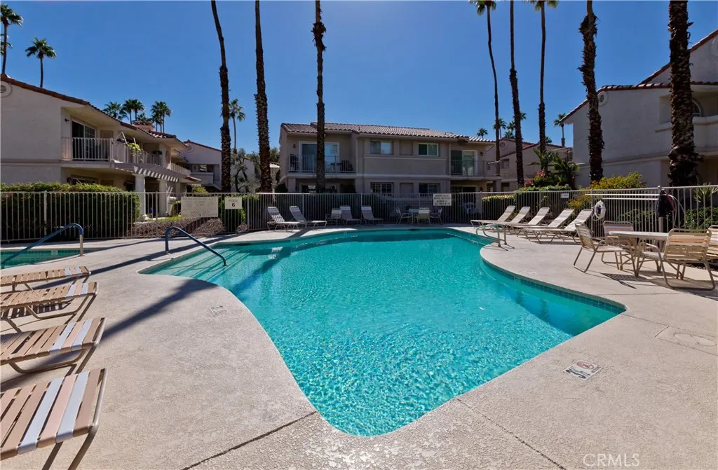 Summer Monthly Rental! other Months availbble at a different amount at seaonal rates. Furnished two bedroom condominium, This two bedroom corner home comes fully furnished and has been fully remodeled , including new kitchen, new bathrooms and floors. Covered parking is available on site and gated entry to the Mesquite complex Our condominium is located in the gorgeous Mesquite Country Club, which itself lies within the newly established, 120 acre Prescott Nature Preserve, just a few minutes from downtown Palm Springs. The beautifully landscaped Mesquite Country Club is a very quiet and upscale community, and its location provides very convenient access to Palm Springs’ restaurants, shopping, museums, galleries, hiking trails and entertainment venues. The home is located on the second floor with vaulted ceilings in the living room, dining room and kitchen and with oversight of the pool from two balconies. We have completely refurbished and modernized the entire home, designed around beautiful walnut cabinets, unique lighting and thoughtful furnishing and design touches to ensure a comfortable and joyful stay! The large living room sports a 65-inch smart-TV, high speed Wi-Fi with comfortable and inviting furniture evoking the mid-century modern design theme of our home. Our large master bedroom welcomes you with a cozy king size bed, and also includes a 65-inch smart-TV and a work desk. The ensuite bathroom is huge, with double sinks, a heated and illuminated mirror, a double wide closet, and something we designers appreciate, a large walk-in shower in its own private room. The guest bedroom has a plush queen size bed with a large pop-up smart-TV, cleverly pocketed into the foot of the bed. The second patio, accessed via the guest bedroom, has a pool view, a barbecue and a high-top outdoor dining table and is connected by a pass-through window to the kitchen, making handing dishes to, or chatting with, your house mates super easy. The guest bathroom is also fully renovated with a beautifully tiled and large walk-in shower, floor to ceiling ceramic tile and a built-in shower niche. We, of course, also provide shampoo, conditioner and body wash and hand soap in both bathrooms. Our home is very conveniently located poolside, directly adjacent to the private pool and jacuzzi area. And as with all the Mesquite Country Club areas, the pools, hot tubs and surrounding landscape are exceptionally well maintained. Utilities: tenant only pays for electrical use