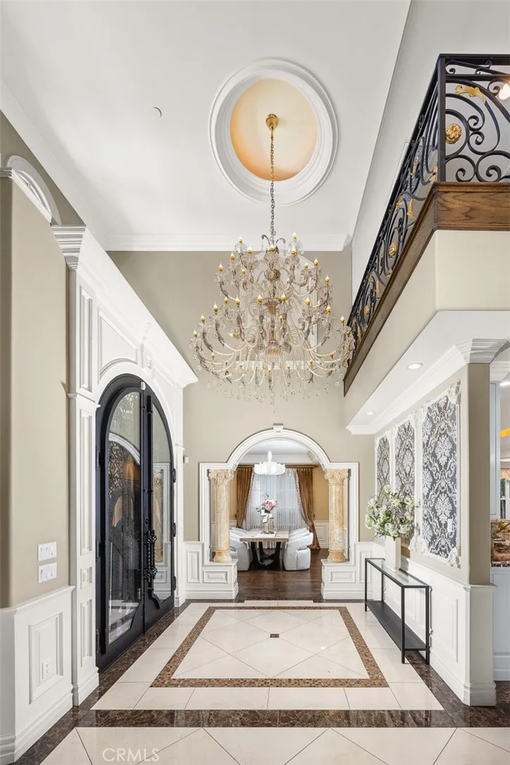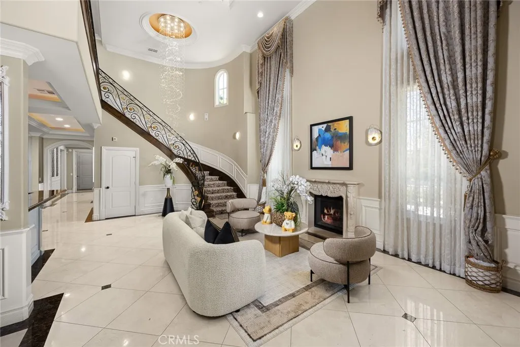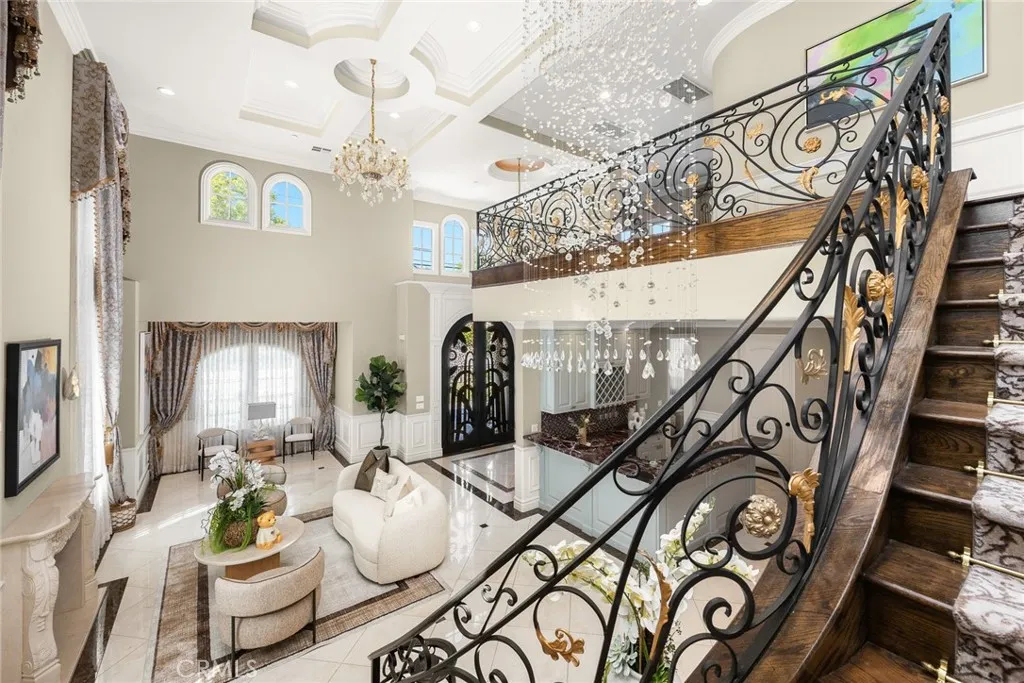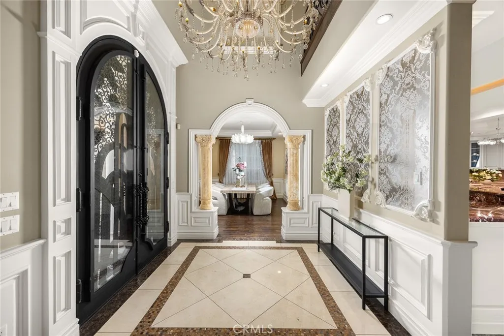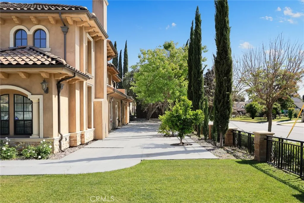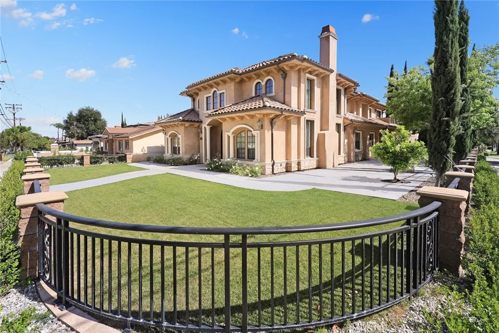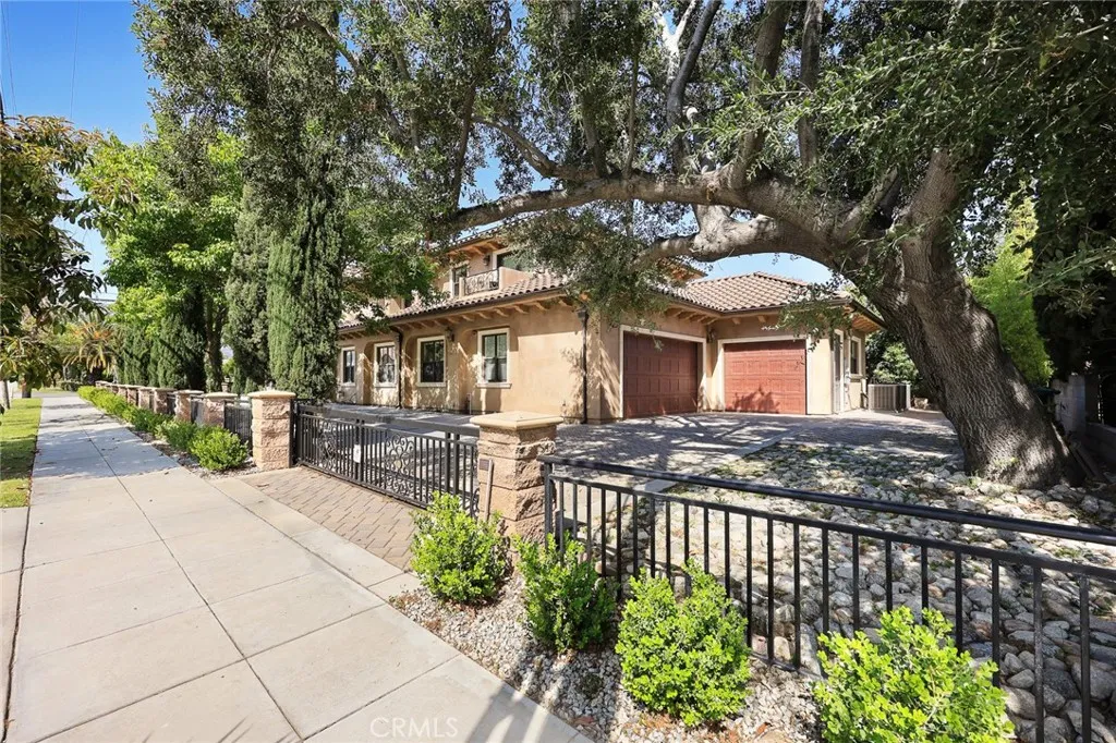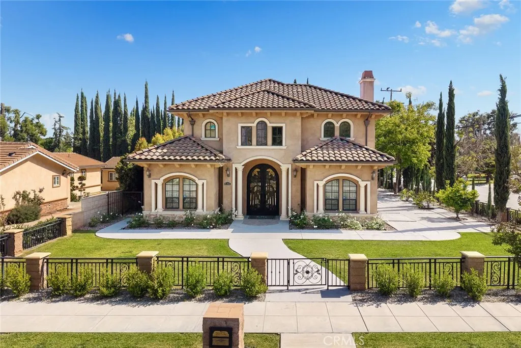 Elegant Mediterranean-style residence located in the highly desirable Baldwin Stocker district of Arcadia, offering 5 bedrooms, 5 bathrooms, and approximately 5,000 SF of living space. Built in 2016, this custom home features a dramatic 25-foot ceiling entry with a 10-foot arched iron and glass double door. The bright living room includes a stone fireplace and soaring windows, while the formal dining room is enhanced by onyx Roman columns and an expansive bar area. The gourmet kitchen offers a center island, abundant cabinetry, a dedicated wok kitchen, additional refrigerator space, and a breakfast nook. The spacious family room is ideal for entertaining or everyday living. The main-level primary suite features a walk-in closet, dual vanities, soaking tub, and oversized shower. Upstairs includes a second primary en-suite with private balcony, an open office area, and additional bedrooms with a Jack-and-Jill bathroom.Additional highlights include solar panels, attached 2-car garage with direct access, an additional 1-car garage, and gated driveway. Low-maintenance backyard and side yard provide comfortable outdoor space. Conveniently located near award-winning Arcadia schools, supermarkets, dining, and shopping. A rare opportunity to own a newer custom home in one of Arcadia’s most sought-after neighborhoods.