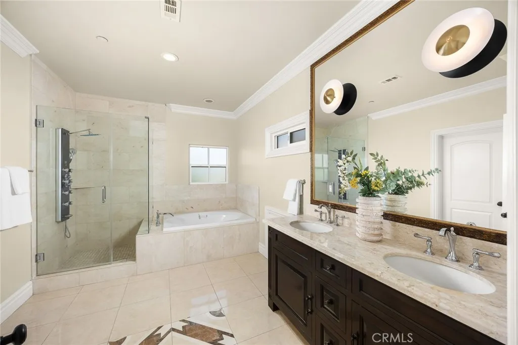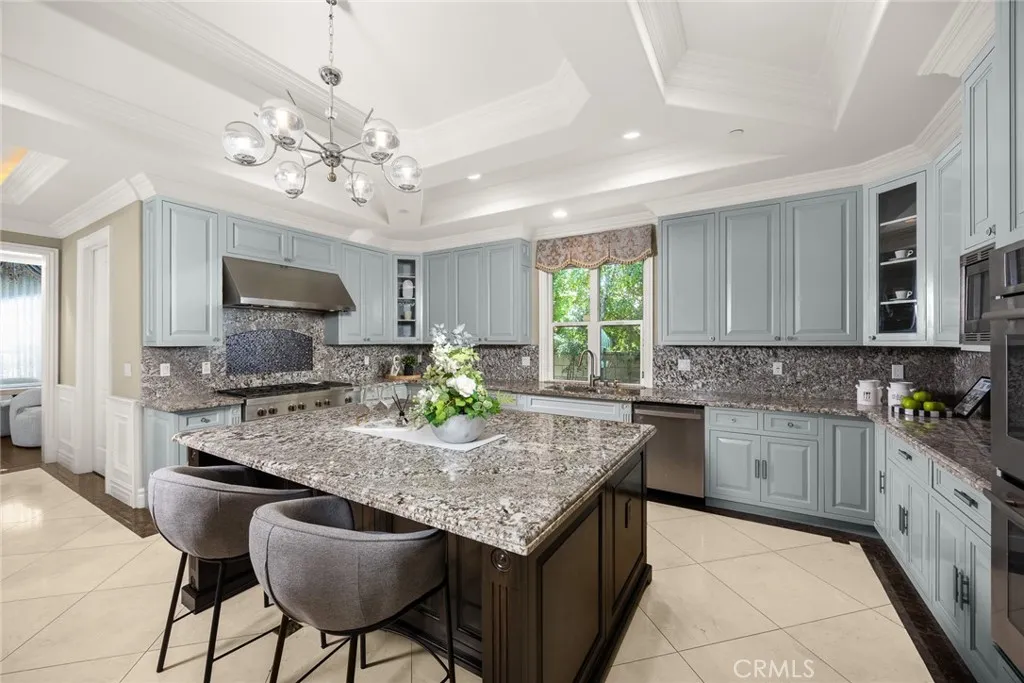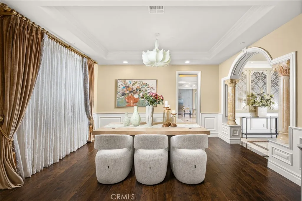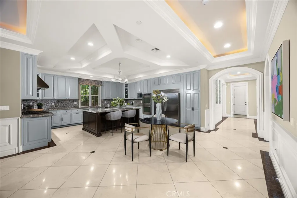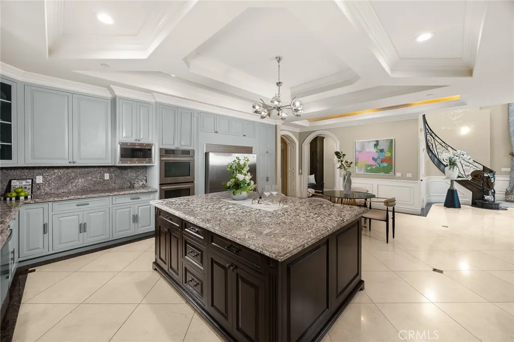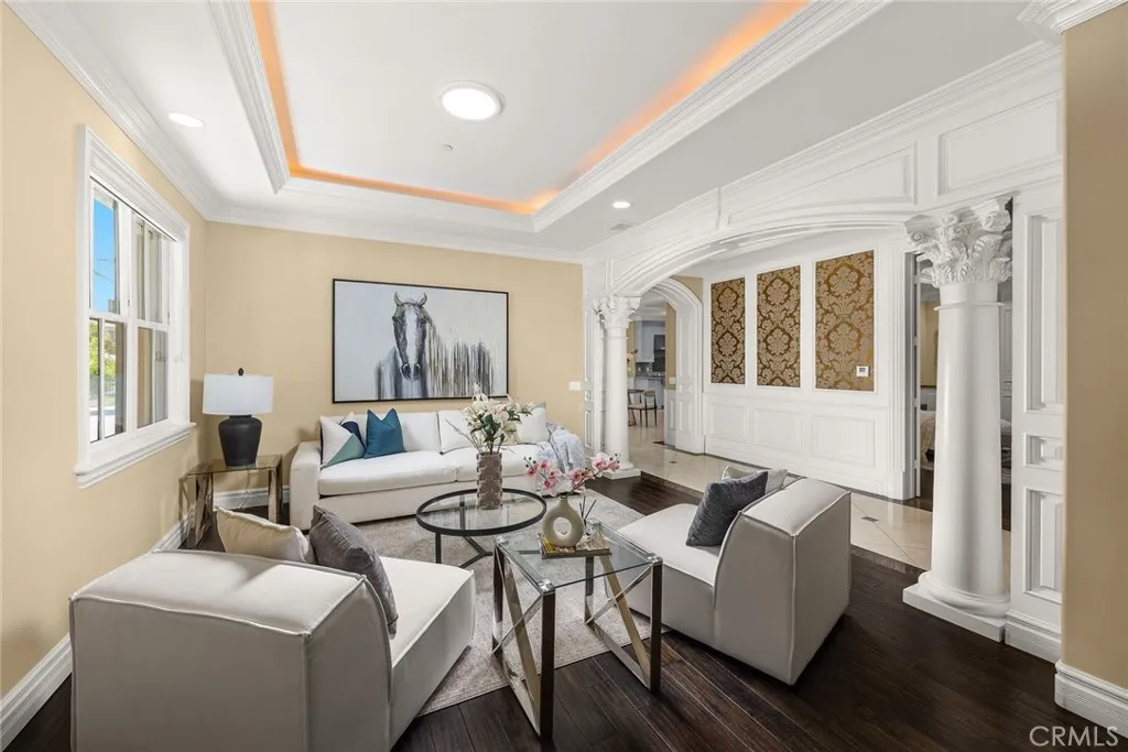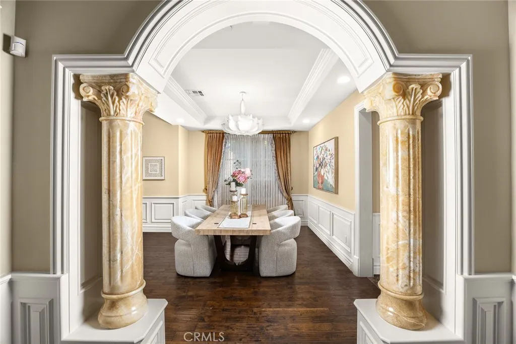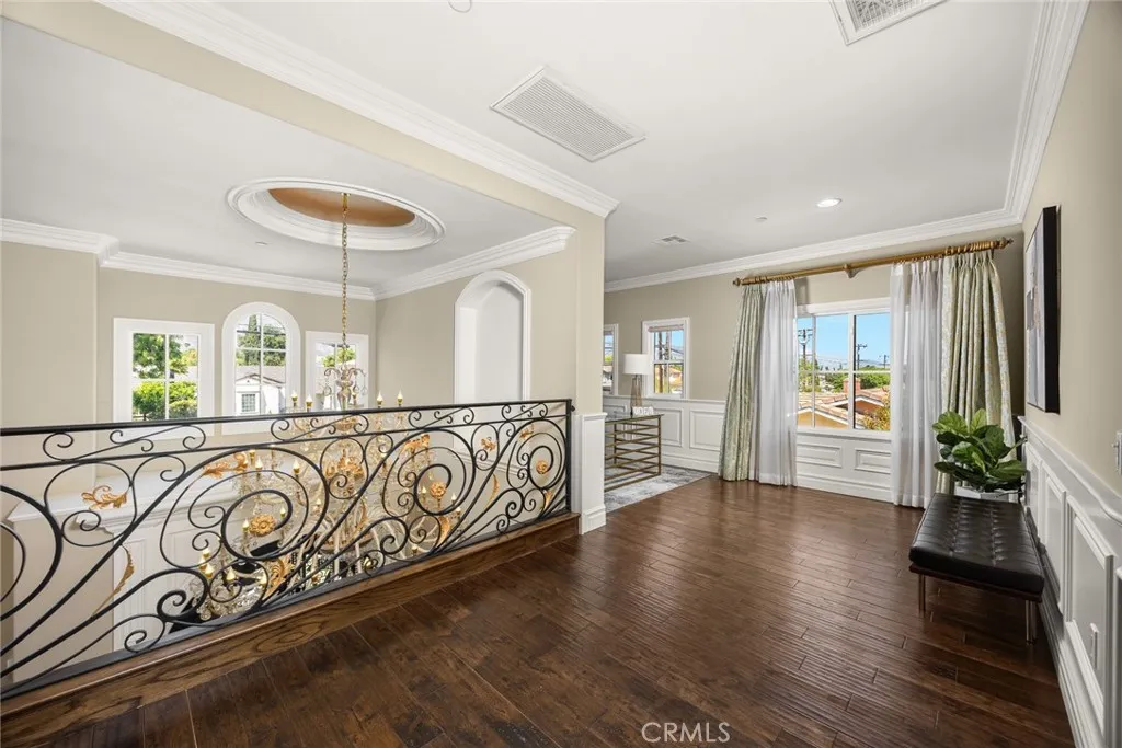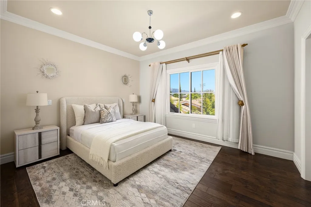 Elegant Mediterranean-style residence located in the highly desirable Baldwin Stocker district of Arcadia, offering 5 bedrooms, 5 bathrooms, and approximately 5,000 SF of living space. Built in 2016, this custom home features a dramatic 25-foot ceiling entry with a 10-foot arched iron and glass double door. The bright living room includes a stone fireplace and soaring windows, while the formal dining room is enhanced by onyx Roman columns and an expansive bar area. The gourmet kitchen offers a center island, abundant cabinetry, a dedicated wok kitchen, additional refrigerator space, and a breakfast nook. The spacious family room is ideal for entertaining or everyday living. The main-level primary suite features a walk-in closet, dual vanities, soaking tub, and oversized shower. Upstairs includes a second primary en-suite with private balcony, an open office area, and additional bedrooms with a Jack-and-Jill bathroom.Additional highlights include solar panels, attached 2-car garage with direct access, an additional 1-car garage, and gated driveway. Low-maintenance backyard and side yard provide comfortable outdoor space. Conveniently located near award-winning Arcadia schools, supermarkets, dining, and shopping. A rare opportunity to own a newer custom home in one of Arcadia’s most sought-after neighborhoods.