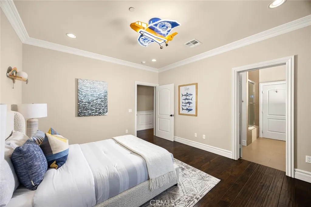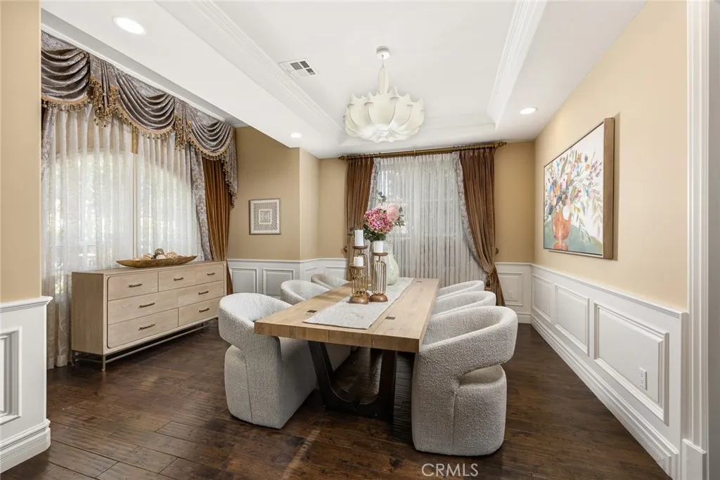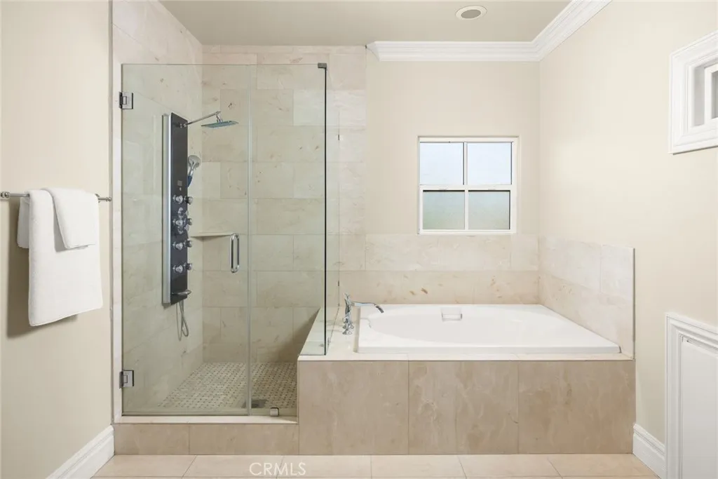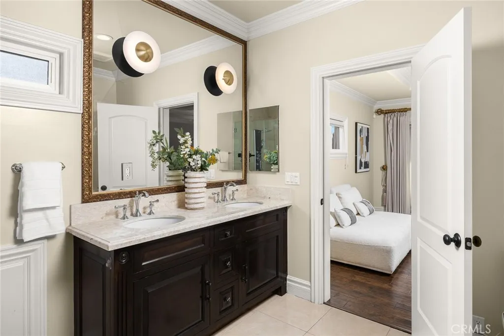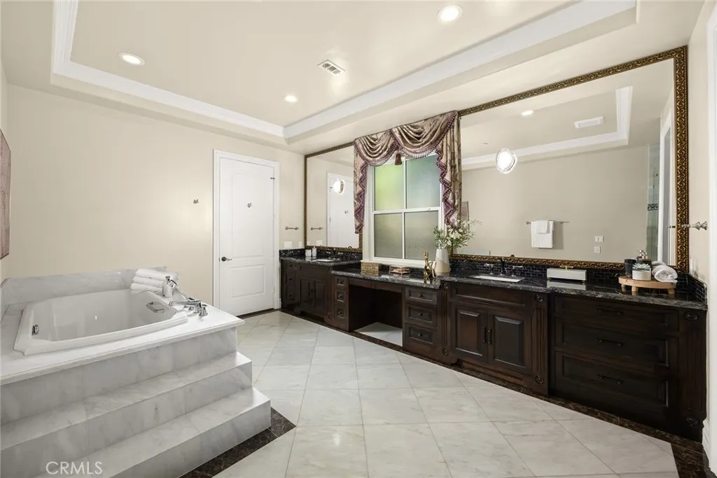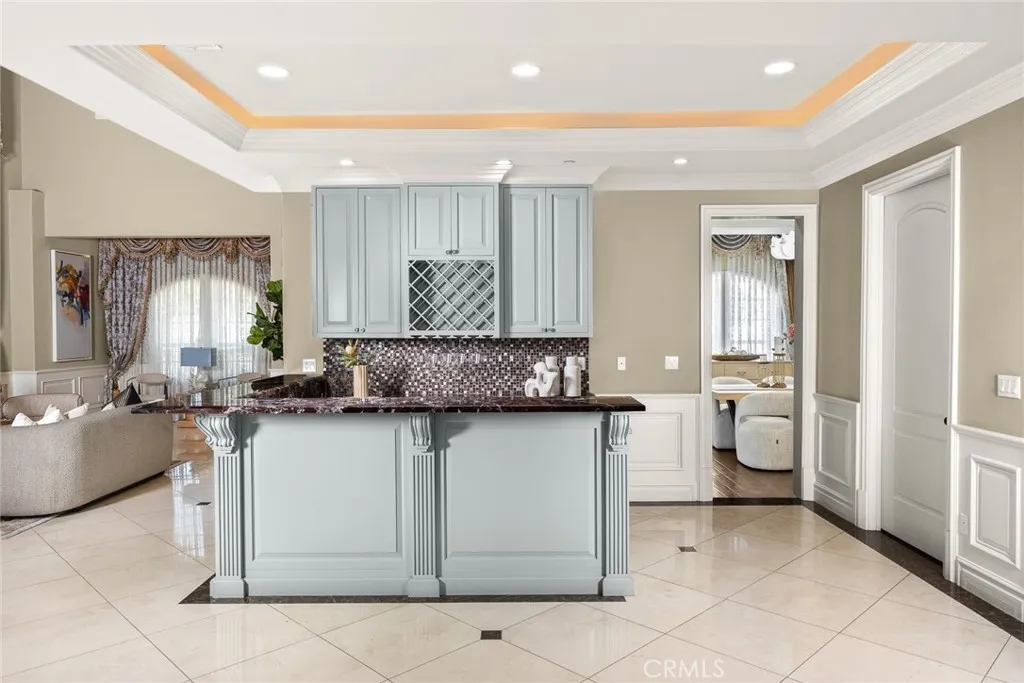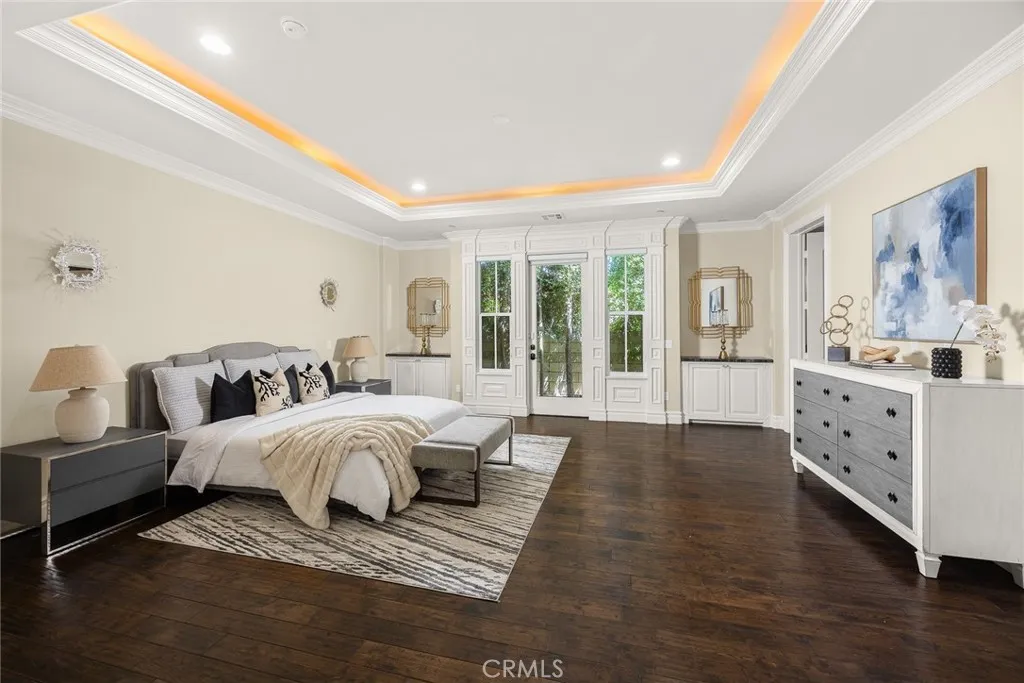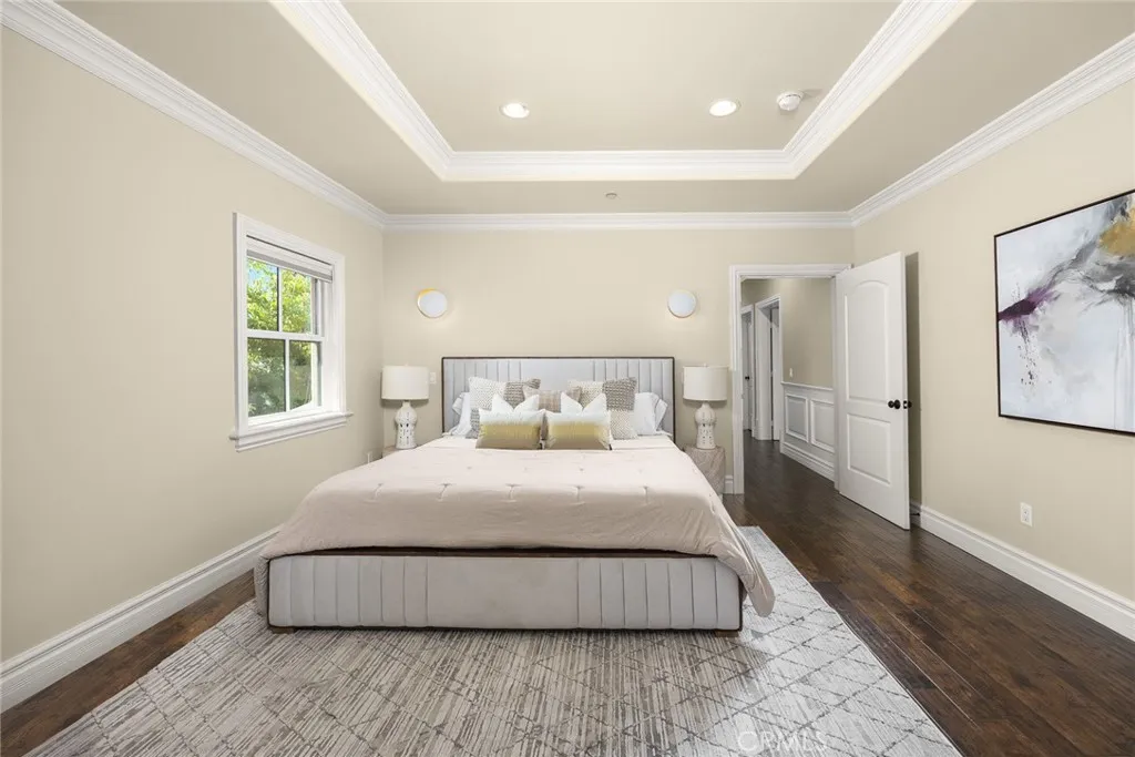 Elegant Mediterranean-style residence located in the highly desirable Baldwin Stocker district of Arcadia, offering 5 bedrooms, 5 bathrooms, and approximately 5,000 SF of living space. Built in 2016, this custom home features a dramatic 25-foot ceiling entry with a 10-foot arched iron and glass double door. The bright living room includes a stone fireplace and soaring windows, while the formal dining room is enhanced by onyx Roman columns and an expansive bar area. The gourmet kitchen offers a center island, abundant cabinetry, a dedicated wok kitchen, additional refrigerator space, and a breakfast nook. The spacious family room is ideal for entertaining or everyday living. The main-level primary suite features a walk-in closet, dual vanities, soaking tub, and oversized shower. Upstairs includes a second primary en-suite with private balcony, an open office area, and additional bedrooms with a Jack-and-Jill bathroom.Additional highlights include solar panels, attached 2-car garage with direct access, an additional 1-car garage, and gated driveway. Low-maintenance backyard and side yard provide comfortable outdoor space. Conveniently located near award-winning Arcadia schools, supermarkets, dining, and shopping. A rare opportunity to own a newer custom home in one of Arcadia’s most sought-after neighborhoods.