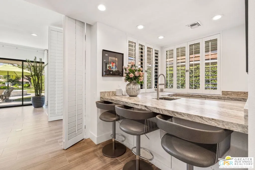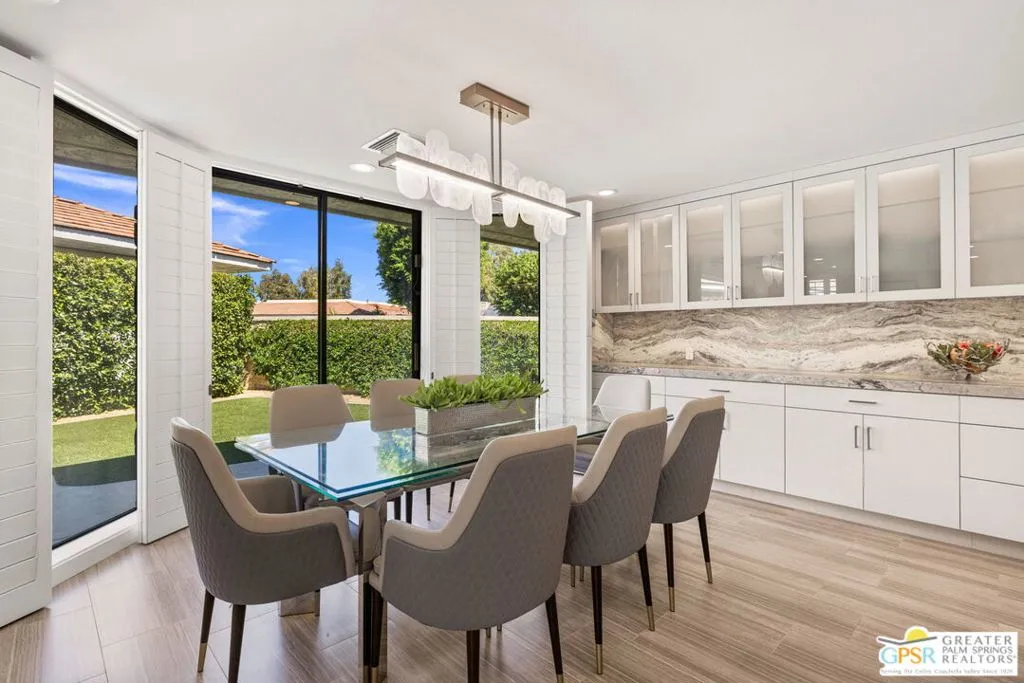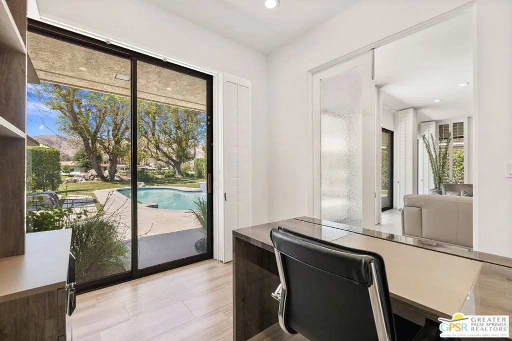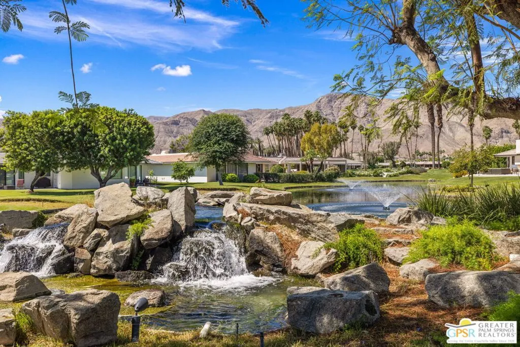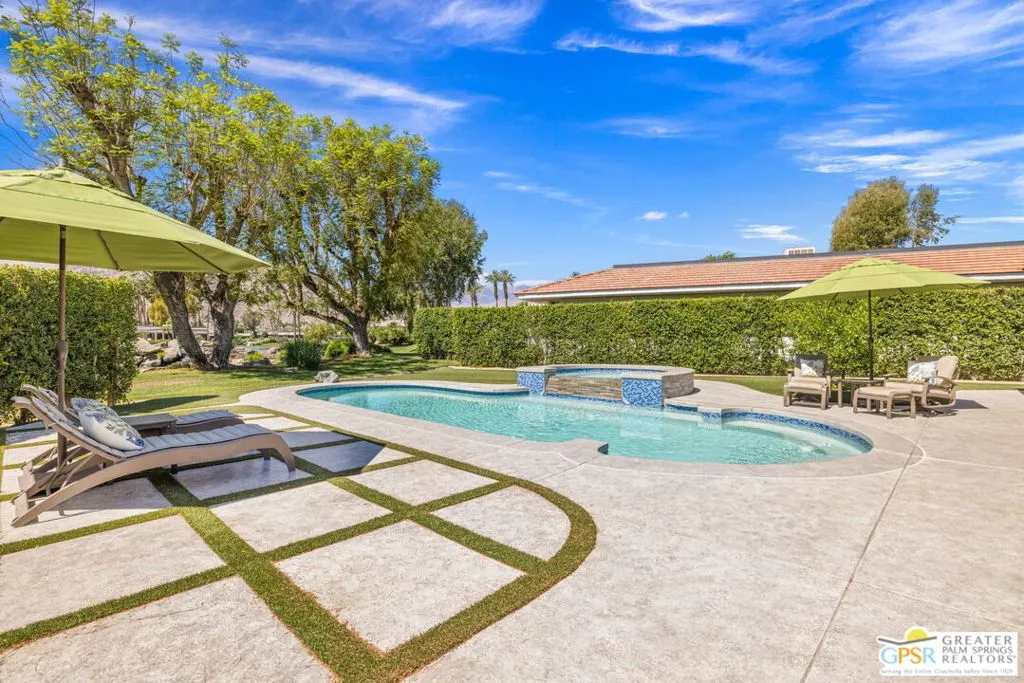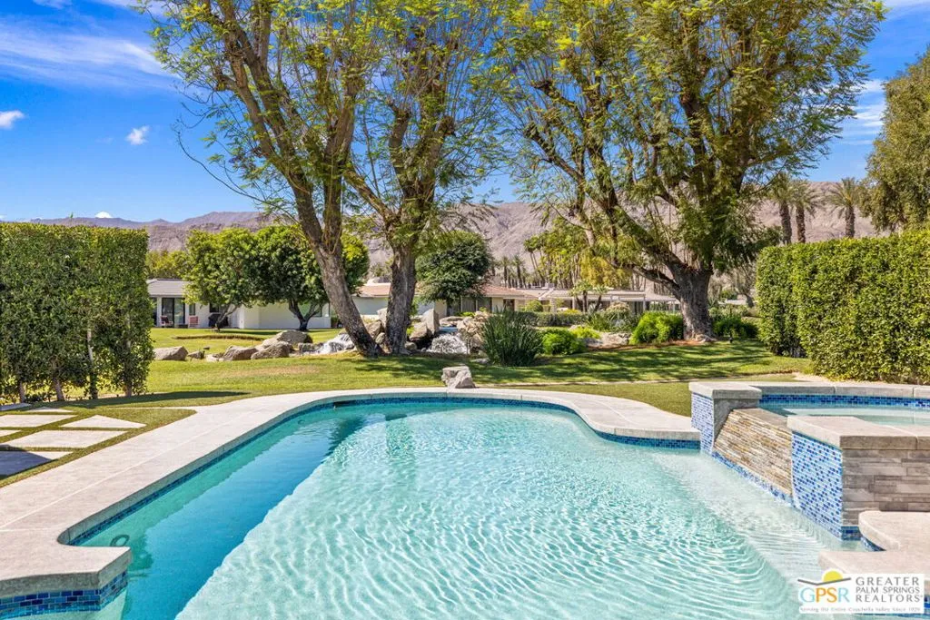 Perfectly positioned on a premier south-facing lot at The Club at Morningside, this extensively renovated Oakmont III residence captures sweeping views of the lake, fountains, waterfalls, and surrounding mountains creating a true resort-style setting in the heart of Rancho Mirage. A private courtyard with custom gates and dual entry doors sets up a refined tone, leading to a formal entry and light-filled open floor plan designed for both everyday living and elevated entertaining. Walls of glass frame the views and create seamless indoor/outdoor flow to the spectacular backyard anchored by a saline pool and spa. At the center of the home, the gourmet kitchen delivers both form and function with premium cabinetry, stone countertops, and a top-tier appliance suite including Wolf range, Sub-Zero refrigeration, and Viking ice maker - opening to dining and living areas that connect effortlessly to the outdoors. A wet bar with wine and beverage refrigeration enhances the home's entertaining appeal. The south-facing living room with fireplace opens to the backyard, complemented by a private office with inspiring views. The Primary Suite is a true retreat with outdoor access, stunning views, and the rare luxury of DUAL private ensuite baths. Junior Ensuites Two and Three are thoughtfully separated, each with private baths and outdoor access. Completely renovated in 2021, the home showcases new porcelain tile flooring, updated cabinetry and countertops throughout, redesigned baths with new tile showers, upgraded lighting, new air ducts, and modernized systems. Outdoor improvements include a saltwater pool conversion with new tile and PebbleTec, added spa with Pentair system, expanded hardscape, synthetic turf, and cool deck surfaces. Additional upgrades include owned solar (2022), a new roof (2025), and new HVAC systems (2025)delivering both efficiency and peace of mind. A two-car garage plus golf cart garage with epoxy flooring and upgraded systems completes the offering. A rare combination of premier lot, south-facing orientation, extensive renovation, and timeless design - this is elevated desert living at its finest.
