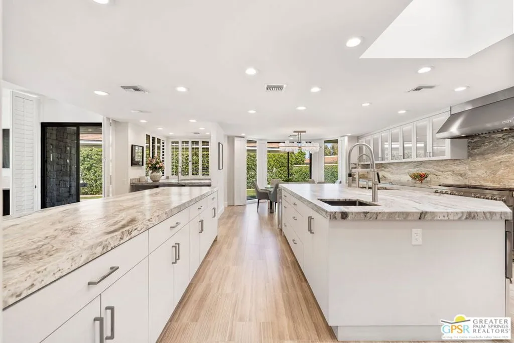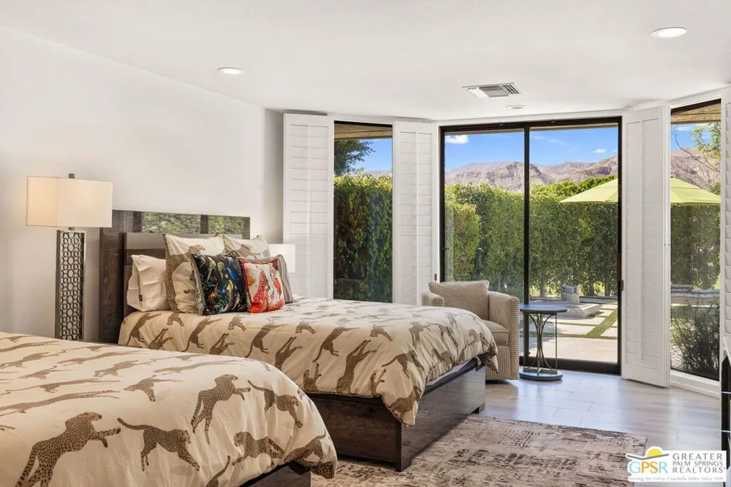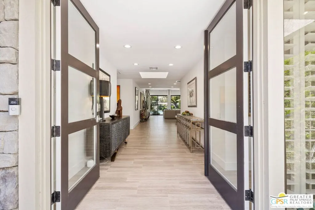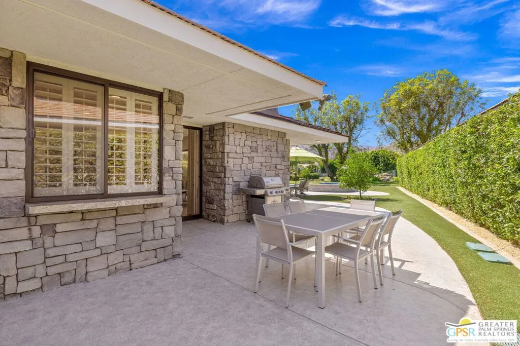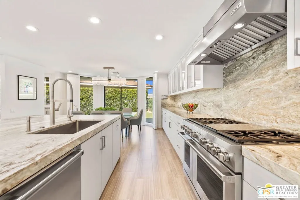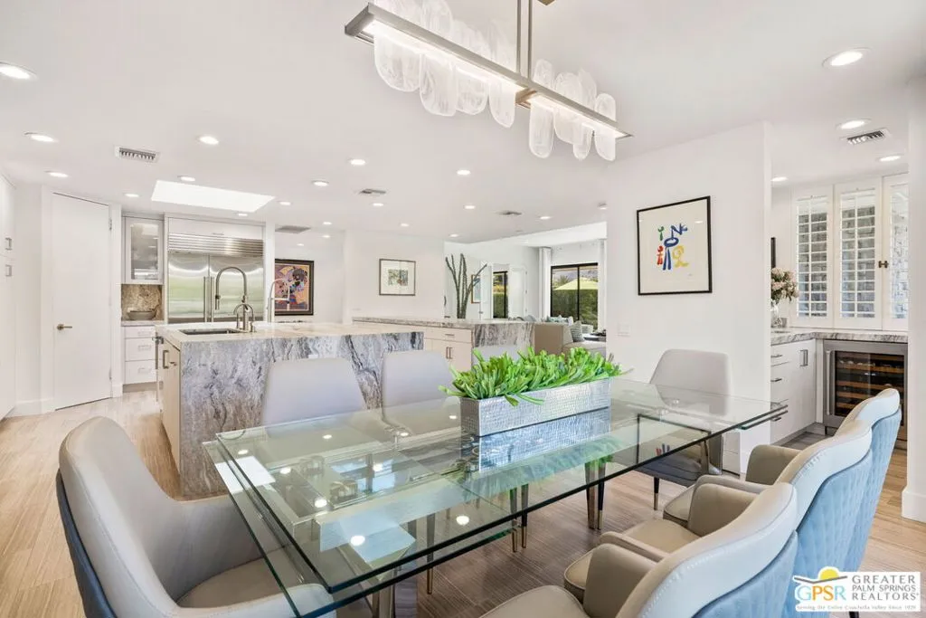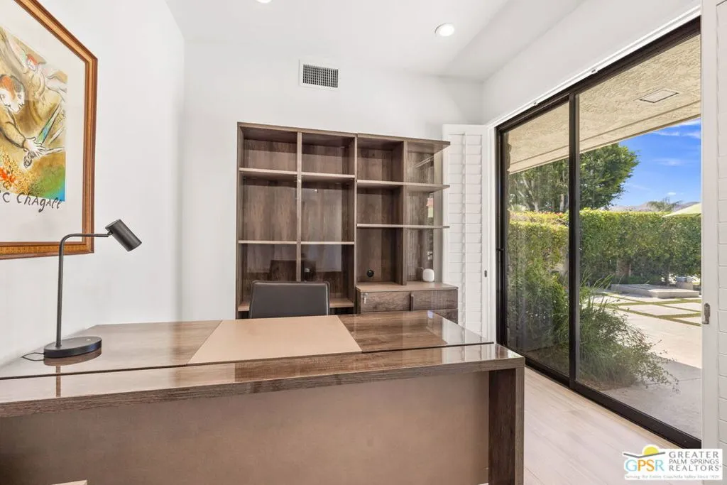 Perfectly positioned on a premier south-facing lot at The Club at Morningside, this extensively renovated Oakmont III residence captures sweeping views of the lake, fountains, waterfalls, and surrounding mountains creating a true resort-style setting in the heart of Rancho Mirage. A private courtyard with custom gates and dual entry doors sets up a refined tone, leading to a formal entry and light-filled open floor plan designed for both everyday living and elevated entertaining. Walls of glass frame the views and create seamless indoor/outdoor flow to the spectacular backyard anchored by a saline pool and spa. At the center of the home, the gourmet kitchen delivers both form and function with premium cabinetry, stone countertops, and a top-tier appliance suite including Wolf range, Sub-Zero refrigeration, and Viking ice maker - opening to dining and living areas that connect effortlessly to the outdoors. A wet bar with wine and beverage refrigeration enhances the home's entertaining appeal. The south-facing living room with fireplace opens to the backyard, complemented by a private office with inspiring views. The Primary Suite is a true retreat with outdoor access, stunning views, and the rare luxury of DUAL private ensuite baths. Junior Ensuites Two and Three are thoughtfully separated, each with private baths and outdoor access. Completely renovated in 2021, the home showcases new porcelain tile flooring, updated cabinetry and countertops throughout, redesigned baths with new tile showers, upgraded lighting, new air ducts, and modernized systems. Outdoor improvements include a saltwater pool conversion with new tile and PebbleTec, added spa with Pentair system, expanded hardscape, synthetic turf, and cool deck surfaces. Additional upgrades include owned solar (2022), a new roof (2025), and new HVAC systems (2025)delivering both efficiency and peace of mind. A two-car garage plus golf cart garage with epoxy flooring and upgraded systems completes the offering. A rare combination of premier lot, south-facing orientation, extensive renovation, and timeless design - this is elevated desert living at its finest.