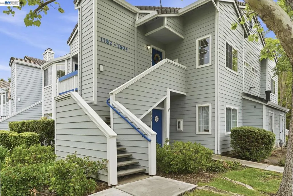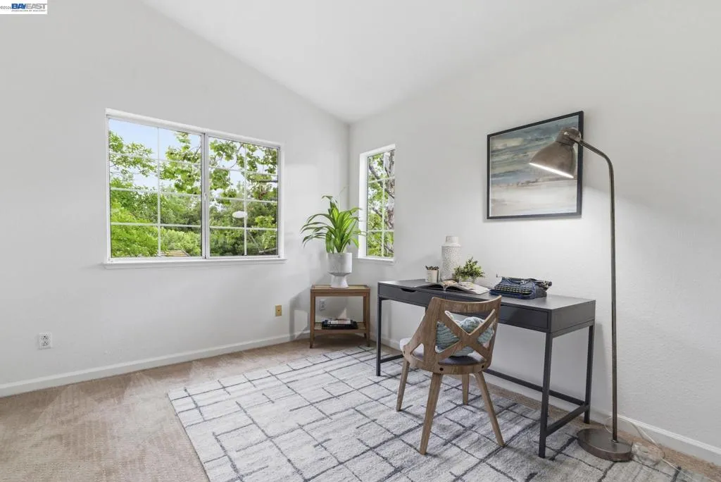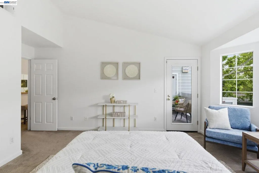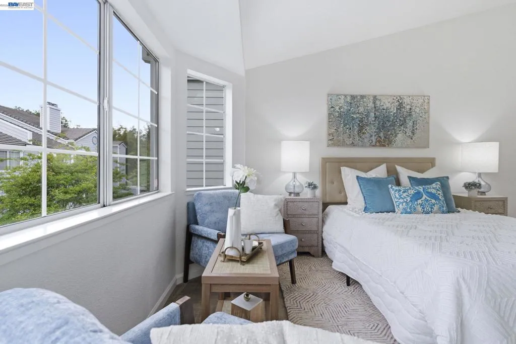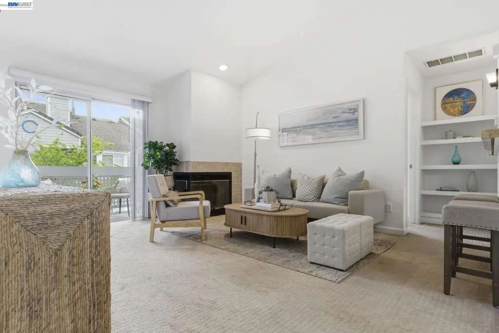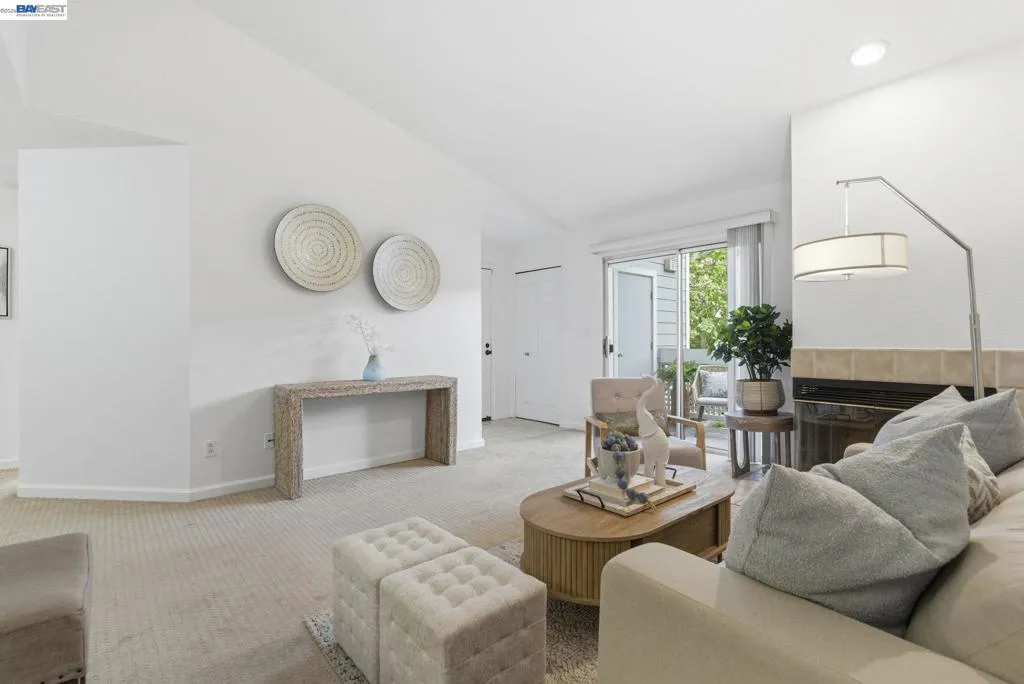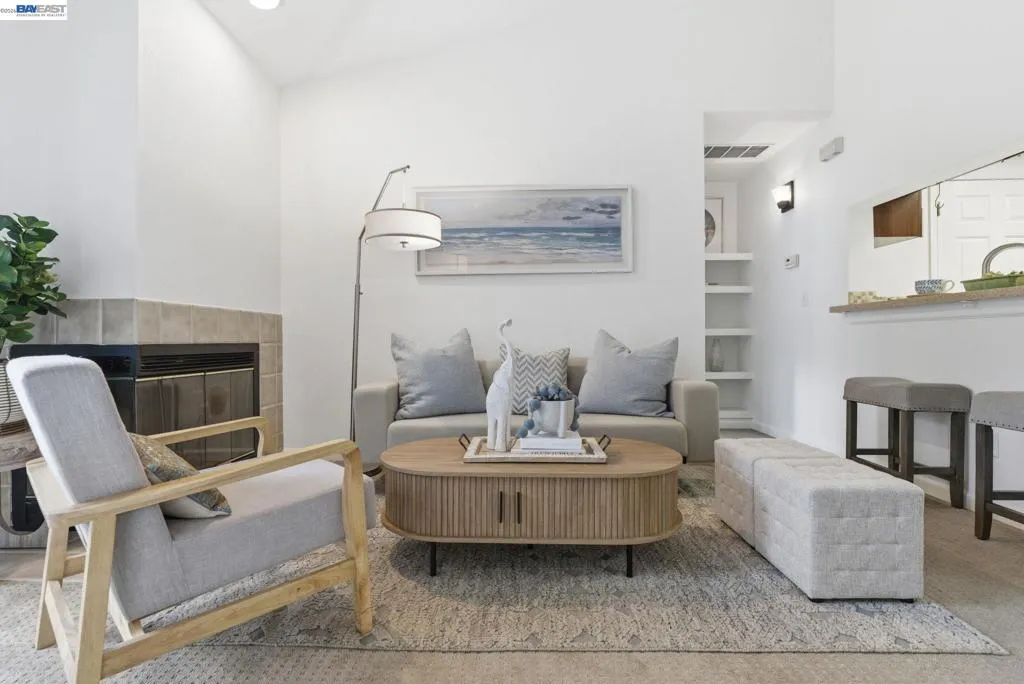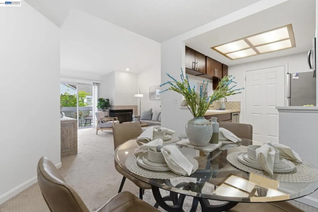Tucked away in a peaceful setting, this beautifully updated, freshly painted second-story end unit condo at 1792 Bevin Brook Dr offers 2 bedrooms, 2 bathrooms, and 955 square feet of thoughtfully designed living space. Featuring plush carpet throughout and dual pane windows, the home welcomes you with vaulted ceilings that create a bright, airy feel from the moment you walk in. The open-concept layout seamlessly connects the kitchen, dining area, and living room, making it easy to cook, entertain, and stay connected all at once. A cozy fireplace anchors the living room, adding warmth and charm. The kitchen includes a convenient bar seating area, perfect for casual meals or hosting, along with stainless steel appliances, while the dining space offers flexibility for everyday living or gatherings. The primary suite is a true retreat, complete with vaulted ceilings, a charming alcove perfect for a reading nook or workspace, and direct access to the balcony through a full-lite glass door overlooking a serene greenbelt, an ideal spot to relax and unwind. The second bedroom and full bath provide comfortable accommodations for guests or a home office. Additional highlights include in-unit laundry, central heating and air conditioning, a detached one-car garage, and the privacy of an end-unit location. Combining comfort, natural light, and a functional layout, this condo offers an easy, low-maintenance lifestyle in a desirable San Jose setting close to commuter routes, shopping, dining, and everyday conveniences.