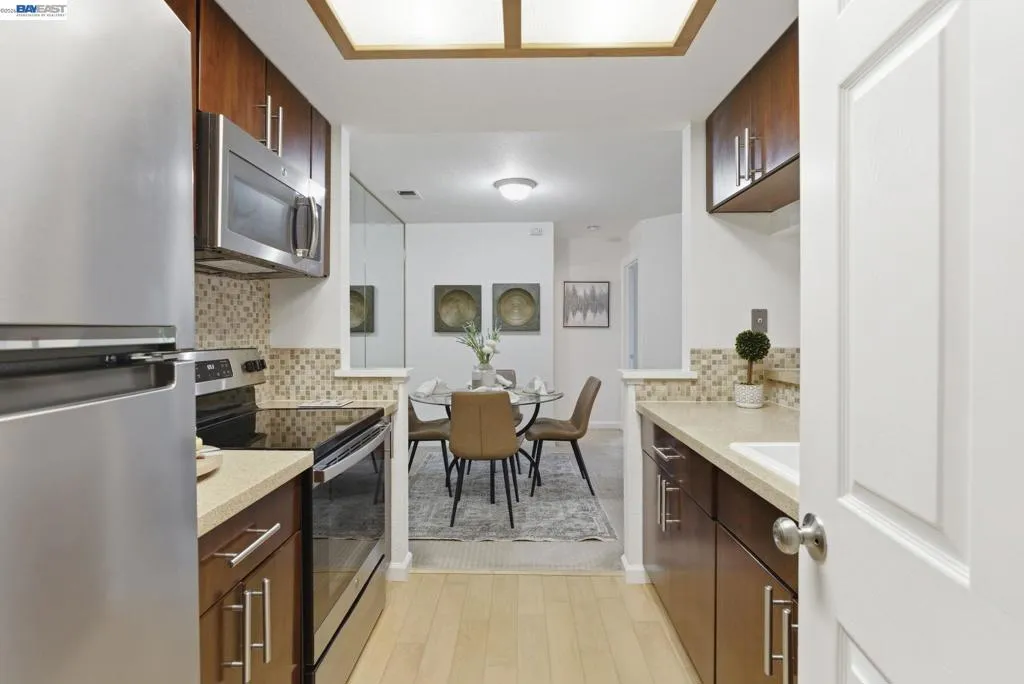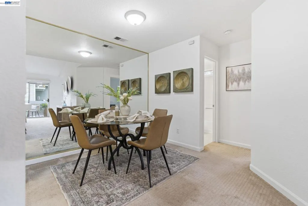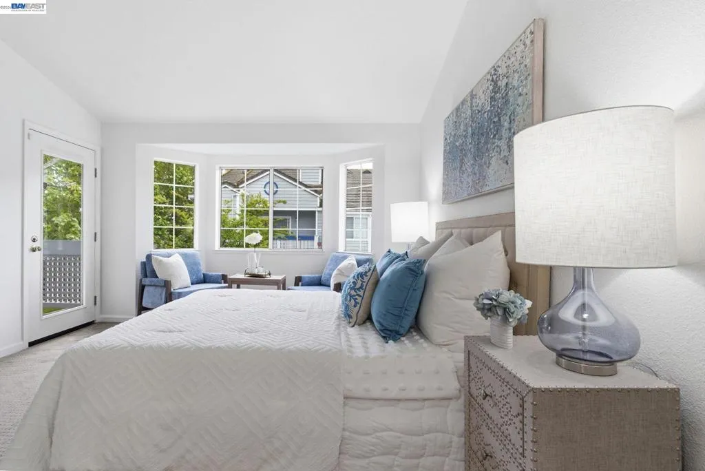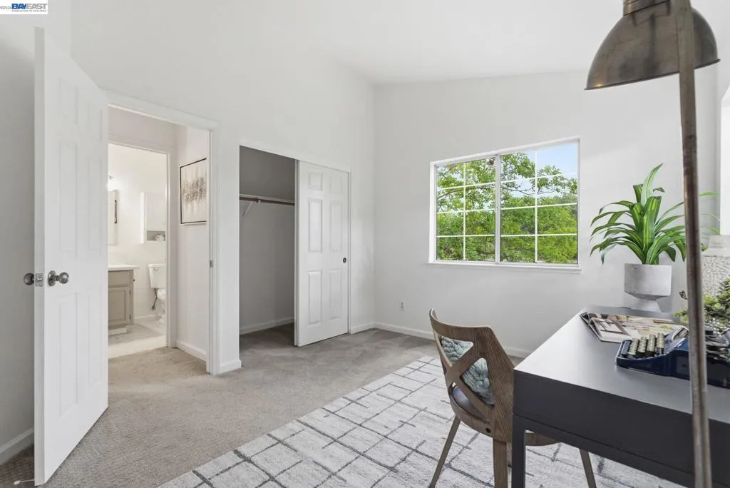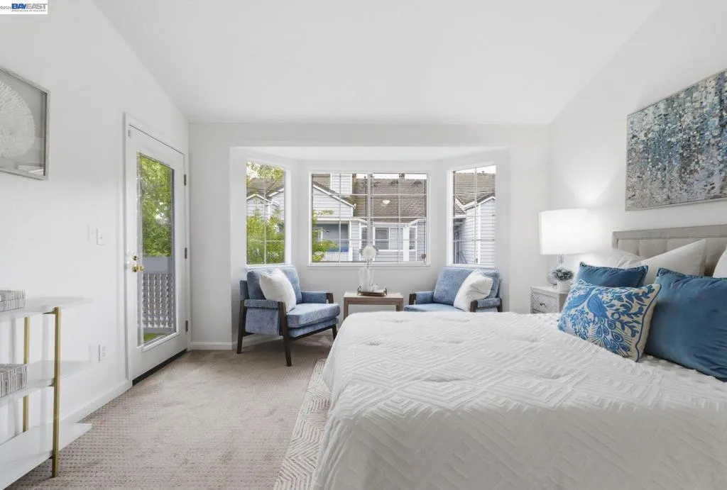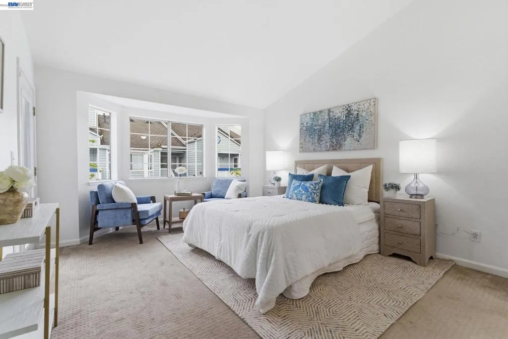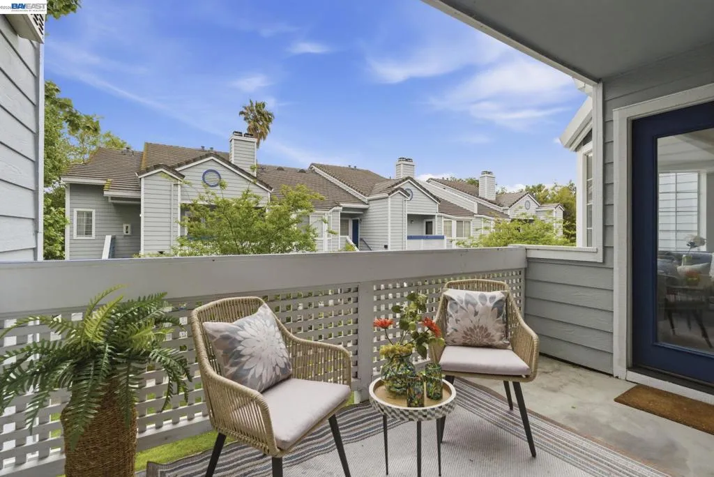 Tucked away in a peaceful setting, this beautifully updated, freshly painted second-story end unit condo at 1792 Bevin Brook Dr offers 2 bedrooms, 2 bathrooms, and 955 square feet of thoughtfully designed living space. Featuring plush carpet throughout and dual pane windows, the home welcomes you with vaulted ceilings that create a bright, airy feel from the moment you walk in. The open-concept layout seamlessly connects the kitchen, dining area, and living room, making it easy to cook, entertain, and stay connected all at once. A cozy fireplace anchors the living room, adding warmth and charm. The kitchen includes a convenient bar seating area, perfect for casual meals or hosting, along with stainless steel appliances, while the dining space offers flexibility for everyday living or gatherings. The primary suite is a true retreat, complete with vaulted ceilings, a charming alcove perfect for a reading nook or workspace, and direct access to the balcony through a full-lite glass door overlooking a serene greenbelt, an ideal spot to relax and unwind. The second bedroom and full bath provide comfortable accommodations for guests or a home office. Additional highlights include in-unit laundry, central heating and air conditioning, a detached one-car garage, and the privacy of an end-unit location. Combining comfort, natural light, and a functional layout, this condo offers an easy, low-maintenance lifestyle in a desirable San Jose setting close to commuter routes, shopping, dining, and everyday conveniences.