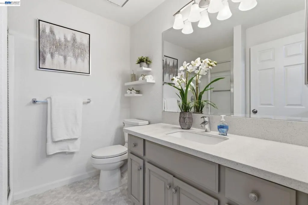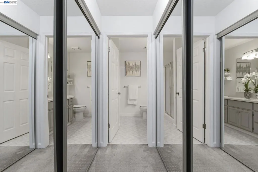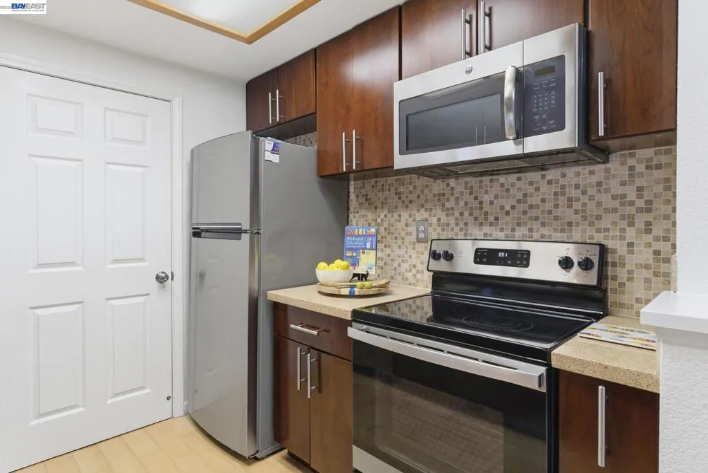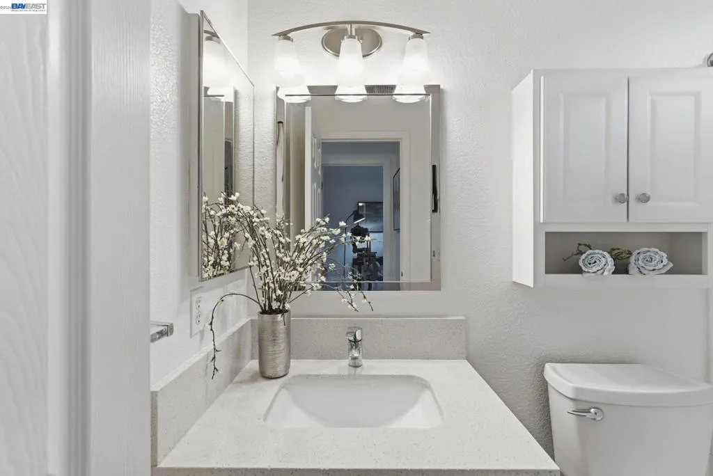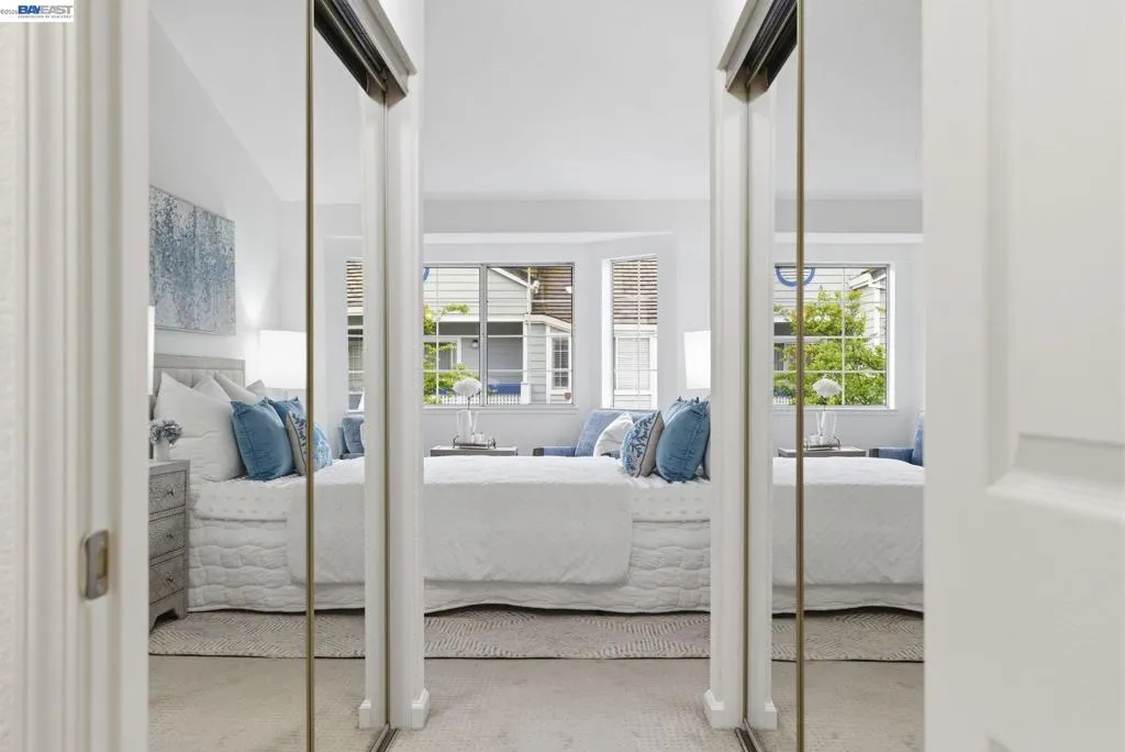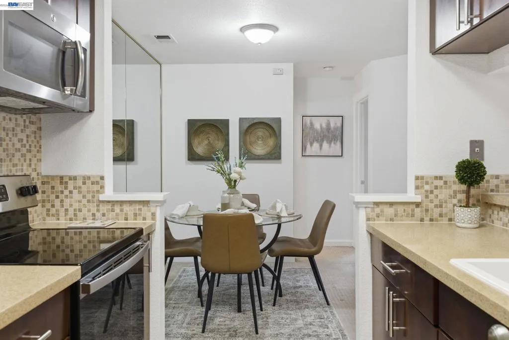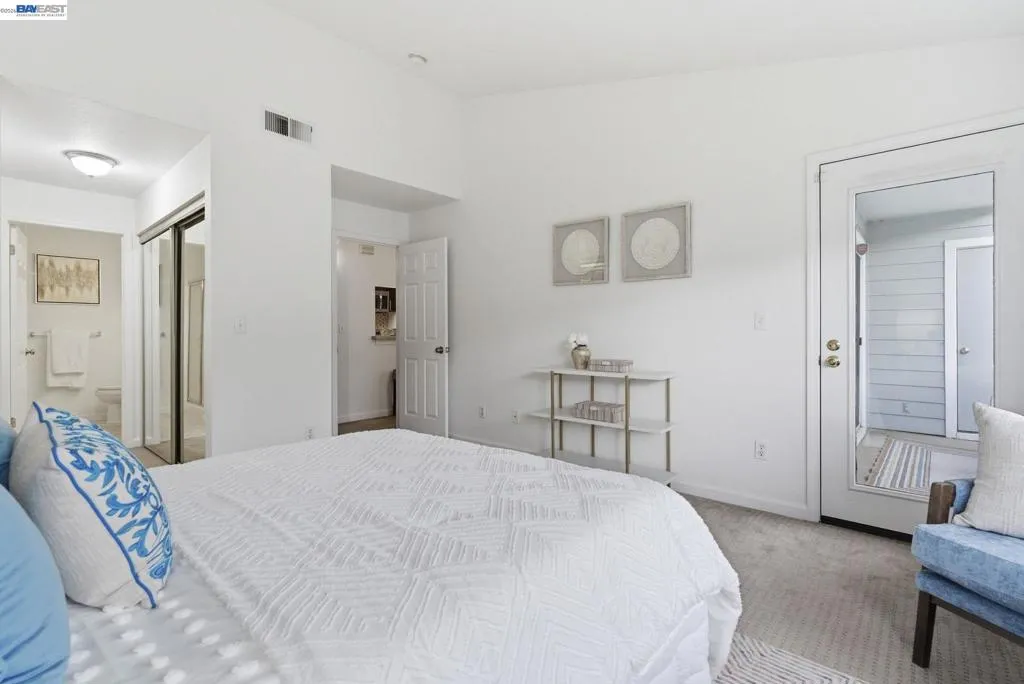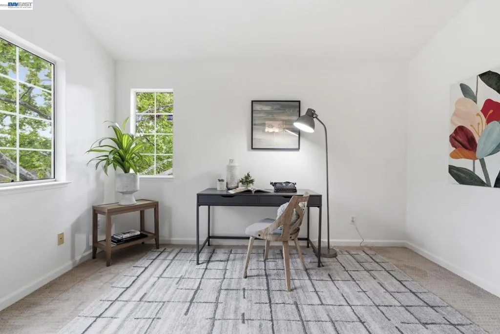Tucked away in a peaceful setting, this beautifully updated, freshly painted second-story end unit condo at 1792 Bevin Brook Dr offers 2 bedrooms, 2 bathrooms, and 955 square feet of thoughtfully designed living space. Featuring plush carpet throughout and dual pane windows, the home welcomes you with vaulted ceilings that create a bright, airy feel from the moment you walk in. The open-concept layout seamlessly connects the kitchen, dining area, and living room, making it easy to cook, entertain, and stay connected all at once. A cozy fireplace anchors the living room, adding warmth and charm. The kitchen includes a convenient bar seating area, perfect for casual meals or hosting, along with stainless steel appliances, while the dining space offers flexibility for everyday living or gatherings. The primary suite is a true retreat, complete with vaulted ceilings, a charming alcove perfect for a reading nook or workspace, and direct access to the balcony through a full-lite glass door overlooking a serene greenbelt, an ideal spot to relax and unwind. The second bedroom and full bath provide comfortable accommodations for guests or a home office. Additional highlights include in-unit laundry, central heating and air conditioning, a detached one-car garage, and the privacy of an end-unit location. Combining comfort, natural light, and a functional layout, this condo offers an easy, low-maintenance lifestyle in a desirable San Jose setting close to commuter routes, shopping, dining, and everyday conveniences.