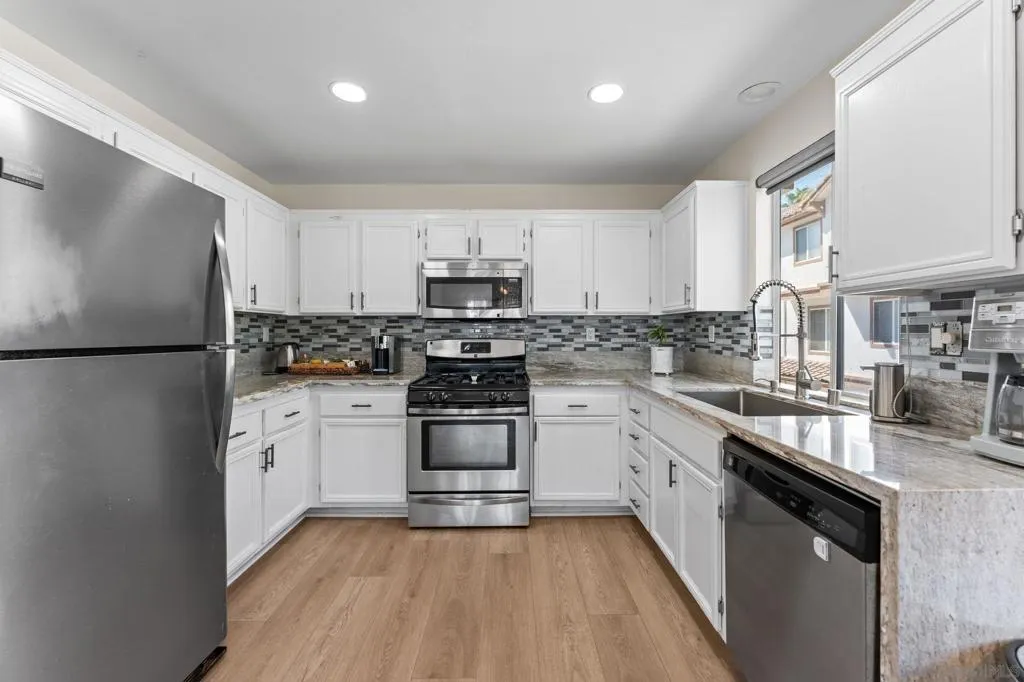 Welcome to this 3-bedroom, 2.5-bath corner townhome in the highly desirable Wateridge community of Sorrento Valley. Ideally positioned with only one shared wall and unobstructed surroundings, this home offers a rare sense of privacy along with a great balance of natural light throughout the day. This home has also undergone extensive renovations and upgrades, including a remodeled kitchen with quartz countertops, painted cabinetry, and recessed lighting, along with updated bathrooms featuring designer finishes, LED mirrors, and new vanities. Additional improvements include new LVP flooring, new carpet, updated closets with soft-close drawers, newer fans, and a newer water heater creating a clean, modern, move-in ready feel. Enjoy convenient access to the community pool just steps away, along with resort-style amenities including tennis courts, sand volleyball, greenbelt areas, and walking paths, perfect for an active and family friendly lifestyle. Located in the heart of Sorrento Valley, you’re just minutes from major tech and biotech hubs, UCSD, and some of San Diego’s best beaches. With easy access to I-5 and I-805, commuting is seamless.