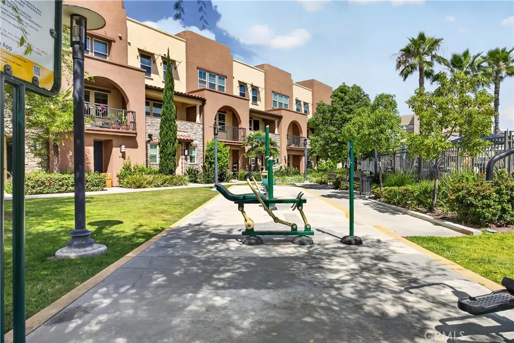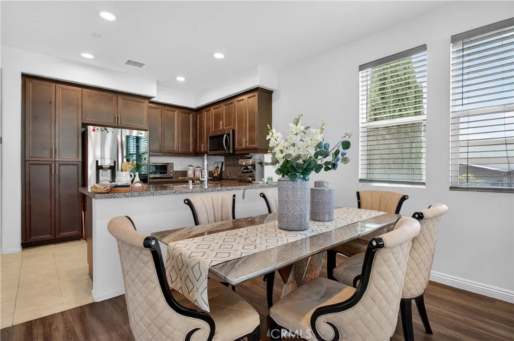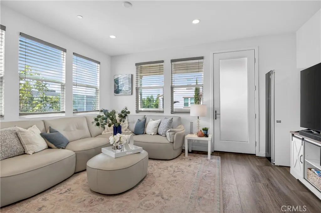This 2018-built townhome in the gated Stratapointe community offers a balanced mix of modern design and functional living. The interior is highlighted by high ceilings and an open layout, new laminate flooring installed just recently to ensure a seamless, move-in-ready experience. The home features a tri-level layout that provides excellent privacy and is located as an end unit. The ground floor features a secluded bedroom and full bath with direct access to the side-by-side two-car garage. On the second level, the main living area flows from the spacious living room to a covered balcony and a modern kitchen centered around a large island with stainless steel appliances. This floor also includes a versatile den or additional bedroom with its own full bathroom. The third level completes the home with a convenient laundry room and two ensuite bedrooms, including a primary suite with dual vanities and a walk-in closet. Equipped with solar panels and an Elan smart home system, the property is designed for efficiency and ease. Enjoy resort-style amenities such as a pool, spa, and playground with the benefit of low HOA dues and no Mello-Roos. Perfectly located near the 5 and 91 freeways, Buena Park Metrolink, and The Source, this home combines quality upgrades with an ideal location.
