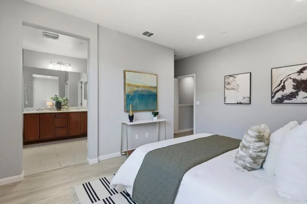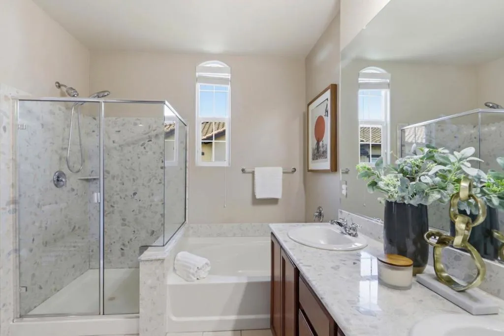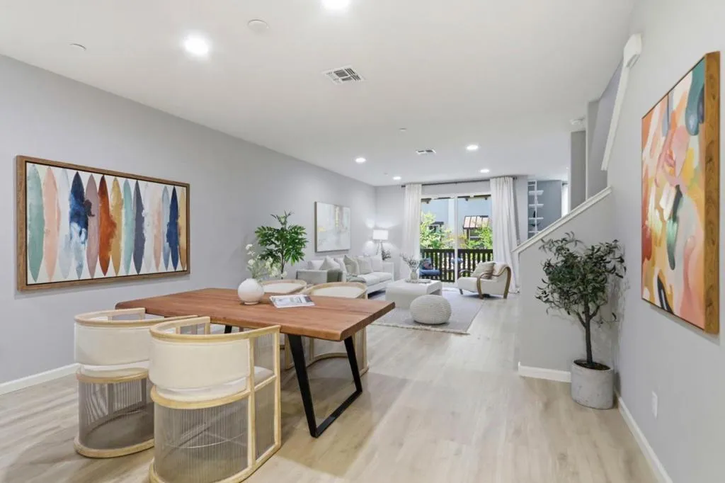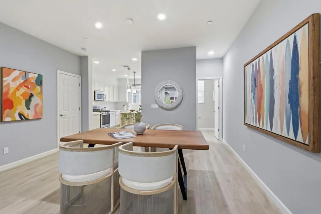 Located in San Jose, this 2,006 sq. ft. Low HOA home features 4 beds and 3.5 baths. Ground level has one bedroom suite with one full bathroom and connects to balcony. Upper level master suite with spacious walk in closet. The kitchen is equipped with a gas cooktop, quartz countertops, an island, pantry, dishwasher, microwave, oven range, refrigerator, exhaust fan, and garbage disposal, offering ample space for cooking and storage. Flooring throughout includes laminate and tile, complementing the home's central forced air heating and multi-zone central AC. The primary bedroom includes a walk-in closet and a bathroom with double sinks, a stall shower, and a tub. Laundry facilities with inside washer and dryer are situated in the utility room. The property includes a two-car garage with electric vehicle Level 2 (240V) hookup. The home is part of the Berryessa Union Elementary School District and sits on a 765 sq. ft. lot. Other features include double-pane windows, a tankless water heater, and high ceilings. The family room and kitchen are combined for an open layout, with a dining area in the living room. Many extra parking spaces on the site. Easy commute to high tech firms and Bart Station. Walk to Beautiful Vinci Park. Don't miss this beautiful home!