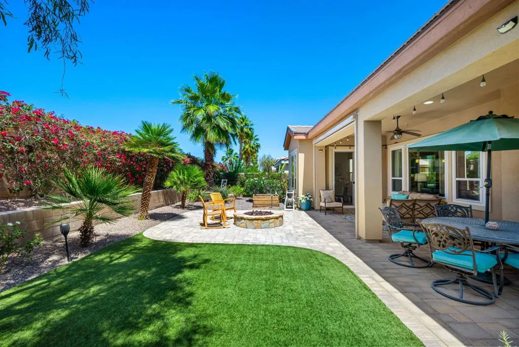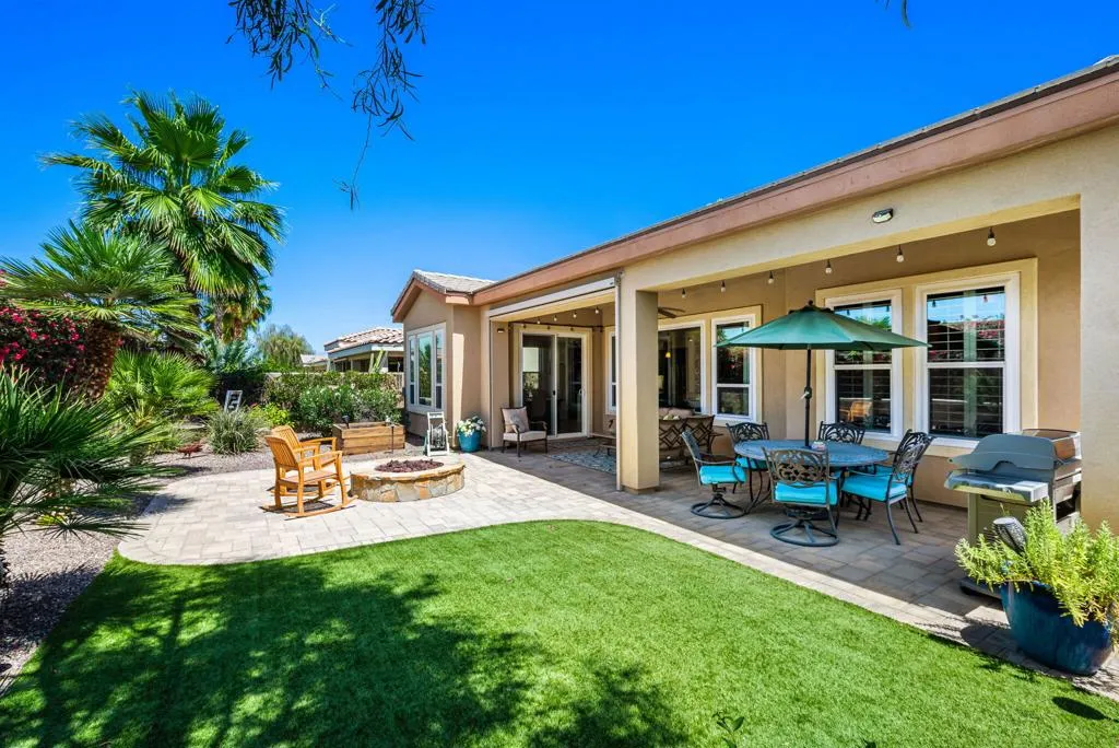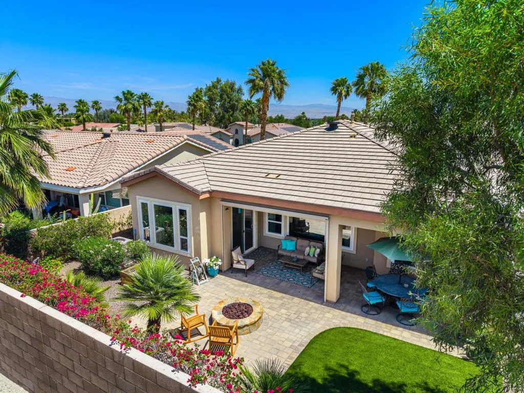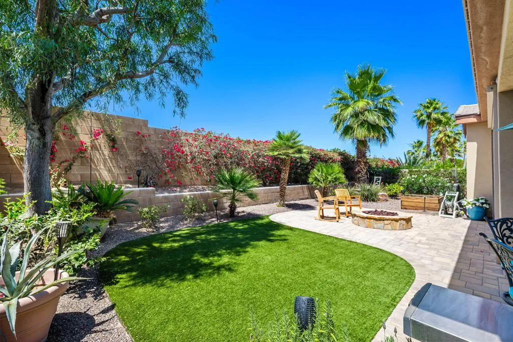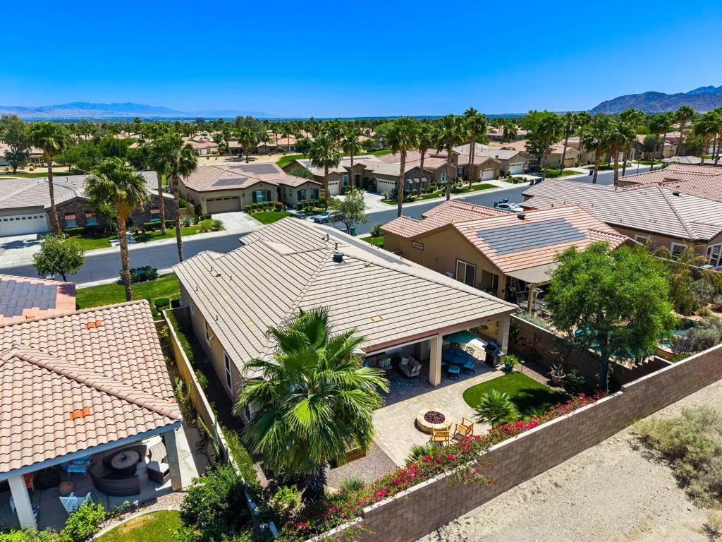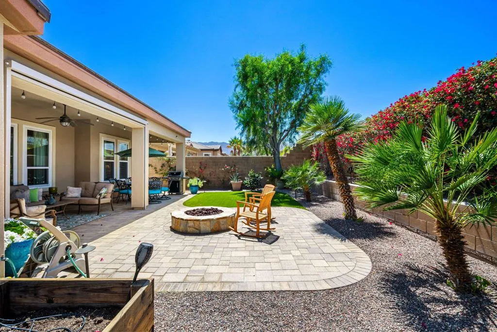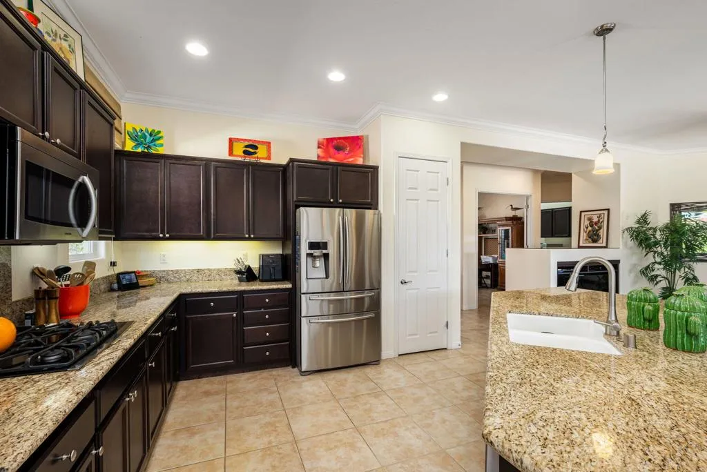Meticulously maintained and absolutely captivating, this Caspian plan with a charming Tuscan facade, and stunning western mountain views is truly a standout. Offering approximately 1,775 square feet of thoughtfully designed living space, this residence features 2 bedrooms, 2 baths, and a versatile den/office easily convertible to a third bedroom. Elegant upgrades abound, including crown molding, plantation shutters, and custom window coverings throughout. A striking etched-glass entry door welcomes you into a light-filled great room with a media niche, open-concept layout, and expansive windows that flood the home with natural light. The adjacent dining area flows seamlessly into a beautifully appointed chef's kitchen showcasing stainless steel appliances, built-in double ovens and microwave, gas cooktop, and a large prep island with pendant lighting and bullnose slab granite countertops, all complemented by rich espresso cabinetry with brushed nickel hardware and a convenient pantry. Guest quarters offer murphy bed for comfort and privacy with access to a full bath featuring a spacious tiled shower, while the primary suite serves as a serene retreat with dual vanities and a large glass-enclosed shower. Step outside to your private backyard oasis, complete with an expanded paver patio, covered outdoor living area, cozy fire pit, lush landscaping, and breathtaking mountain views. Ideally located just moments from the Santa Rosa Clubhouse and its world-class amenities, this exceptional home invites you to experience the best of Trilogy living--schedule your private showing today. Don't forget the extra garage bump out for the golf cart or storage.