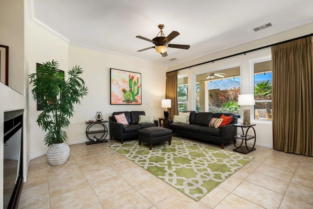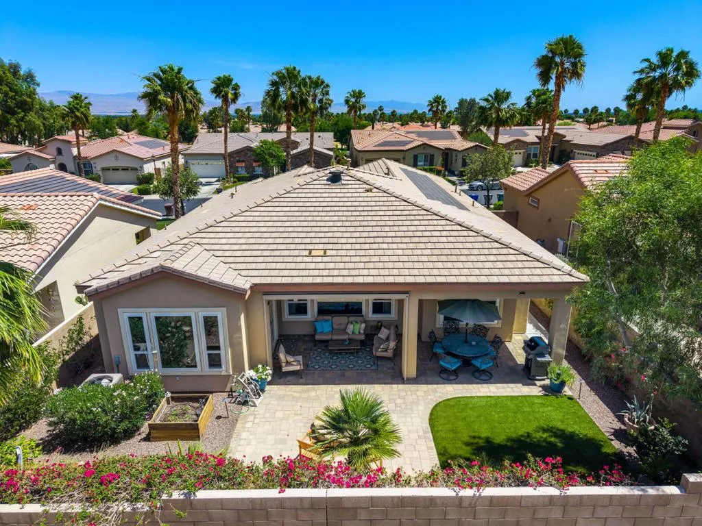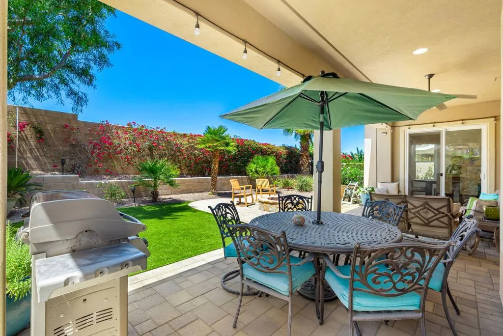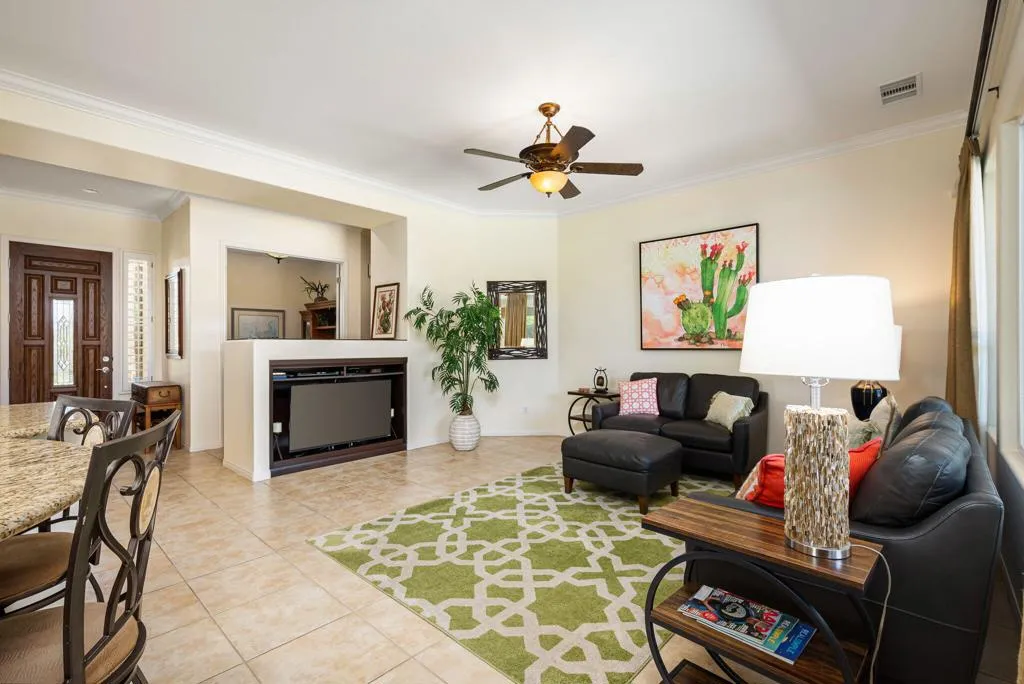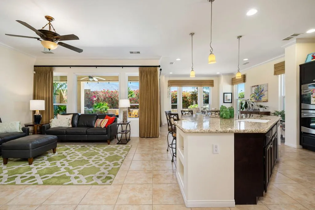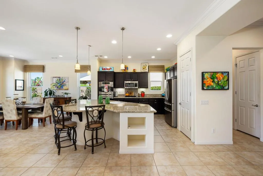 Meticulously maintained and absolutely captivating, this Caspian plan with a charming Tuscan facade, and stunning western mountain views is truly a standout. Offering approximately 1,775 square feet of thoughtfully designed living space, this residence features 2 bedrooms, 2 baths, and a versatile den/office easily convertible to a third bedroom. Elegant upgrades abound, including crown molding, plantation shutters, and custom window coverings throughout. A striking etched-glass entry door welcomes you into a light-filled great room with a media niche, open-concept layout, and expansive windows that flood the home with natural light. The adjacent dining area flows seamlessly into a beautifully appointed chef's kitchen showcasing stainless steel appliances, built-in double ovens and microwave, gas cooktop, and a large prep island with pendant lighting and bullnose slab granite countertops, all complemented by rich espresso cabinetry with brushed nickel hardware and a convenient pantry. Guest quarters offer murphy bed for comfort and privacy with access to a full bath featuring a spacious tiled shower, while the primary suite serves as a serene retreat with dual vanities and a large glass-enclosed shower. Step outside to your private backyard oasis, complete with an expanded paver patio, covered outdoor living area, cozy fire pit, lush landscaping, and breathtaking mountain views. Ideally located just moments from the Santa Rosa Clubhouse and its world-class amenities, this exceptional home invites you to experience the best of Trilogy living--schedule your private showing today. Don't forget the extra garage bump out for the golf cart or storage.