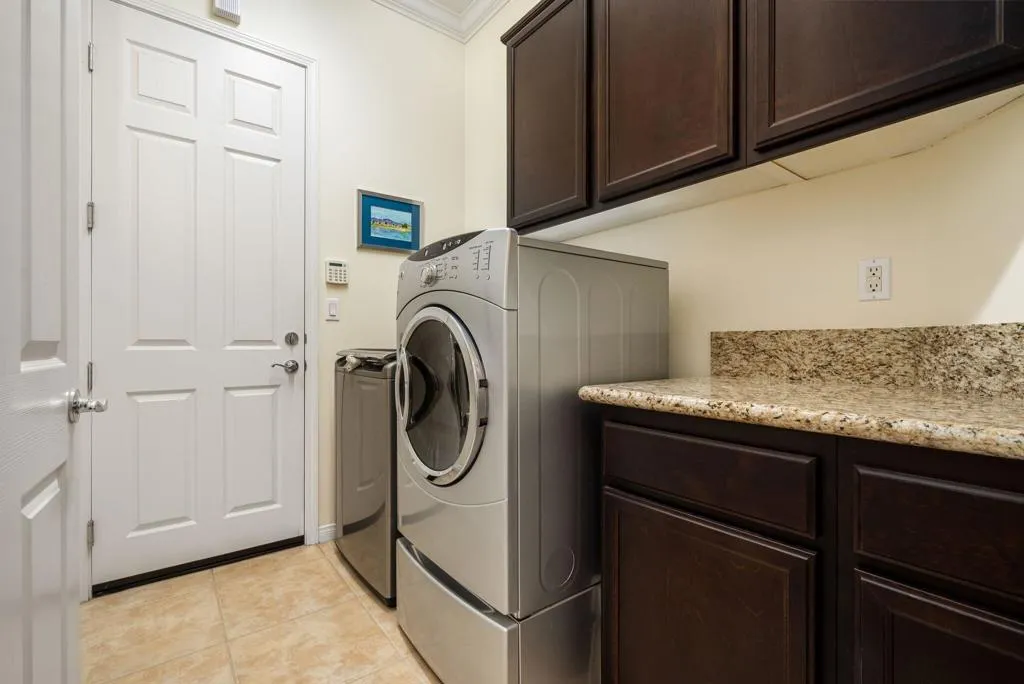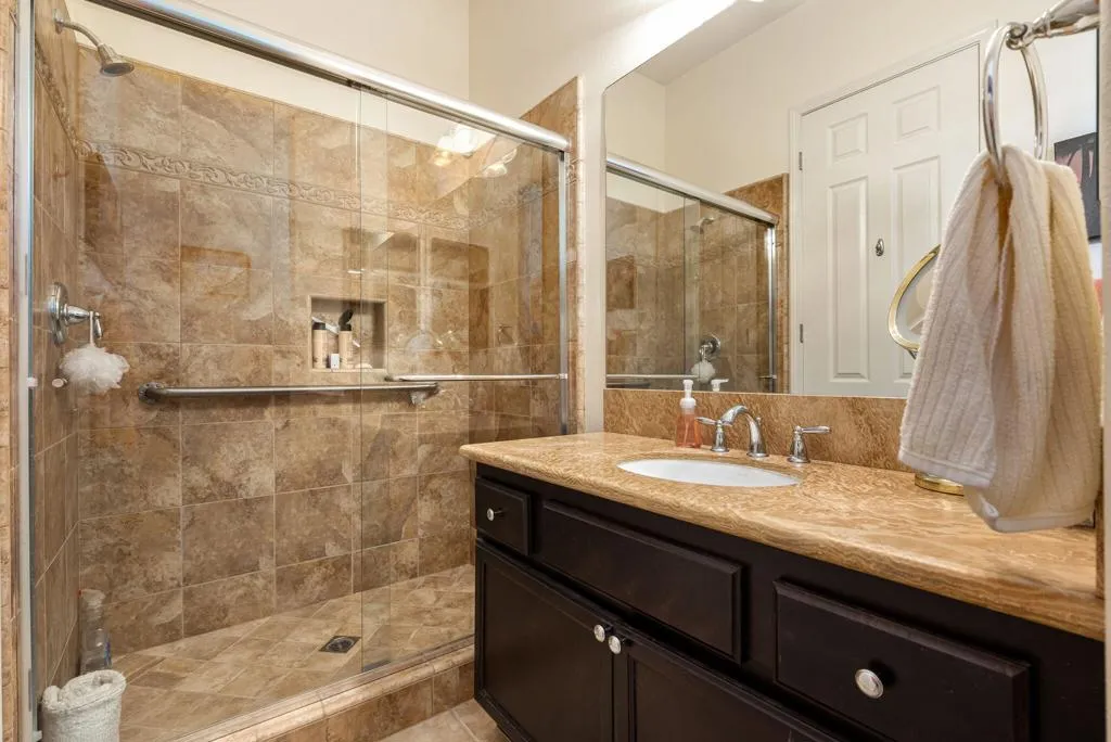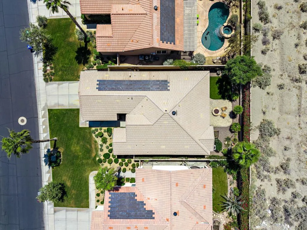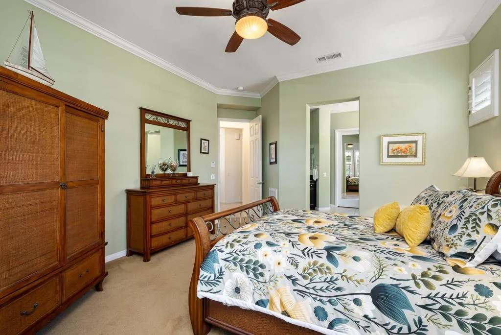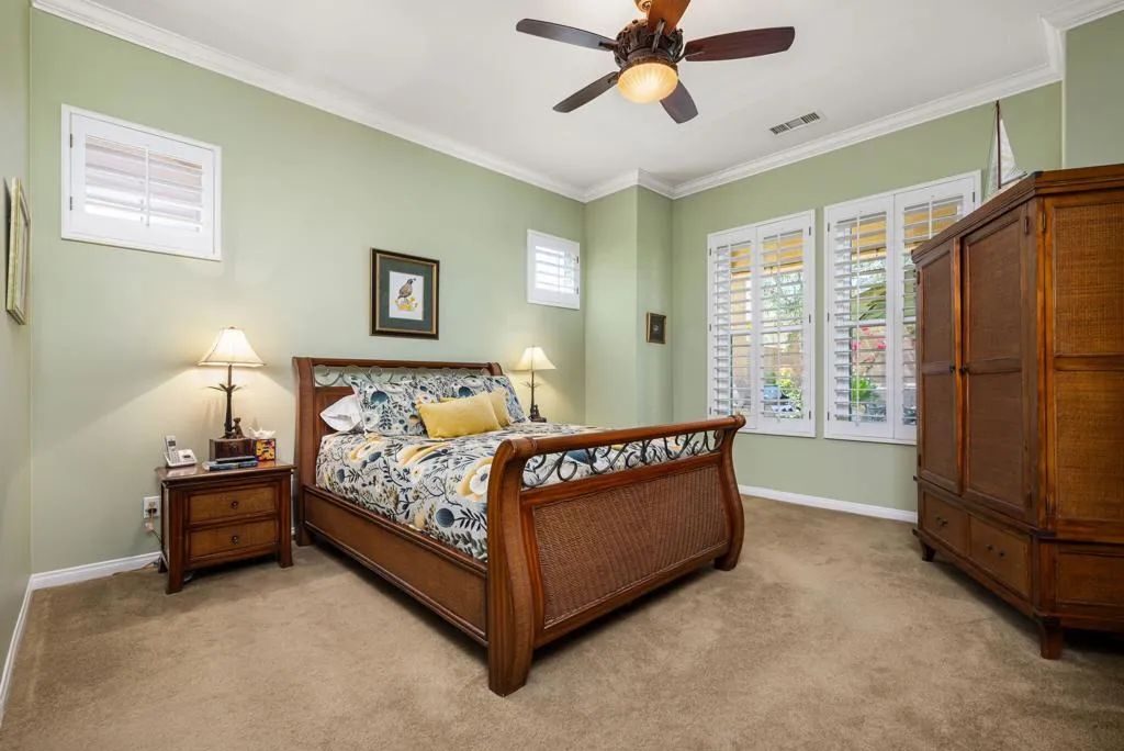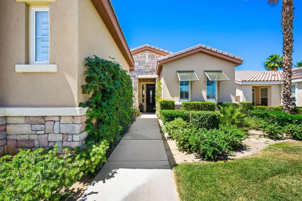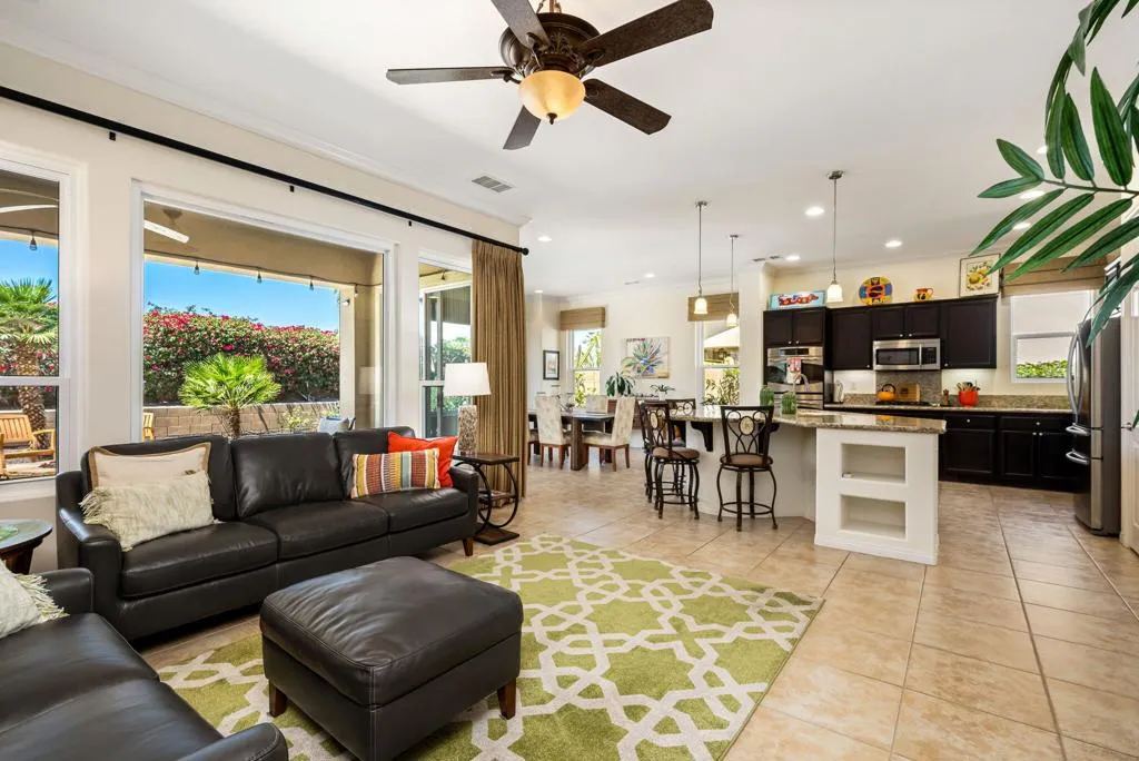 Meticulously maintained and absolutely captivating, this Caspian plan with a charming Tuscan facade, and stunning western mountain views is truly a standout. Offering approximately 1,775 square feet of thoughtfully designed living space, this residence features 2 bedrooms, 2 baths, and a versatile den/office easily convertible to a third bedroom. Elegant upgrades abound, including crown molding, plantation shutters, and custom window coverings throughout. A striking etched-glass entry door welcomes you into a light-filled great room with a media niche, open-concept layout, and expansive windows that flood the home with natural light. The adjacent dining area flows seamlessly into a beautifully appointed chef's kitchen showcasing stainless steel appliances, built-in double ovens and microwave, gas cooktop, and a large prep island with pendant lighting and bullnose slab granite countertops, all complemented by rich espresso cabinetry with brushed nickel hardware and a convenient pantry. Guest quarters offer murphy bed for comfort and privacy with access to a full bath featuring a spacious tiled shower, while the primary suite serves as a serene retreat with dual vanities and a large glass-enclosed shower. Step outside to your private backyard oasis, complete with an expanded paver patio, covered outdoor living area, cozy fire pit, lush landscaping, and breathtaking mountain views. Ideally located just moments from the Santa Rosa Clubhouse and its world-class amenities, this exceptional home invites you to experience the best of Trilogy living--schedule your private showing today. Don't forget the extra garage bump out for the golf cart or storage.