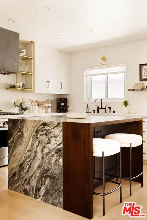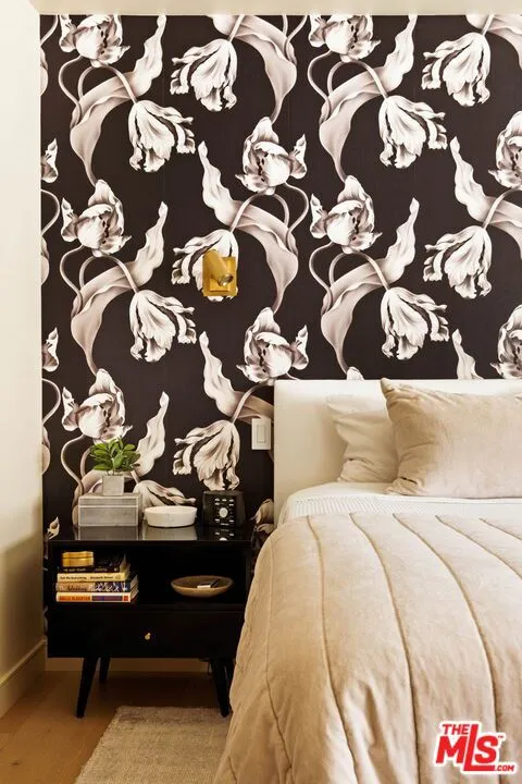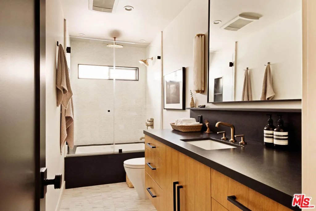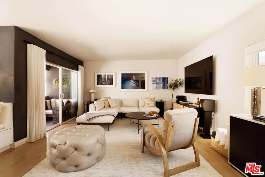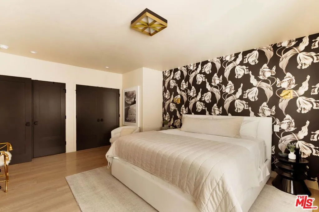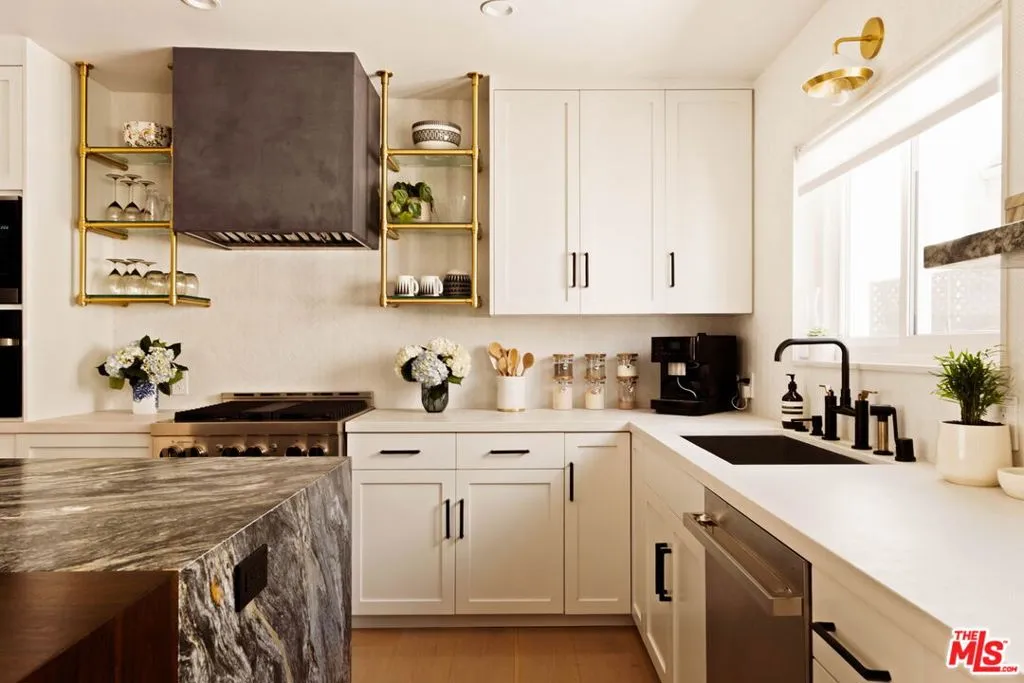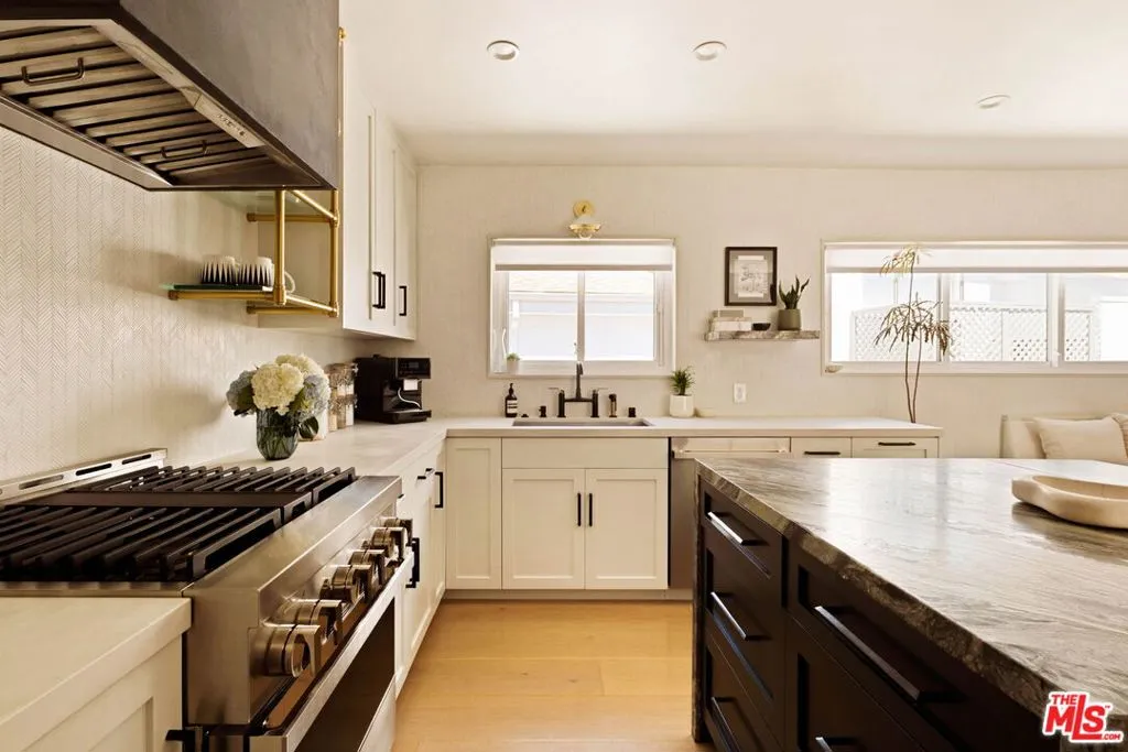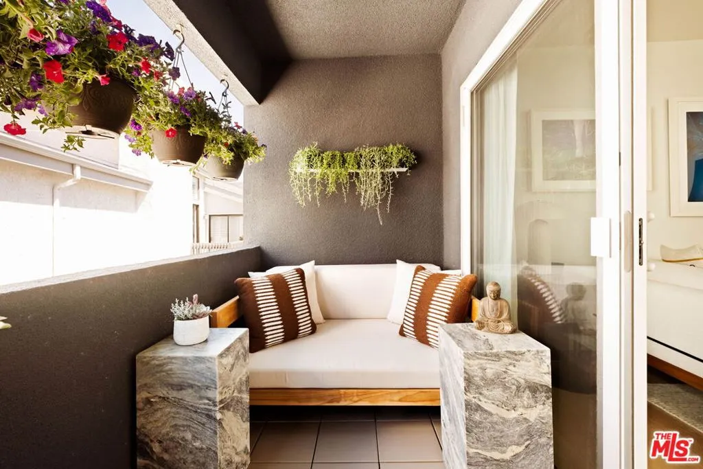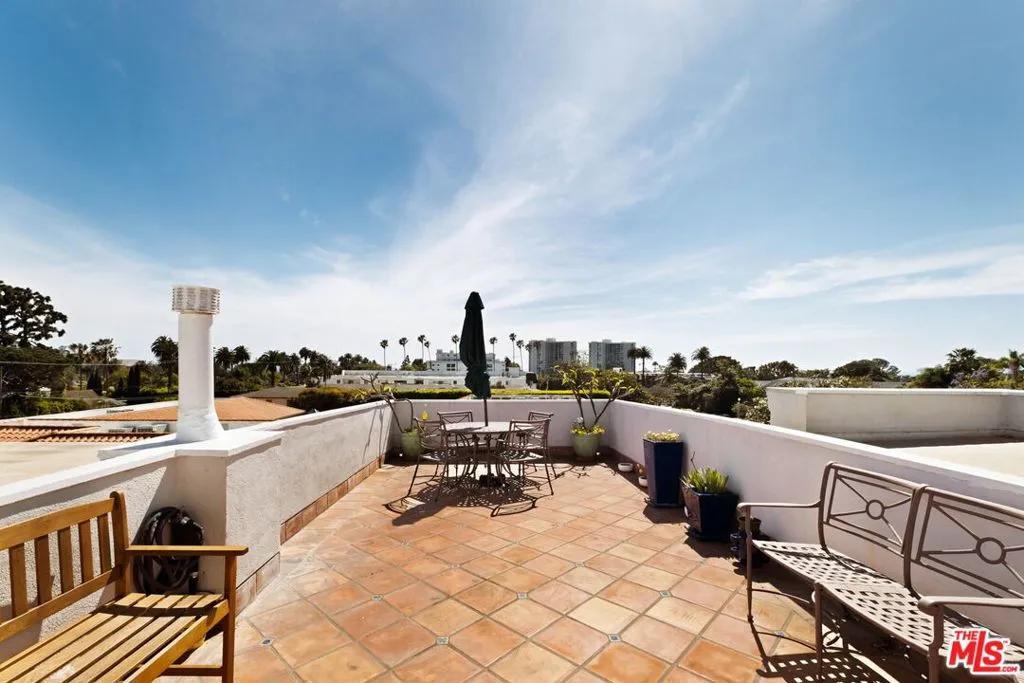 A remarkable top-floor designer-remodeled penthouse in one of Santa Monica's most sought-after neighborhoods, just moments from the beach, the Santa Monica Stairs, Montana Avenue shops, Palisades Park, and more. Fully remodeled and curated by the current owner for her own use, this exceptional residence reflects a level of detail and finish typically reserved only for multi-million-dollar homes. A formal entry leads to an open-concept floor plan with a sleek gourmet kitchen featuring custom cabinetry, top-of-the-line appliances including a chef's gas range and oven, built-in steam oven, microwave, and wine fridge, plus custom brass and glass shelving, a honed marble backsplash, and a granite waterfall island with breakfast bar and extra storage. The kitchen flows seamlessly into a built-in dining nook, spacious living room, and balcony made for lounging. The luxe, spa-like bathroom is richly finished with a floating oak vanity, double shower heads, jacuzzi tub, designer mosaic tile, and high-end fixtures and hardware. The oversized bedroom offers space for a king-sized bed, plus space for a home office, exercise, or sitting area. Additional upgrades include new windows with motorized shades, new lighting, new electrical panel, wide-plank Italian oak floors, custom oak interior doors and molding, air conditioning, and in-unit laundry. Larger than many two-bedroom units, this top floor, one-bedroom condo is flooded with natural light from multiple exposures. Set within a coveted and secure building, the property also enjoys lush landscaping, a panoramic rooftop deck, one secure parking space, and extra storage. HOA dues are $690 per month and include water, sewer, trash and earthquake insurance. Nothing short of spectacular!