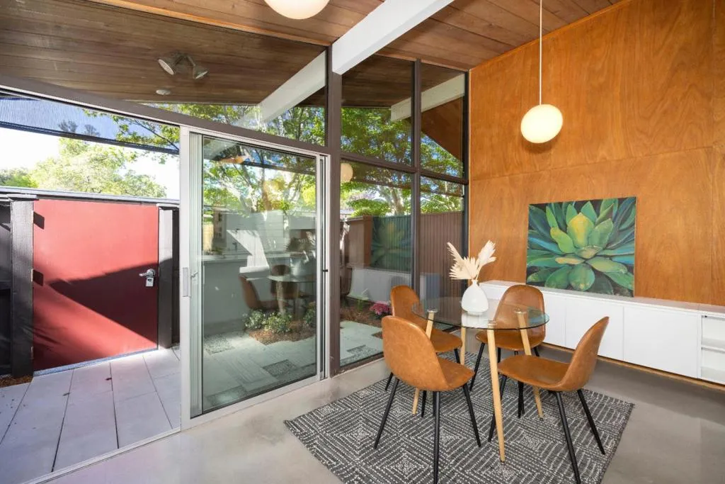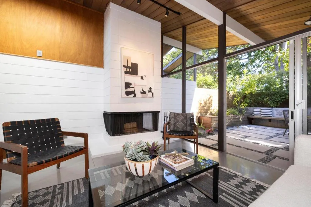 Absolutely stunning mid-century modern masterpiece. A true architectural gem featuring a private atrium entry, soaring vaulted open beam ceilings, walls of windows yielding abundant natural light and seamless indoor/outdoor integration, and wonderfully landscaped grounds providing both serenity and privacy. Masterfully remodeled throughout preserving the mid-century modern spirit with quality and luxury throughout including an open floor plan, stunning kitchen with high-end appliances, polished concrete floors and two spa inspired bathrooms. An absolute must see! California living at its finest!