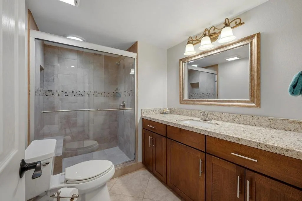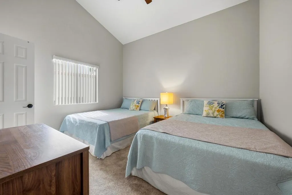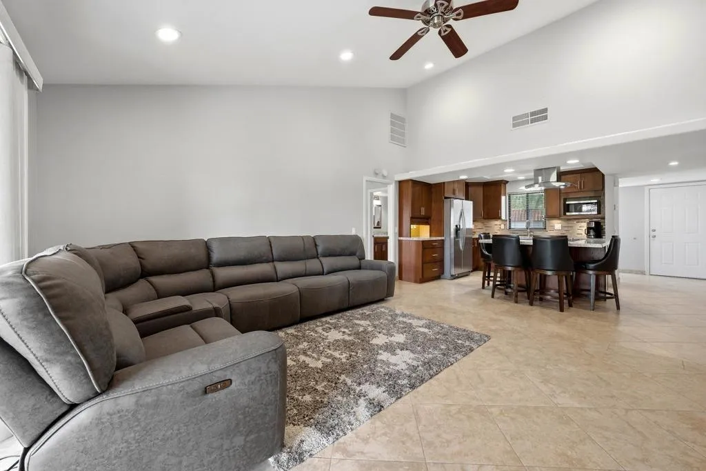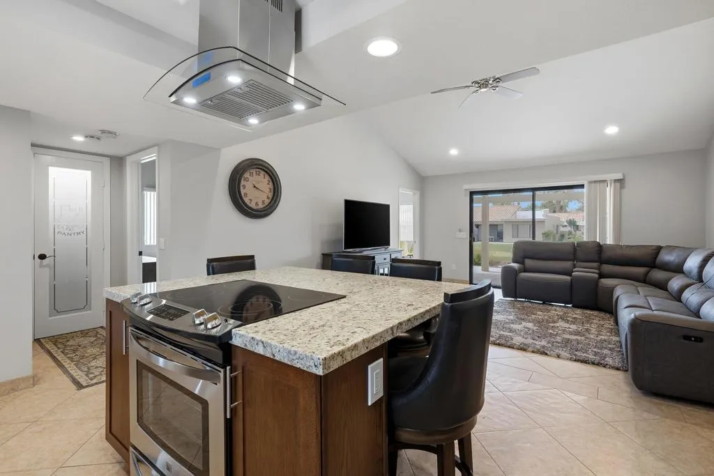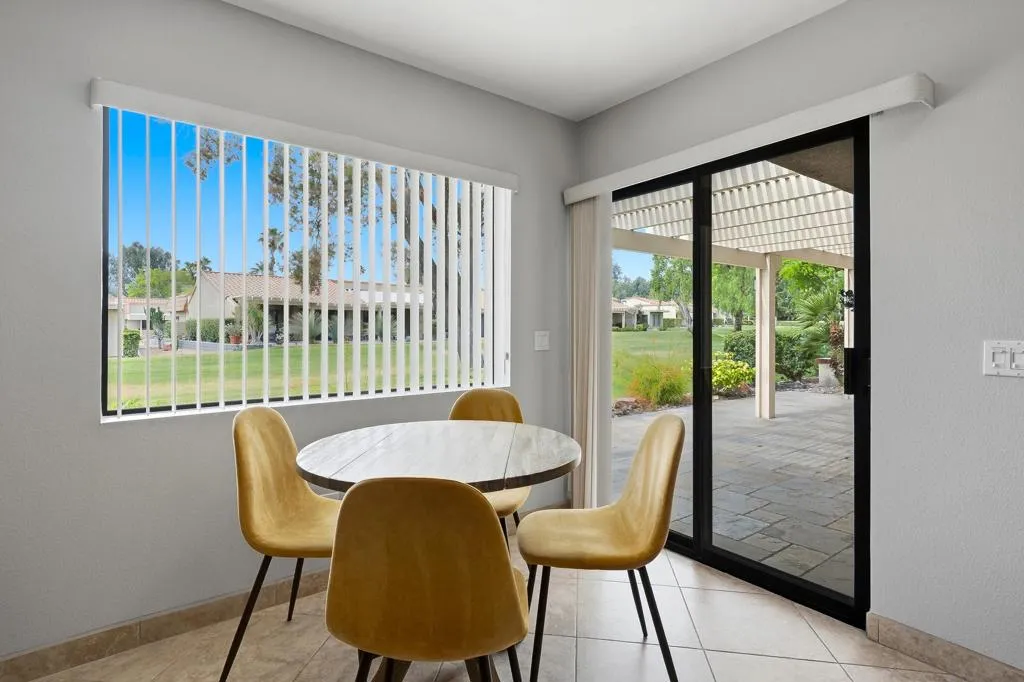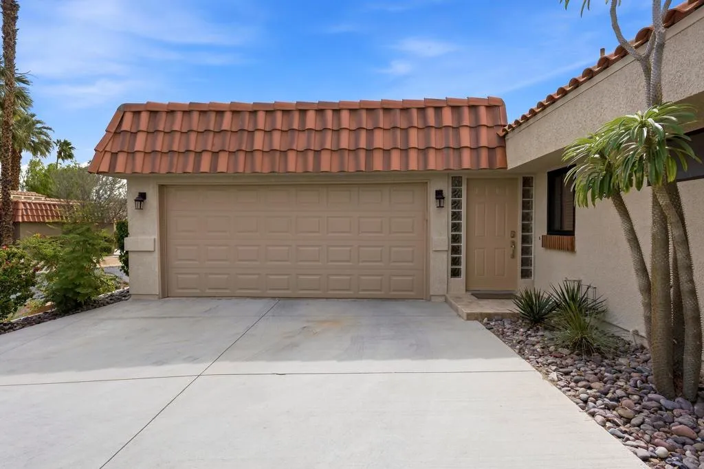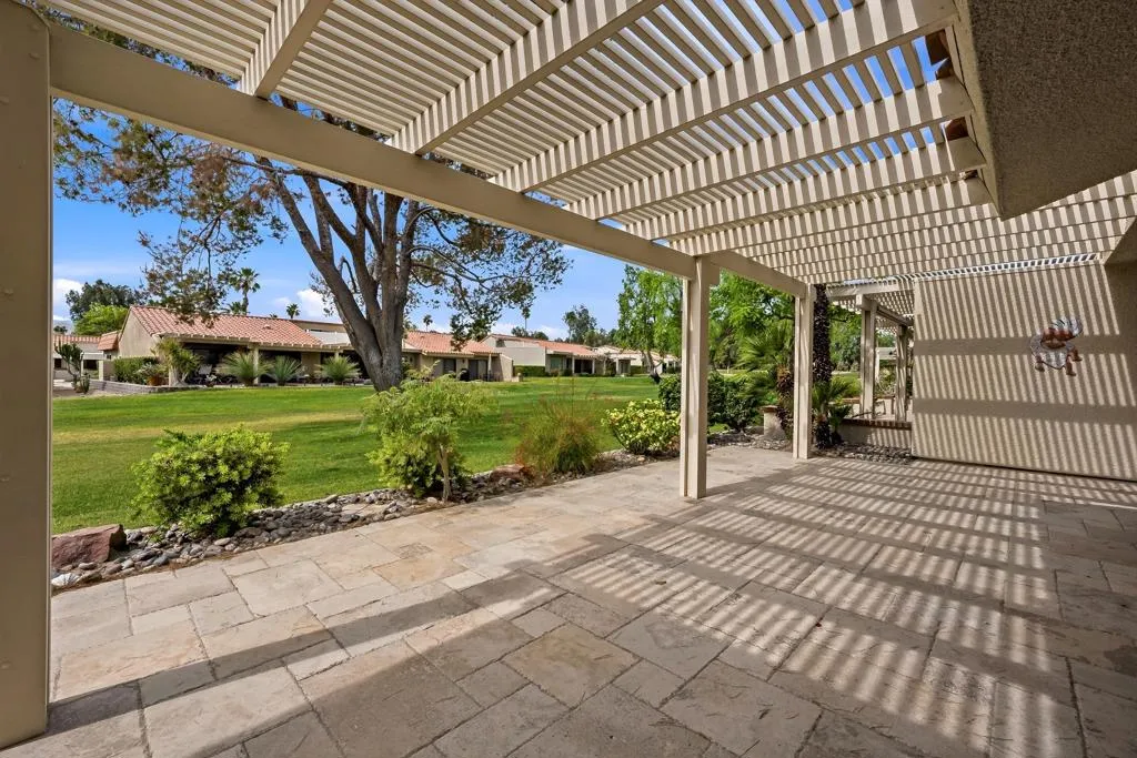 Located within the highly desirable Palm Desert Resort Country Club, this remodeled Vintage floor plan with highly sought after added den offers a blend of style, functionality, and location-perfectly positioned on a lush greenbelt with shade tree and clubhouse close. Enter through a welcoming entry door accented with glass block into a home featuring 18-inch tile laid on the diagonal throughout the main living areas. The completely remodeled, wide-open kitchen is designed for both everyday living and entertaining, showcasing a center island with seating, upgraded cabinetry with modern pulls, granite countertops, a pencil glass tile backsplash, and stainless-steel appliances. A light-filled pantry with a glass door adds both charm and practicality. The spacious great room features vaulted ceilings and a sliding glass door that opens to the rear patio, creating seamless indoor-outdoor living. The den, located just off the living area, includes a pocket door for privacy--ideal as a third bedroom, media room, or office--and also offers direct patio access. The primary suite is a relaxing retreat with newer carpet, a large closet with a lock-off owner's section, and a sliding glass door to the patio. The remodeled primary bathroom features updated cabinetry and a beautifully tiled walk-in shower. The thoughtfully designed floor plan places the guest bedroom on the opposite side of the home from the primary suite, offering excellent privacy for both owners and visitors. The guest bathroom has been updated with a tiled shower, granite countertops, updated cabinetry, and a solar tube for enhanced natural light. Additional highlights include convenient laundry access through the guest bedroom closet and a two-car garage with plenty of room for storage and epoxy flooring. Step outside to the rear patio, finished in natural stone tile set in French pattern with alumawood patio cover where you can relax and take in serene greenbelt views - an ideal setting for enjoying the desert lifestyle. Residents of Palm Desert Resort Country Club enjoy a lively, guard-gated community offering an 18-hole championship golf course (green fees apply), multiple pools and spas (most heated year-round), tennis and pickleball courts (membership fees apply),clubhouse dining, and a full calendar of social activities-making it ideal for full-time living, seasonal enjoyment, or short-term rental opportunities. Offered furnished (excluding TV & king mattress)and ready for finishing touches!