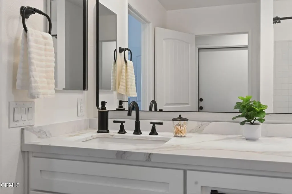 Welcome to 1101 Windward Way, a beautifully updated one story attached single family home in the highly sought after Mandalay Bay Village community in Oxnard. Sharing only one wall, this residence offers a rare blend of privacy, spaciousness, and effortless everyday living. Step inside to a bright and airy living space featuring soaring ceilings, abundant natural light, a cozy fireplace, and direct access to the backyard--perfect for both relaxing and entertaining. The thoughtfully remodeled kitchen showcases painted cabinetry, quartz countertops, a custom tile backsplash, new sink and faucet, and stylish finishes throughout.The spacious primary suite is a true retreat, offering high ceilings, generous closet space, and direct backyard access. The completely renovated primary bathroom features designer tile work, oak-toned vanity, quartz countertops, his and her sinks, and a modern illuminated mirror. The second bedroom is larger than typical, complete with high ceilings, ample closet space, new carpet, private patio access, and convenient entry to the updated hall bathroom. The third bedroom, currently designed with an open entry, is ideal as an office, den, playroom, or reading nook, and can easily be converted back into a traditional bedroom with its existing closet.The hall bath has been beautifully upgraded with white shaker cabinetry, dual sinks, quartz countertops, new plumbing fixtures and hardware. Additional highlights include new interior paint, dual pane windows, a spacious indoor laundry closet, and an attached two car garage with an additional two car driveway.Enjoy outdoor living in the generously sized side and backyard featuring brick pavers and mature fruit trees; perfect for gatherings with family and friends. As a single family home, this property is eligible for VA and FHA financing. The HOA fee covers front landscaping and common area maintenance, while also providing access to a sparkling community pool and spa. Ideally located just minutes from Seabridge, local beaches, shopping, and dining, this home offers the perfect blend of comfort, style, and coastal convenience.