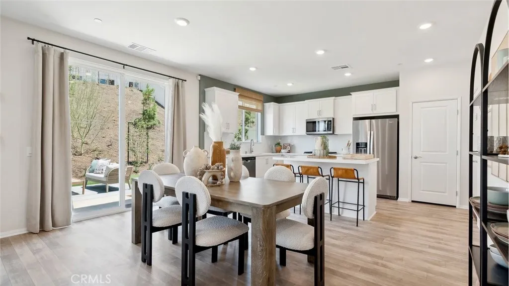 This 1,983 square foot California Tuscan facade home on a corner lot with no home directly behind features an open floorplan. Downstairs is a great room that flows into the dining area and the island kitchen with Quartz countertops, full backsplash, built-in stainless steel appliances, and a powder bathroom off of the entry. Upstairs you will find the main bedroom with an ensuite bathroom and two walk-in closets, two additional bedrooms, a loft and the laundry room. There is white shaker-style cabinetry throughout and the buyer still has time to select flooring. This home has Smart Home Technology, solar installed, and a 2-car attached garage pre-plumbed for an electric car. The front yard is fully landscaped and irrigated. This home has easy access to shopping, entertainment, parks, walking trails and the I-15 freeway. We anticipate the home will be ready for move in mid-May 2026.