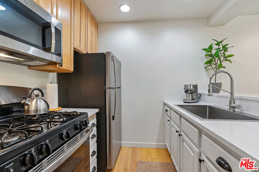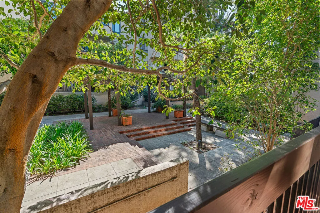 Cozy and private tucked away corner unit condo sharing only 1 wall located in the very green "Courtyards" complex in West Hollywood. Clean and beautifully updated 1st floor studio with refinished golden maple floors and brand new floor to ceiling windows with large sliding doors perfectly frame its peaceful views of trees and greenery. Open and spacious functional living area connected to kitchen with new white quartz countertops, stainless steel appliances and refinished cabinets with a breakfast bar. Bathroom offers new vanity and mosaic tile floors that pop with color. Huge balcony perfect for entertaining or unwinding after a long day. One parking spot included. Full service complex with gym, pool, updated clubhouse and sauna. HOA includes earthquake insurance, water, gas, sewer, trash, internet and security. Come take a look.