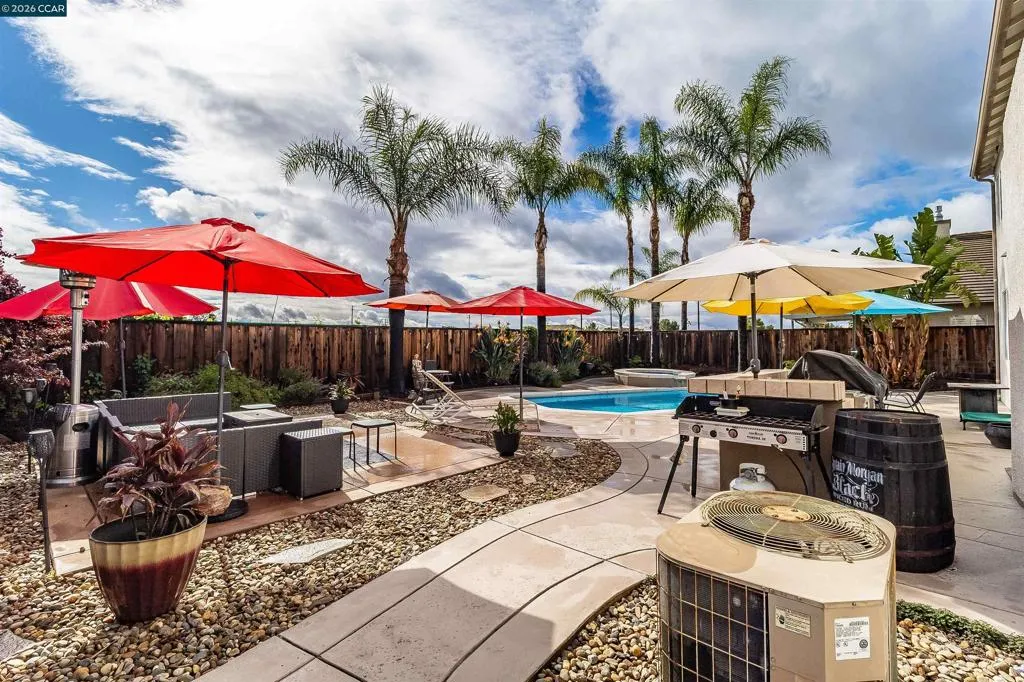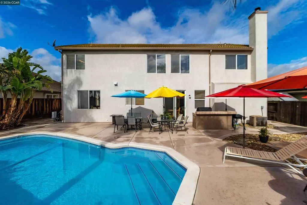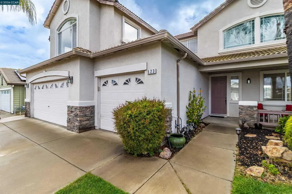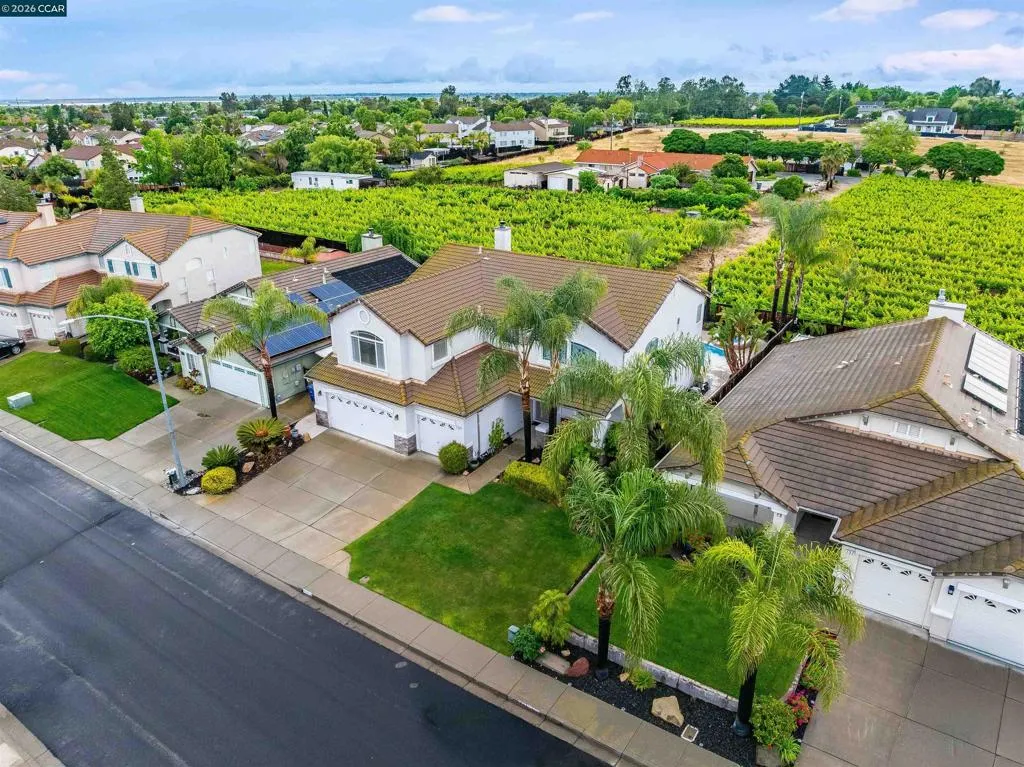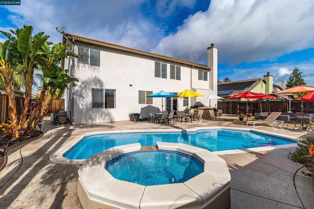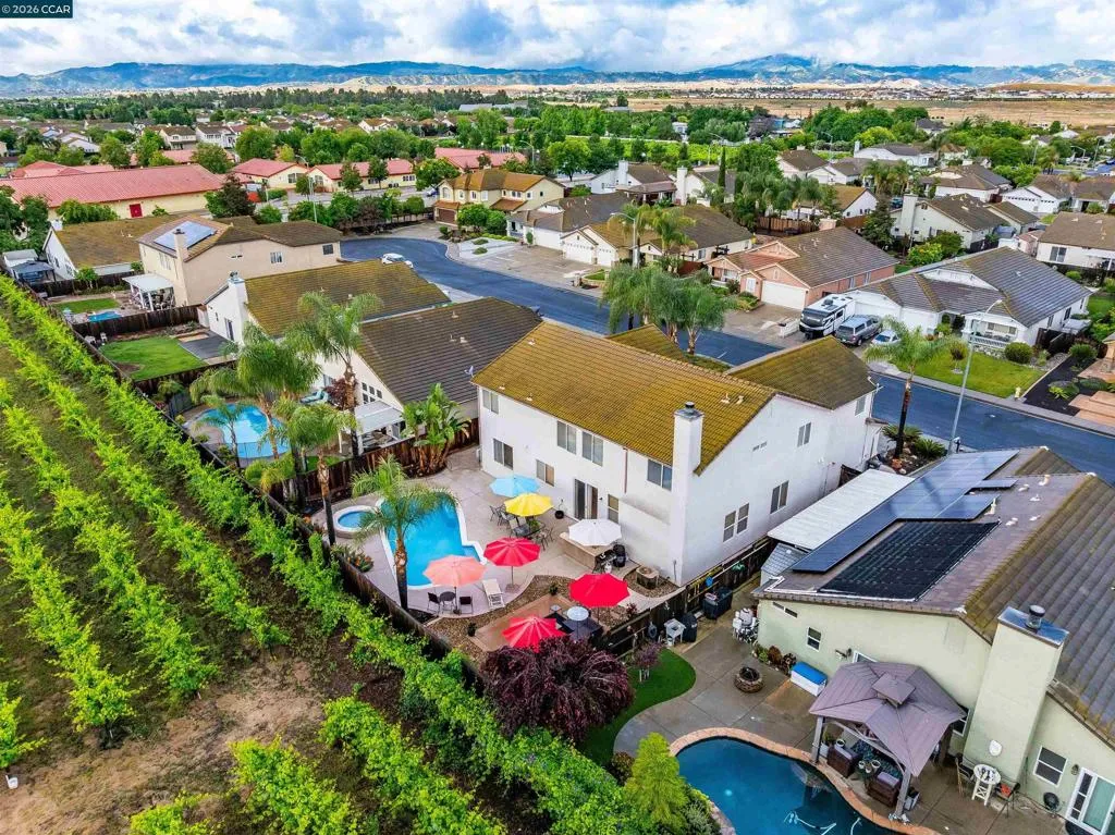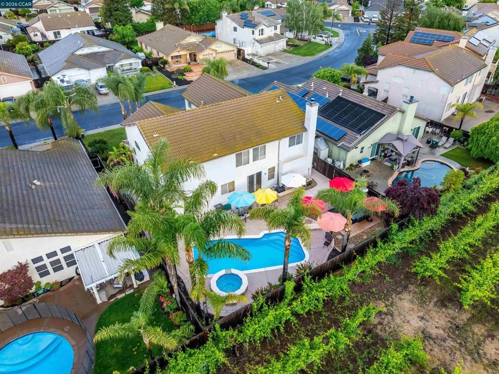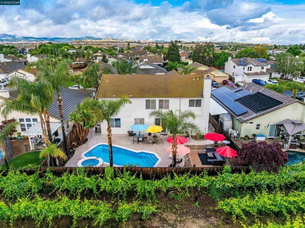 Welcome to 523 Whitehall Court in Oakley, set on a quiet court with no immediate rear neighbors and a rare vineyard backdrop. This 3,361 sq ft setting offers a level of privacy and openness not often found, with the home oriented around a backyard designed for everyday use and entertaining. Inside, the layout is open and functional, with vaulted ceilings and natural light enhancing the main living areas. The kitchen includes tile countertops, gas cooktop, double oven, and ample cabinetry. An expansive upstairs bonus room offers flexible space for a home theater, game room, or additional living area without sacrificing a bedroom. The primary suite is spacious, featuring two closets and a large bathroom, while additional living areas provide versatility. The backyard is the focal point, featuring a heated spa that cascades into the pool, patio area, and multiple seating spaces. An outdoor propane BBQ extends the entertaining space, while the vineyard backdrop creates a calm, unobstructed setting. Additional features include whole-house soft water treatment extending to the exterior and a three-car garage. A well-positioned home offering privacy, flexibility, and a setting that stands apart.