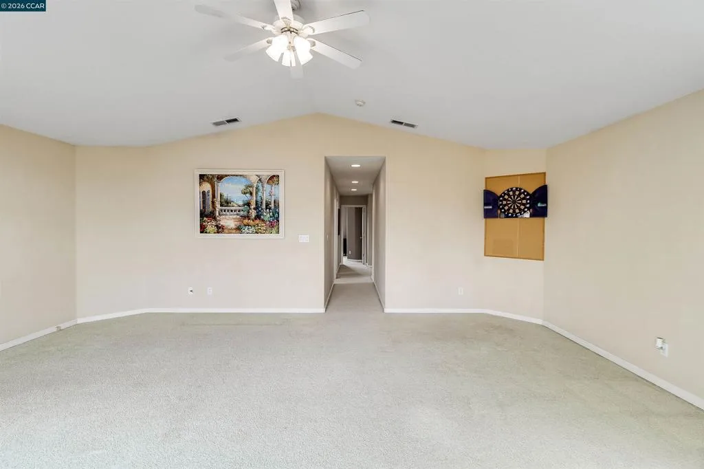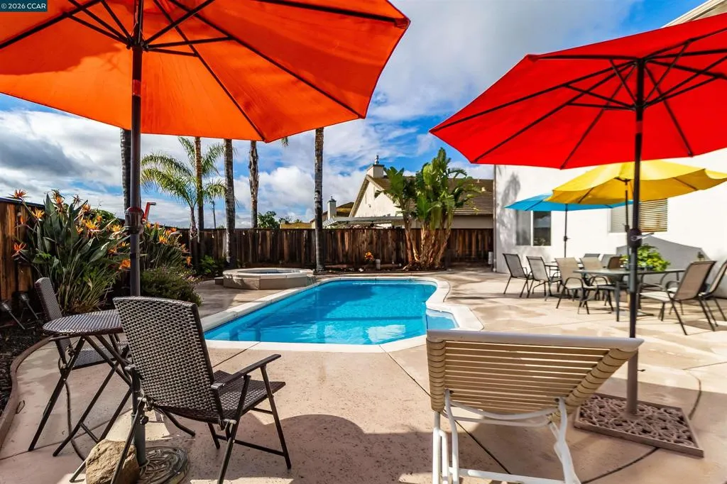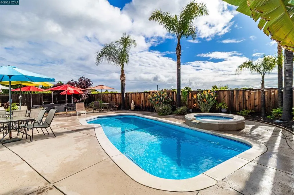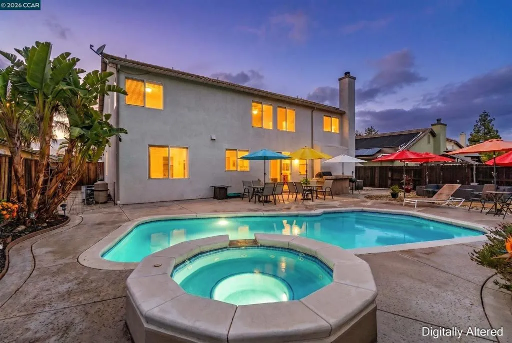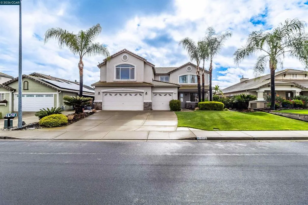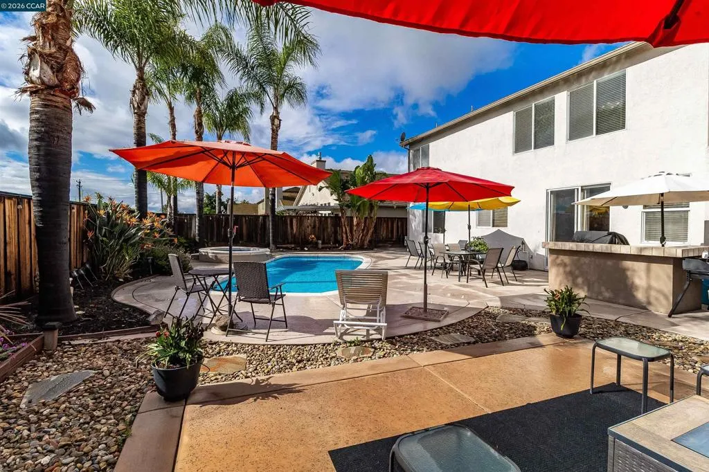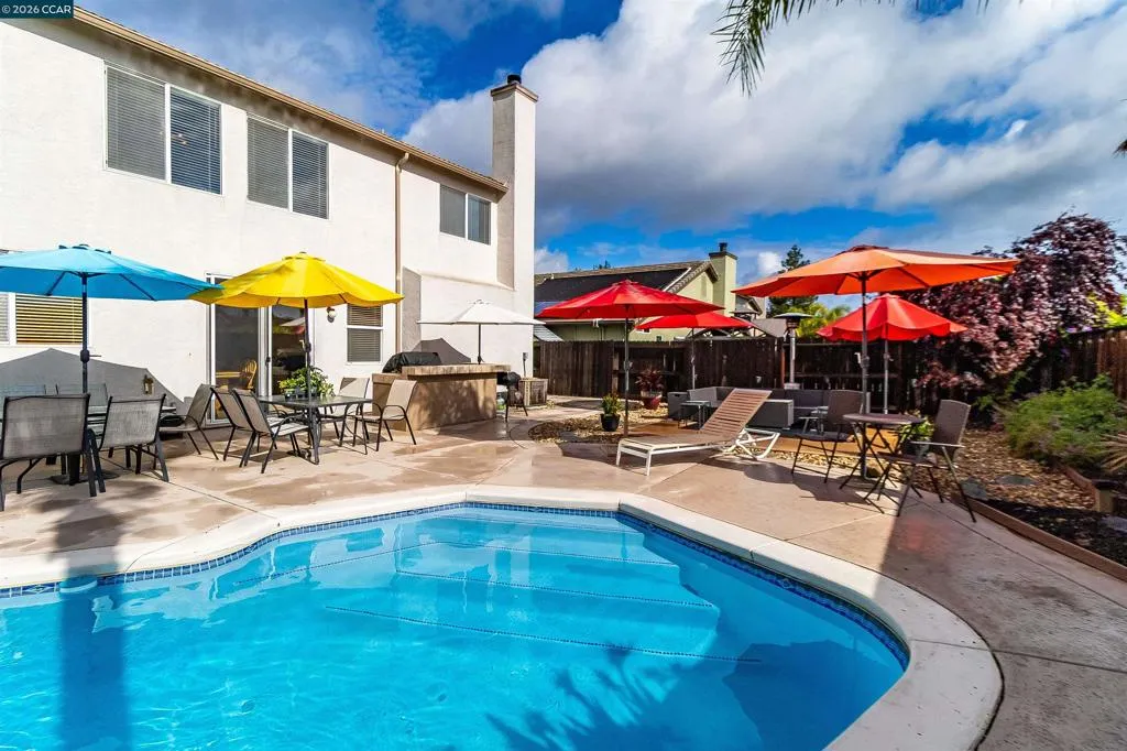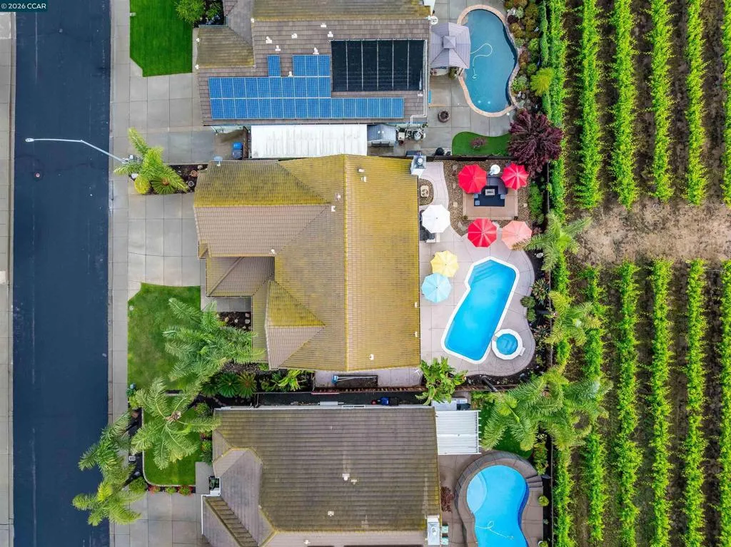 Welcome to 523 Whitehall Court in Oakley, set on a quiet court with no immediate rear neighbors and a rare vineyard backdrop. This 3,361 sq ft setting offers a level of privacy and openness not often found, with the home oriented around a backyard designed for everyday use and entertaining. Inside, the layout is open and functional, with vaulted ceilings and natural light enhancing the main living areas. The kitchen includes tile countertops, gas cooktop, double oven, and ample cabinetry. An expansive upstairs bonus room offers flexible space for a home theater, game room, or additional living area without sacrificing a bedroom. The primary suite is spacious, featuring two closets and a large bathroom, while additional living areas provide versatility. The backyard is the focal point, featuring a heated spa that cascades into the pool, patio area, and multiple seating spaces. An outdoor propane BBQ extends the entertaining space, while the vineyard backdrop creates a calm, unobstructed setting. Additional features include whole-house soft water treatment extending to the exterior and a three-car garage. A well-positioned home offering privacy, flexibility, and a setting that stands apart.