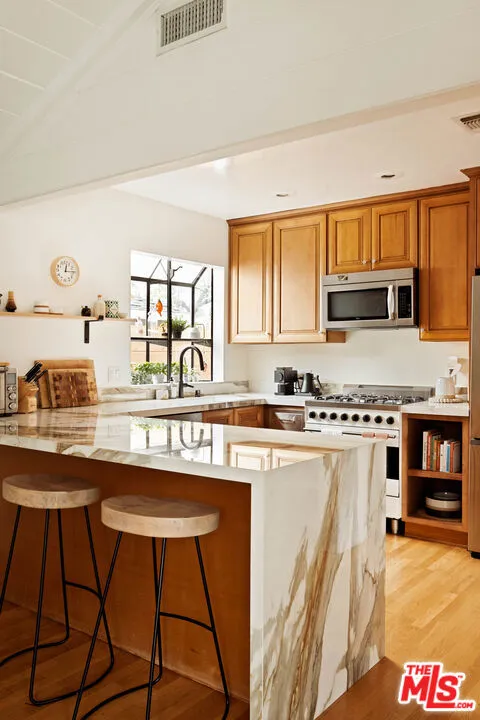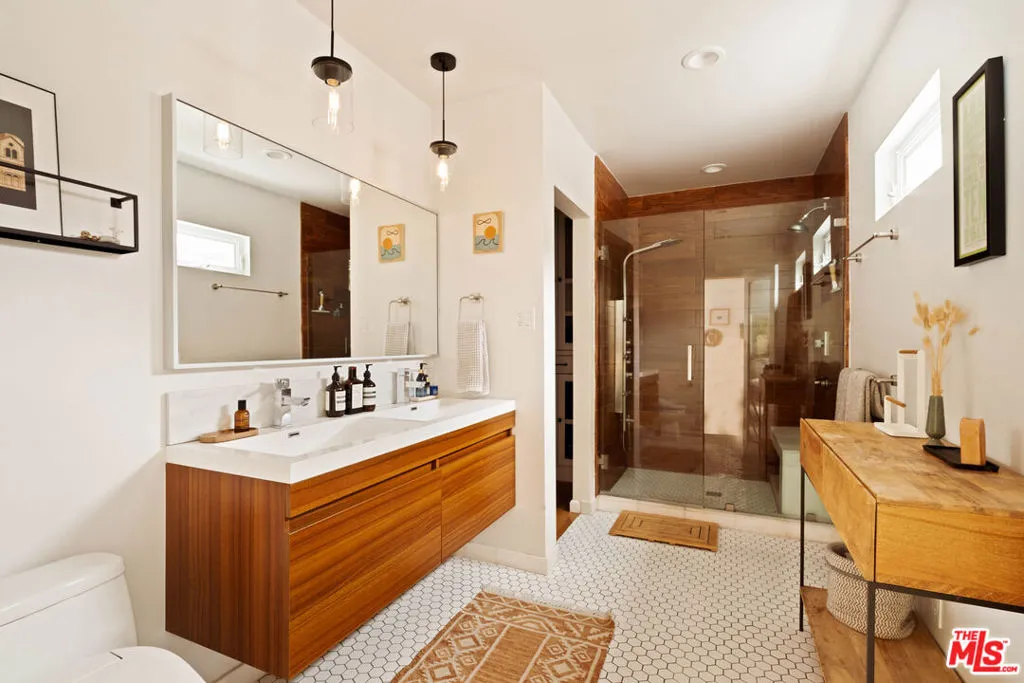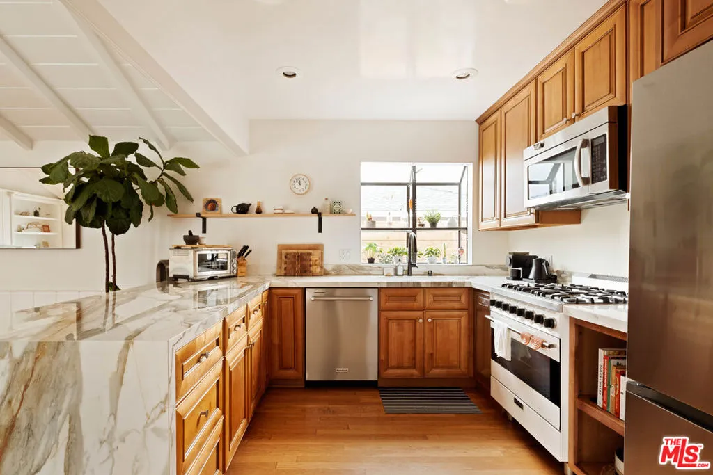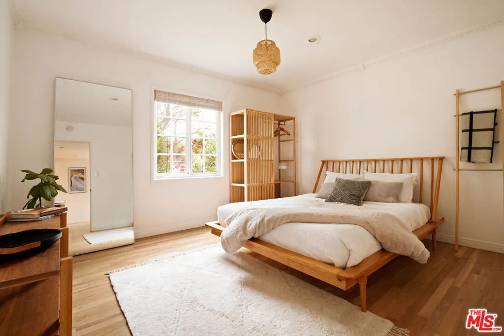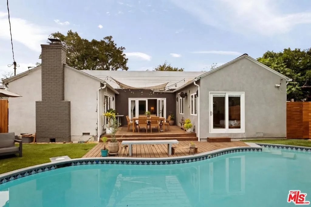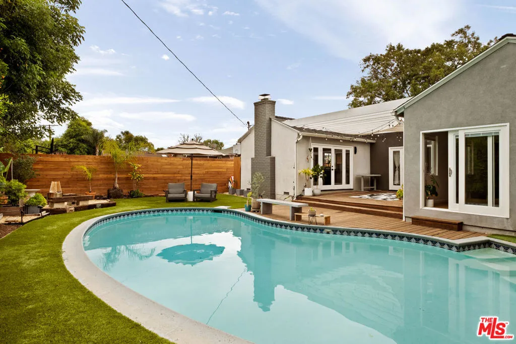Come Sunday 2-5 for a Coffee Cart and DJ dance party! Tucked away on a quiet, tree-lined street in Westchester, one of Los Angeles's most sought-after Westside neighborhoods, this California bungalow is a rare find. It is private, sun-drenched, and effortlessly designed for the indoor-outdoor lifestyle that defines living in LA. From the moment you arrive, the home feels like a retreat. Light pours through every room, and the thoughtful layout balances warmth and character with carefully considered updates throughout. The main living room is open and airy with raised ceilings that amplify the natural light. A separate sitting and dining room anchored by a wood-burning fireplace and custom built-ins adds layers of warmth and richness. French doors in both living spaces open directly onto a central courtyard deck, creating a seamless flow between inside and out that works equally well for quiet evenings at home or entertaining. The remodeled kitchen is a standout featuring a waterfall island, high-end appliances, and a layout that connects naturally to the rest of the home. The primary suite is intentionally set apart for privacy, with vaulted ceilings, exposed wood beams, a walk-in closet, and direct backyard access. The spa-inspired primary bath features a large glass shower with multiple shower heads. On the opposite wing, two additional bedrooms offer flexibility for guests, children, or a home office. A fourth bedroom near the front of the home complete with skylights and built-ins is ideal as a creative studio, office, or flex space, with an adjacent workshop or storage room adding even more versatility. The backyard is your own private oasis. Lush, beautifully maintained, with by a solar-heated pool, this outdoor space is made for both slow weekend mornings and memorable gatherings. Additional highlights include a whole-home solar system with an approximately $184 per month transferable lease, and an EV car charger. Location is where this home truly shines for Westside buyers. Just minutes from the beach, walkable to local cafes and the nearby K Line which connects you directly to SoFi Stadium, the Intuit Dome, and soon LAX. With the 2028 Olympics on the horizon, Westchester's connectivity and profile are only growing. For buyers searching for walkable homes in Los Angeles near the beach, homes with easy freeway and transit access, or a true Westside retreat with outdoor space and modern amenities, 7622 Goddard delivers on every count.