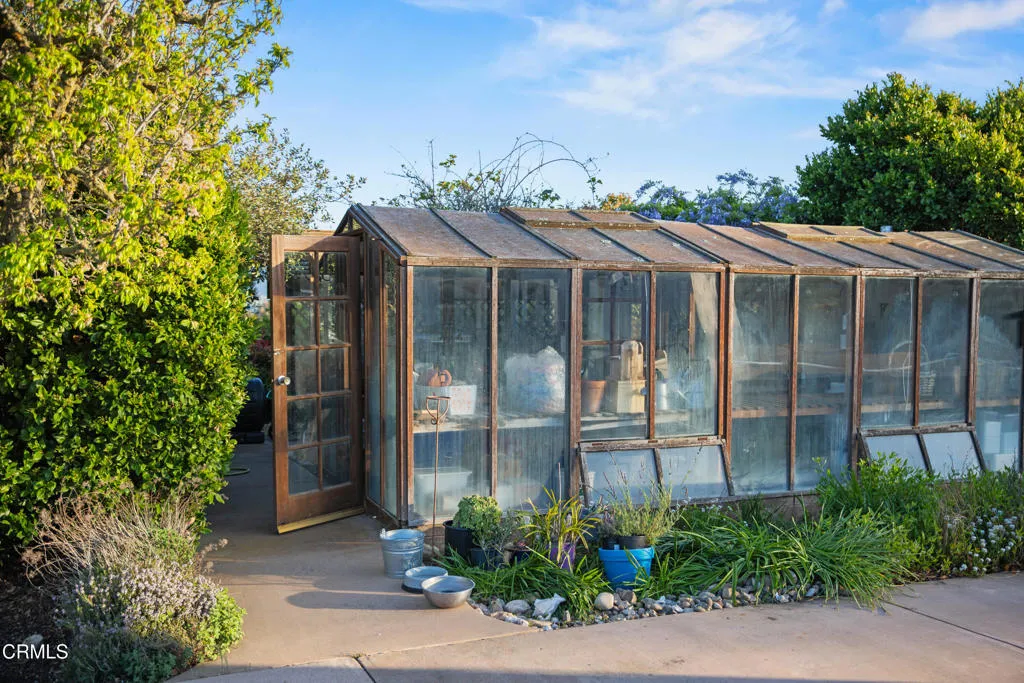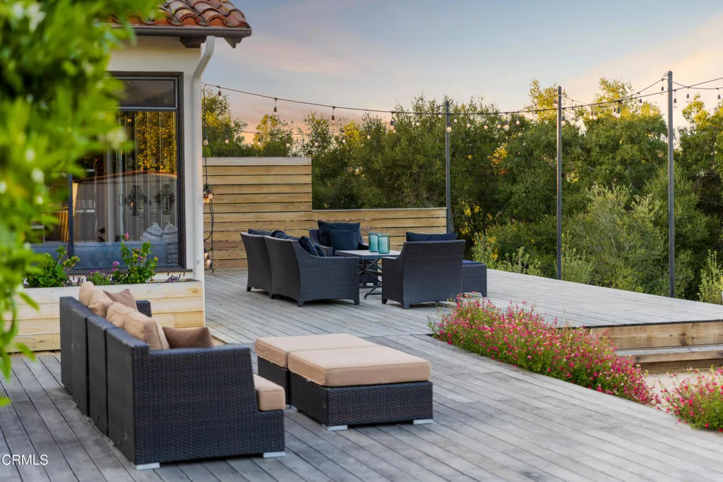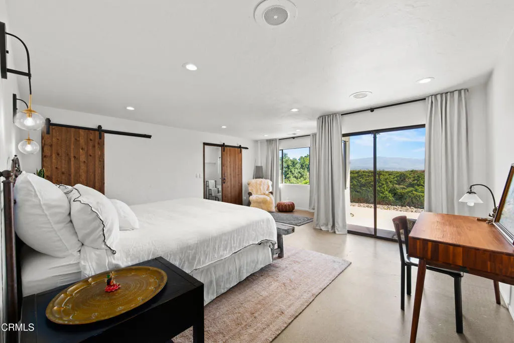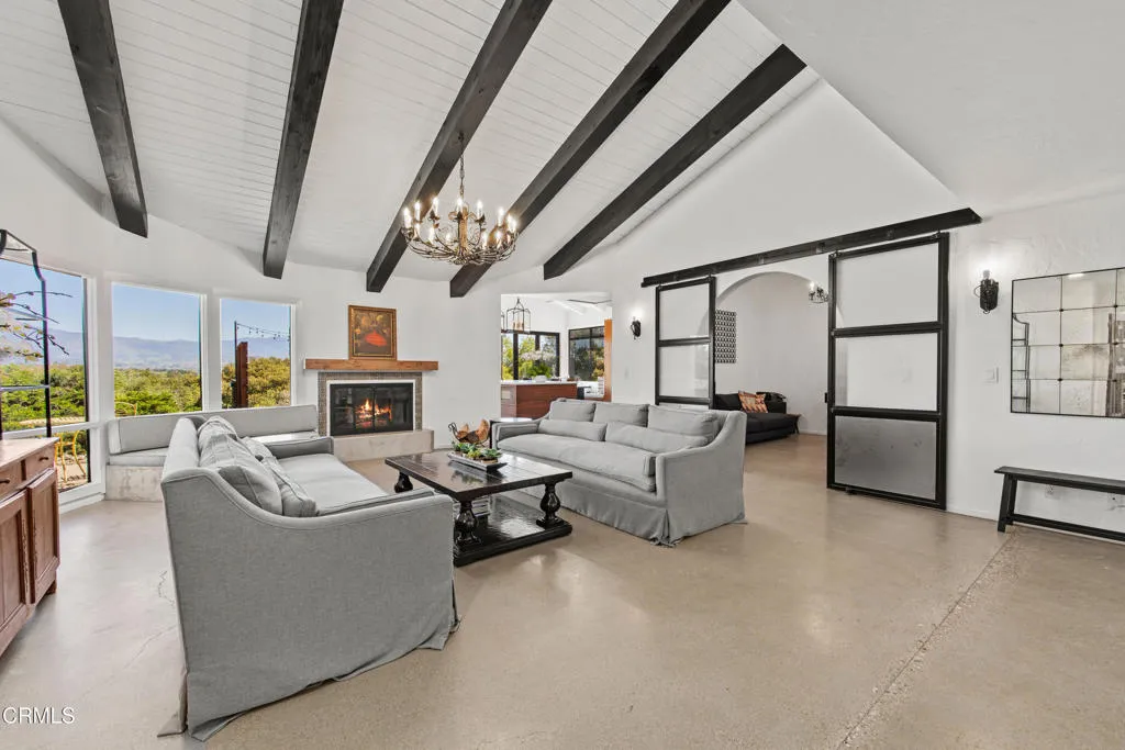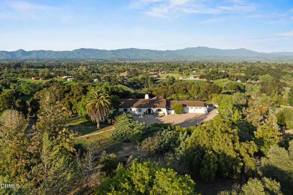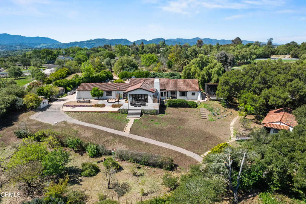 An elevated escape with sweeping views, where comfort and ease feel almost dreamlike. Set on 5+/- acres in the heart of Santa Ynez Valley Wine Country, this modern Spanish-style ranchette rests within the highly sought-after Ballard School District. Gated and framed by natural beauty, a long, scenic drive winds its way to a setting defined by open skies, golden light, and a quietly enchanting sense of arrival. The remodeled 4 bedroom, 3 bath main home blends warmth with contemporary design, creating spaces that feel both inviting and inspired. At its heart, a chef's kitchen opens effortlessly to the outdoors through a full wall of bi-fold glass doors, while a sunlit built-in breakfast banquette invites slow mornings and easy conversation. Vaulted wood-beamed ceilings, polished concrete floors, custom imported wrought iron lighting, and a cozy fireplace lend texture and character, striking a balance between relaxed comfort and understated elegance. Picture windows frame the surrounding landscape, while a separate family room and bonus office offer flexibility for both quiet retreat and lively gatherings. A detached 1 bedroom, 1 bath guest house offers a charming extension of the property, complete with its own private driveway, a two-car garage, and a lower-level studio or office, ideal for visitors, creative pursuits, or additional income potential. Outdoors, the grounds unfold like a hidden world waiting to be experienced. The lower three acres have been thoughtfully groomed into a magical forest of live oaks, where these protected, majestic trees create a canopy of dappled light and winding paths. It's a setting that feels straight out of a storybook, inviting exploration, imagination, and peaceful moments beneath the branches. Nearby, the expansive flat driveway offers a versatile setting for recreation and gathering, with plenty of room for bikes, roller skating, and carefree afternoons. A charming greenhouse, trellised potting shed, and flourishing fruit orchards add to the property's sense of abundance, while a stylish tiny house gym with a deck offers a peaceful space to recharge, all set against a backdrop of breathtaking natural beauty and views of Figueroa Mountain.