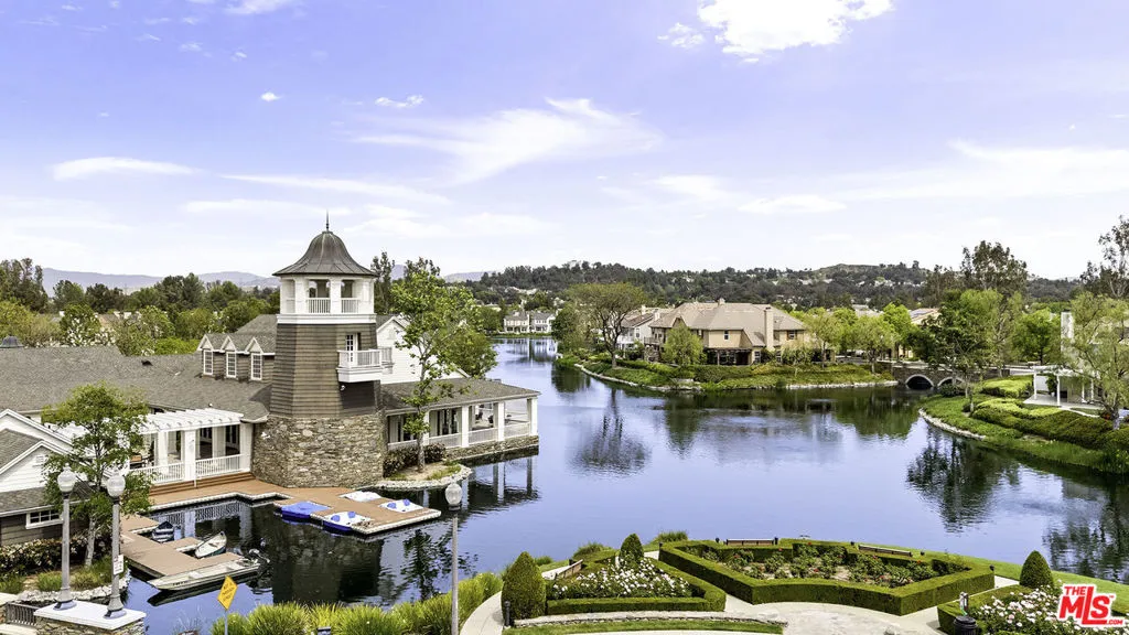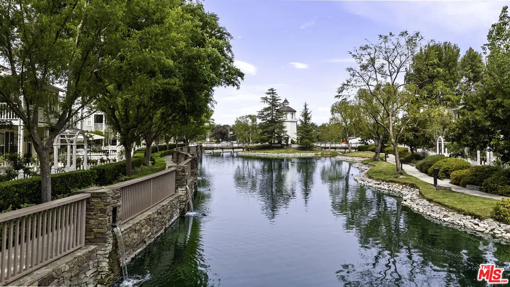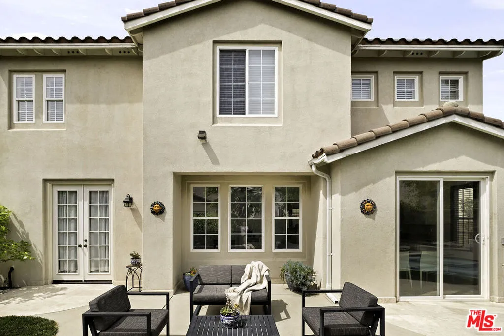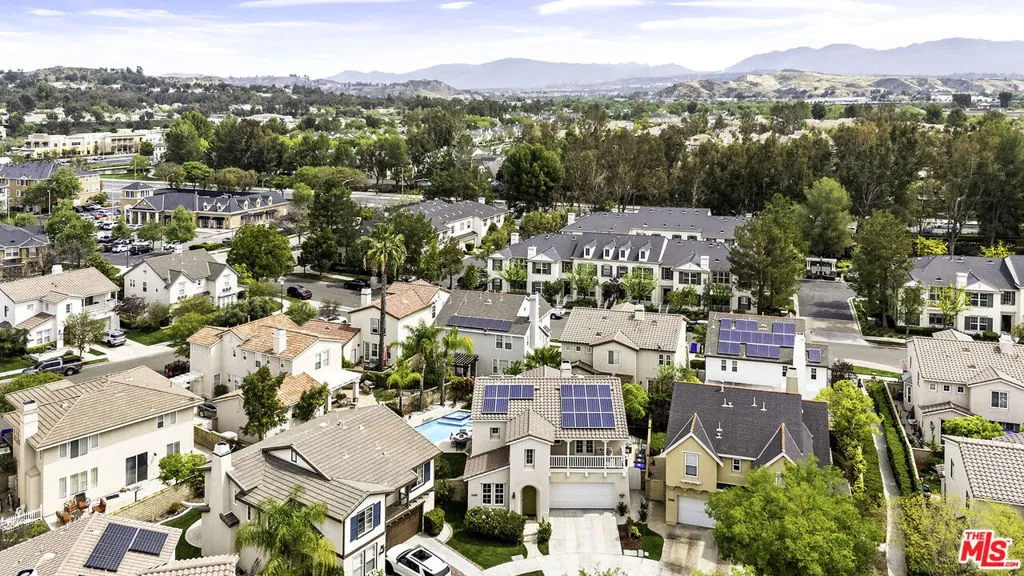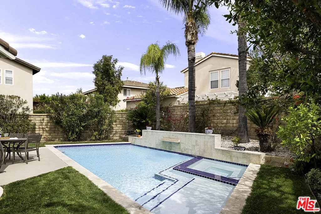 Welcome to this stunning Valencia Bridgeport residence, tucked away on a quiet cul-de-sac with beautiful curb appeal and a rare private pool a true standout in the neighborhood. From the moment you walk in, a graceful arched entryway and timeless architectural details create an immediate sense of warmth and sophistication. Inside, the bright and airy layout is thoughtfully designed to balance everyday comfort with effortless entertaining. The entry opens to a sun-filled formal dining area, where an interior arch adds depth and character, creating an inviting setting for both intimate dinners and lively gatherings. At the heart of the home, the gourmet kitchen impresses with top-of-the-line appliances, sleek cabinetry, quartz countertops, and a stunning central island with seating. With additional space for a casual dining table and direct access to the backyard, it seamlessly blends functionality and lifestyle, creating an ideal flow for indoor-outdoor living. The living room is filled with natural light and anchored by a travertine-accented fireplace and soaring wood-beam ceilings, offering a warm and welcoming space to relax or entertain. The main level is completed by a guest bedroom with direct backyard access, along with a well-appointed bathroom featuring a modern glass-enclosed shower with mosaic accents. Upstairs, rich hardwood floors add warmth and continuity throughout. The primary suite is a true retreat, generously sized and designed for comfort. A private balcony overlooking the quiet residential street provides the perfect setting for morning coffee or evening unwinding. The spa-like primary bathroom features a dual vanity, a deep soaking tub, a separate shower with beautiful tile work, and dual walk-in closets that balance functionality and luxury. Two additional bedrooms offer flexibility for family or guests and are complemented by a secondary bathroom with a dual vanity, modern finishes, and a standalone shower. A versatile bonus space further enhances the home's functionality, ideal for a home office, playroom, or additional living area. Step outside to your private resort-style backyard. The sparkling pool and spa are surrounded by a lush green lawn, mature palm trees, manicured landscaping, and multiple seating and lounge areas perfect for Southern California outdoor living at its finest. Additional highlights include plantation shutters throughout, a dedicated laundry room, central heating and air conditioning, Tesla solar panels with 8,500+ kWh guaranteed annually, a 240V EV charger outlet, and a spacious two-car garage. Ideally located just moments from Bridgeport Lake, scenic waterways, the community pool, spa, and clubhouse, as well as the area's top dining, grocery, and shopping destinations. Come experience the incredible lifestyle this exceptional home has to offer.