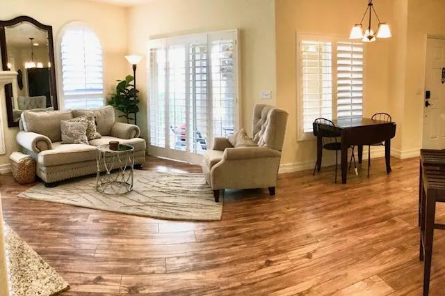 MOTIVATED Seller!!**LOCATION, LOCATION, LOCATION!** This beautifully maintained 2-bedroom, 2-bathroom ground-level condo offers unbeatable convenience--just steps from the world-renowned Indian Wells Tennis Garden, as well as markets, restaurants, shopping, theater, and more! Enjoy easy living with direct access from the cozy patio, complete with **mountain views** and just a short stroll to Applebee's and nearby medical facility. This charming unit features several thoughtful upgrades, including **plantation shutters, laminate flooring, a new A/C unit, tankless water heater, nearly new washer & dryer, and a sleek newer stainless steel refrigerator**.One of the bathrooms was smartly reconfigured to create a **spacious walk-in closet**, and the former half-bath off the living area was converted into a **large pantry/storage room**--with potential to easily reinstall the bathroom if desired. Whether you're looking for a full-time residence, seasonal getaway, or investment property, this condo checks all the boxes. **Majestic mountain views, central location, modern upgrades**, and pride of ownership make this a must-see opportunity!