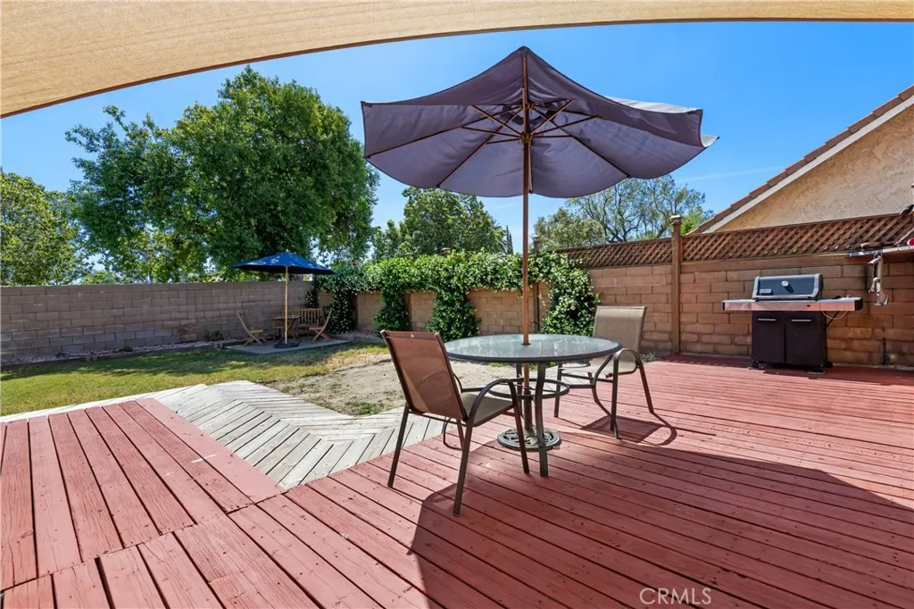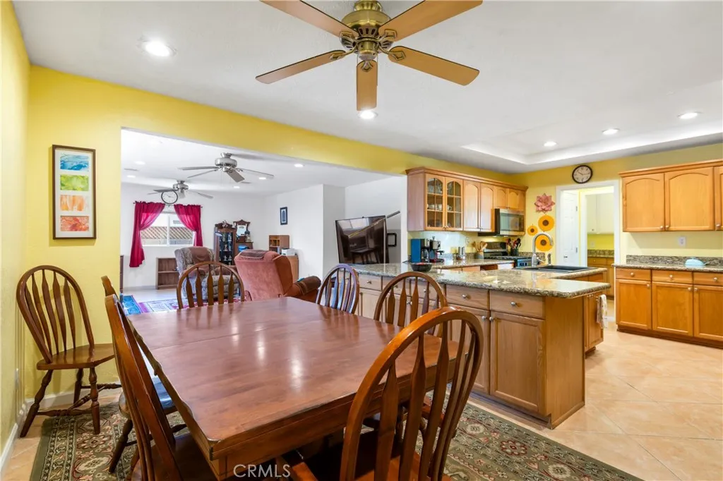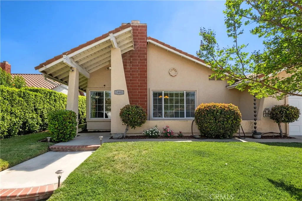 Charming home with excellent curb appeal and a functional open floor plan filled with natural light. Tile flooring runs throughout the main living areas, offering both style and durability, while the bedrooms feature comfortable carpeting. The living room is centered around a cozy fireplace with a mantle, and the formal dining area provides a great space for everyday meals or entertaining. The open kitchen features stainless steel appliances, ample cabinetry, and overlooks both the living and dining areas, creating a connected and inviting space. The layout is thoughtfully designed with upgraded finishes, including a guest bathroom with a custom vanity and tile flooring. Additional highlights include central air and heat for year-round comfort. The backyard features a wood patio and a grass swath, offering plenty of space to add an outdoor fire pit, lounge area, or additional entertaining features.