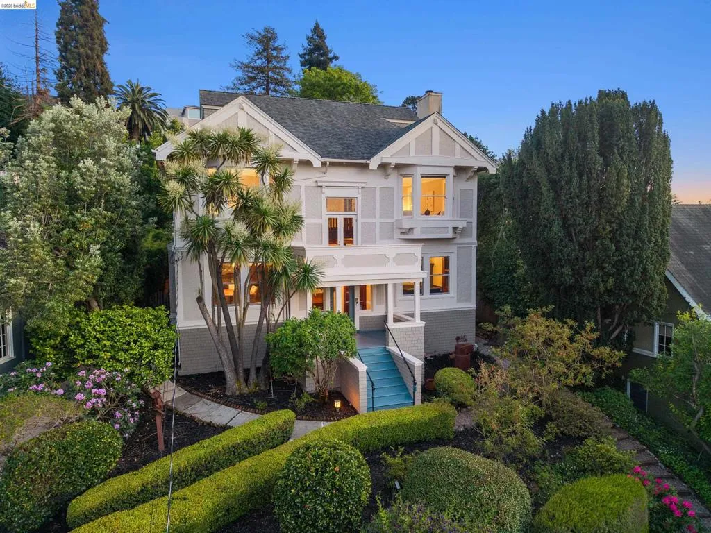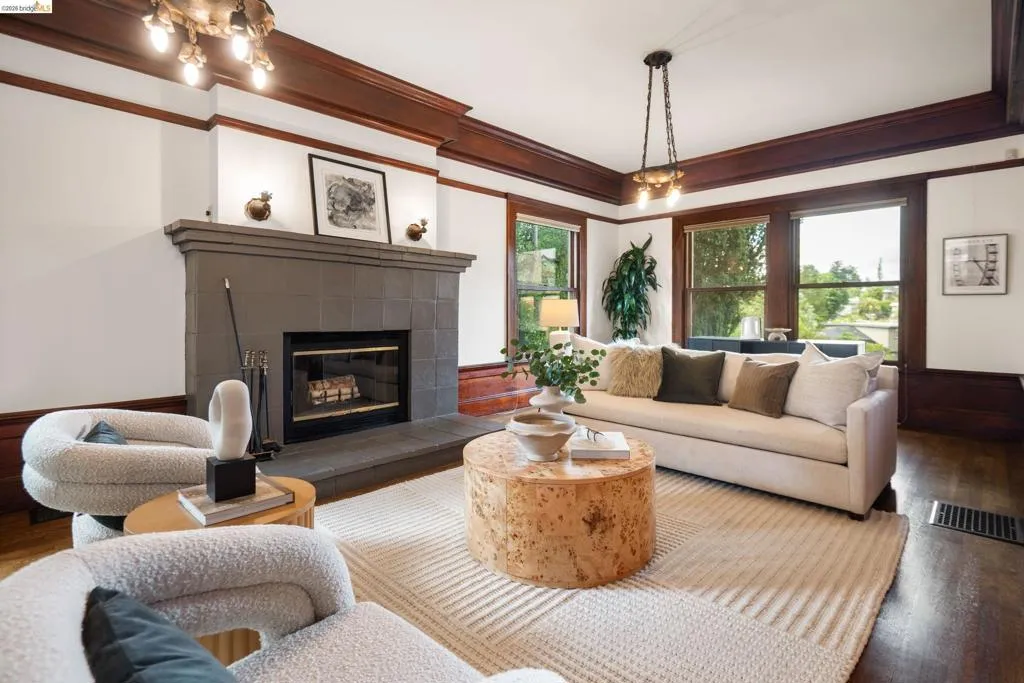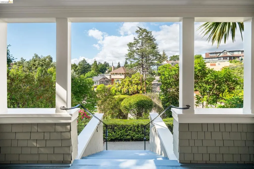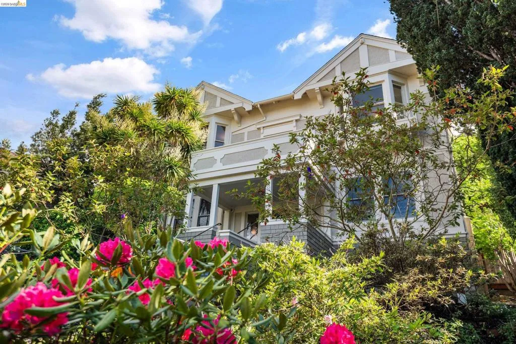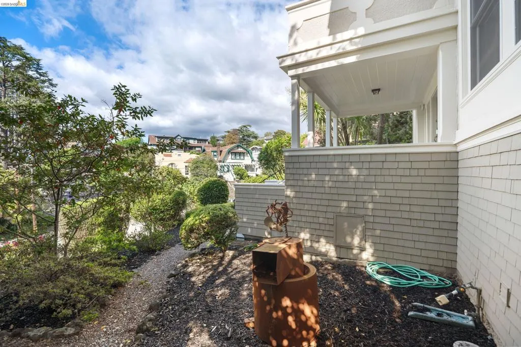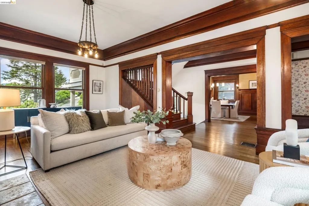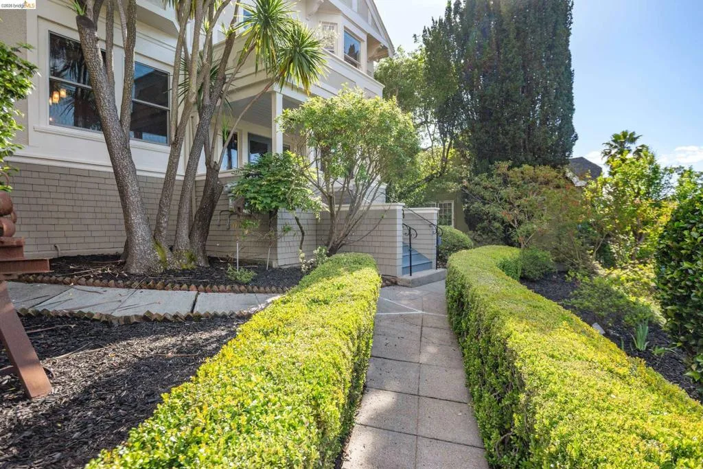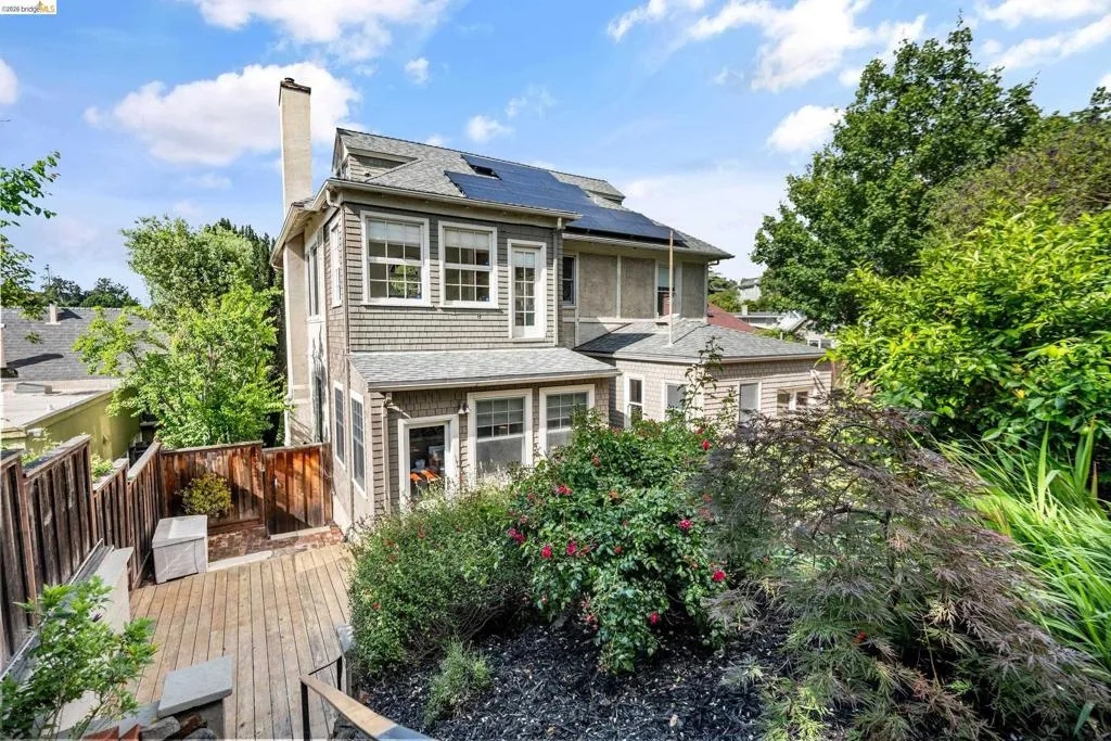 Rooted in the architectural grace of 1907, this distinguished residence at 3756 Balfour rises above the street with quiet majesty on its corner—a long-standing sentinel of the Lakeshore neighborhood. Moments from all that Lakeshore offers, the home blends heritage, scale, and lifestyle in one of Oakland’s most coveted enclaves. The formal living room features rich hardwood floors, a stately fireplace, and classic detailing, while a sunlit veranda opens to a spacious deck—ideal for outdoor dining and entertaining. The formal dining room showcases original pocket doors, a box-beamed ceiling, and built-in cabinetry, flowing into a custom eat-in kitchen with gas range, pantry, and breakfast nook. Terraced gardens provide versatile outdoor space for relaxation, gardening, or play. Upstairs, the primary suite offers a peaceful retreat with ample closet space, en suite bath, and adjoining bonus room suited for an office or nursery. Two additional bedrooms share a full hall bath. A finished attic adds flexible living space, and the basement includes storage, workshop area, and laundry. A rebuilt detached garage, owned solar, and mature landscaping complete this legacy home. With a Walkscore of 81, in a neighborhood celebrated for tree-lined streets, architectural beauty, and proximity to Lake Merritt, this property offers timeless character and room to grow.